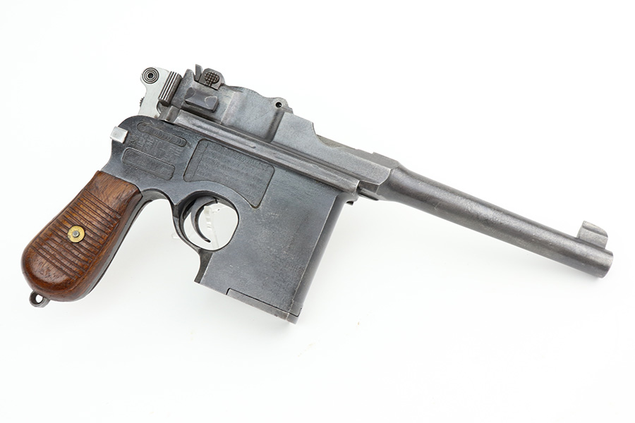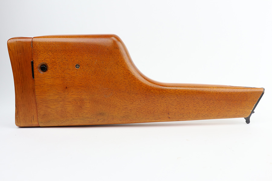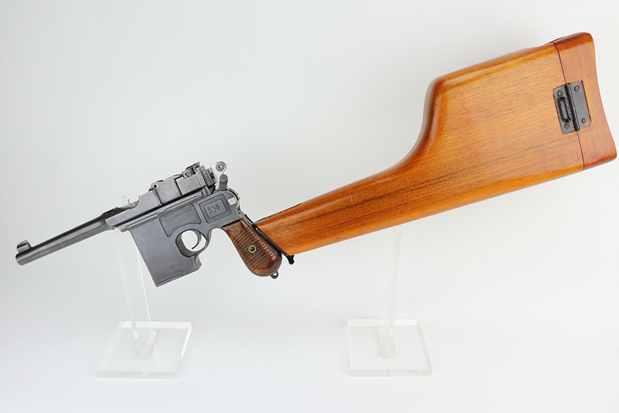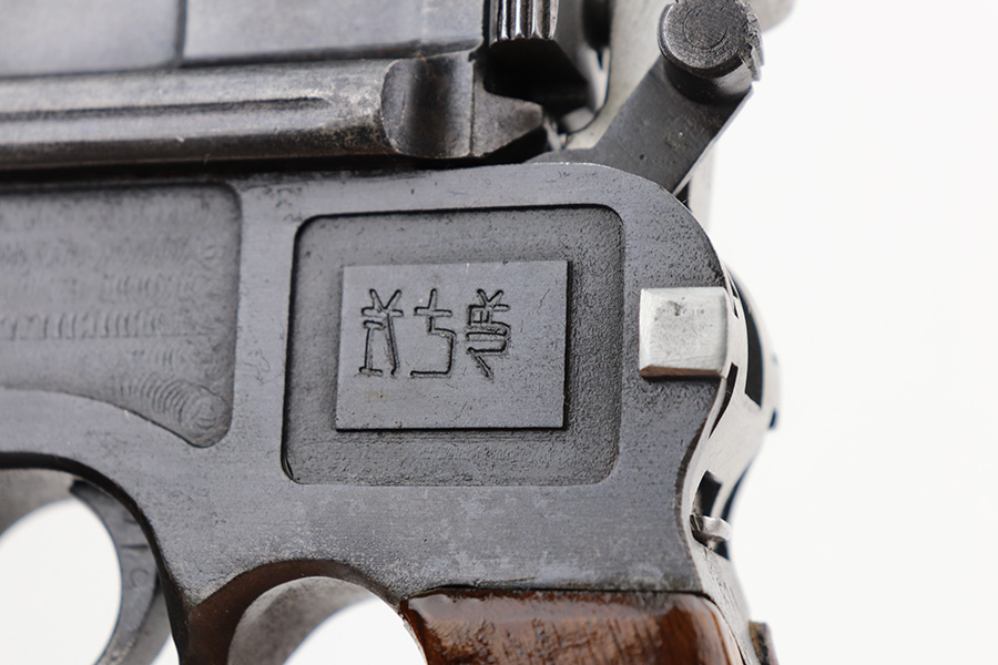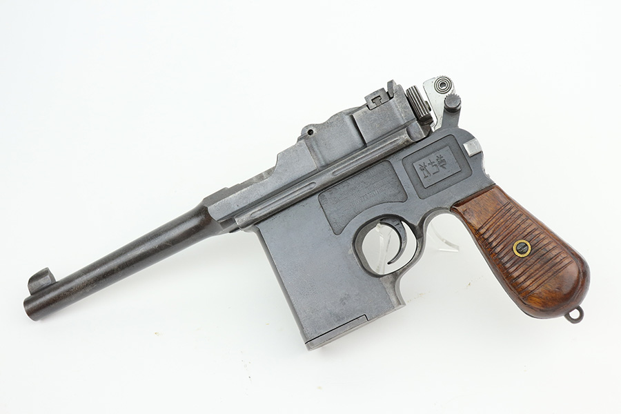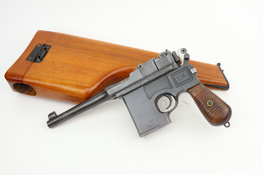 8/17/21 – This is a rare and interesting Shanxi Type 17 rig as produced in the late 1980s as a copy of the ultra rare examples from the 1920s. From Forgotten Weapons, “The best known and most highly valued of the Warlord Era Chinese pistols is undoubtedly the .45 ACP copy of the C96 Mauser. These were made at the Taiyuan Arsenal in Shanxi Province between 1928 and 1931, with more than 8,000 made in total. They were the product of a proper Western-style production line, and Taiyuan Arsenal actually made standard C96 copies in 7.63mm Mauser before scaling up to the .45 ACP version. This change was made because the Arsenal was also making Thompson submachine guns, and it made sense to have caliber compatibility with their C96-style pistols. The result was a truly massive hand cannon, holding 10 rounds of ammunition in its fixed magazine, and fitted with an equally large combination shoulder stock and holster.” This particular gun shows minor thinning to the finish throughout, with most of the wear along the barrel. Matching numbers throughout, including barrel, frame, trigger, hammer, etc. Strong, shiny bore. Comes with an unmarked stock, also a reproduction.