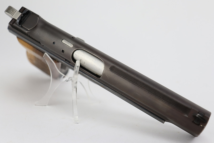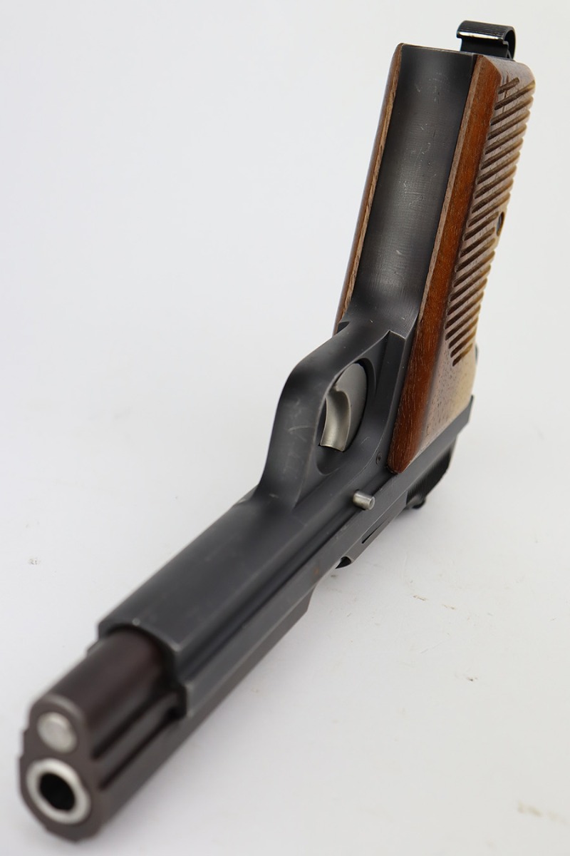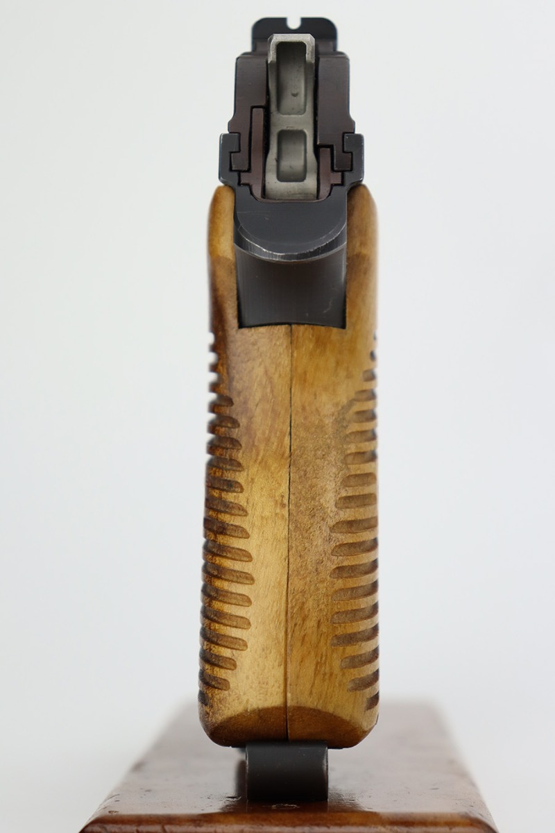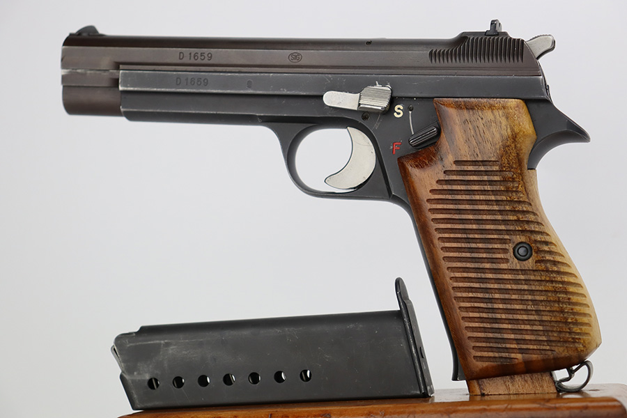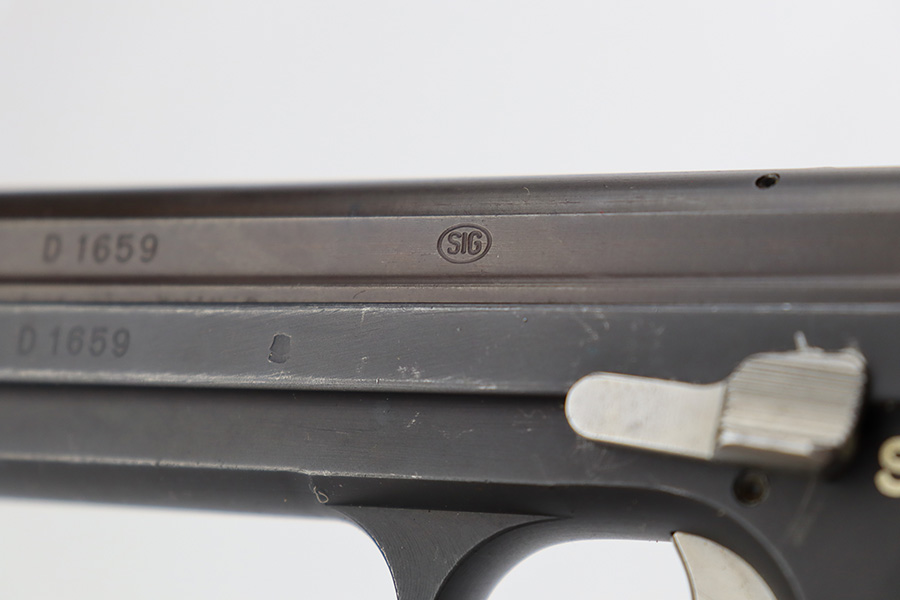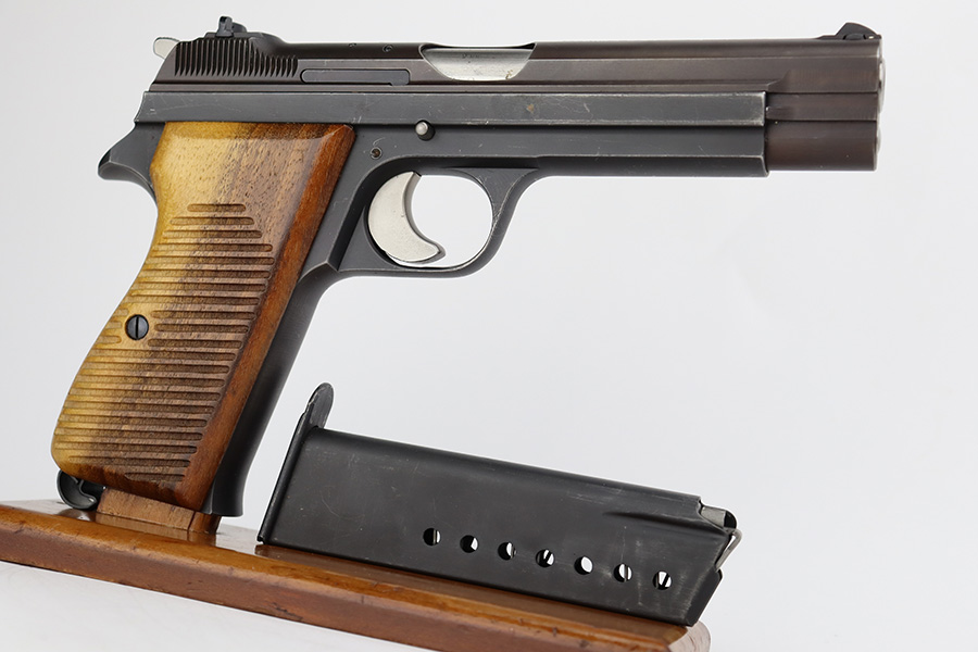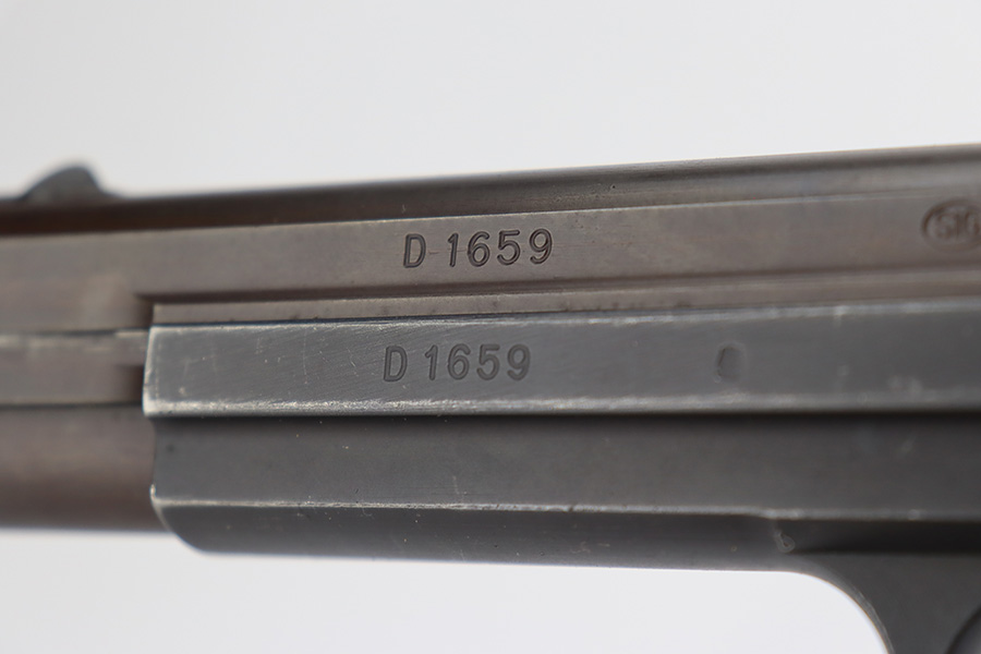 7/7/23 – This is an excellent example of a rare SIG P210 that was one of only 6,500 produced and issued to the Bundesgrenzschutz, or West German Federal Border Guard. Made in 1951, this contract is easily identified by the D-prefix in the serial number. The pistol is matching with about 97+% of the original finish remaining, showing only minor high edge wear around the muzzle and right side rail. Minty wood grips with just a couple of minor surface scratches. Strong, shiny bore and smooth mechanics.