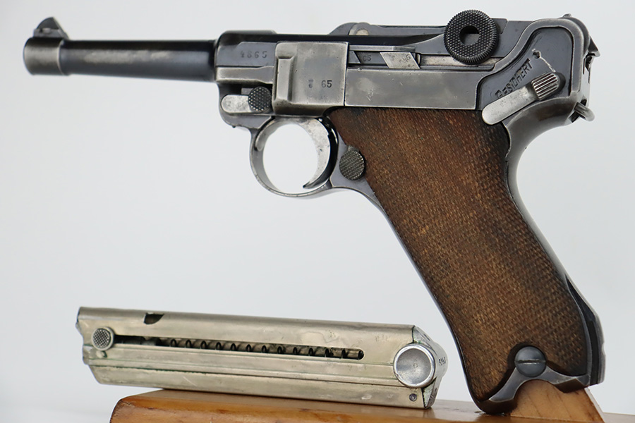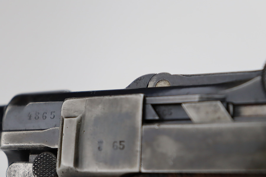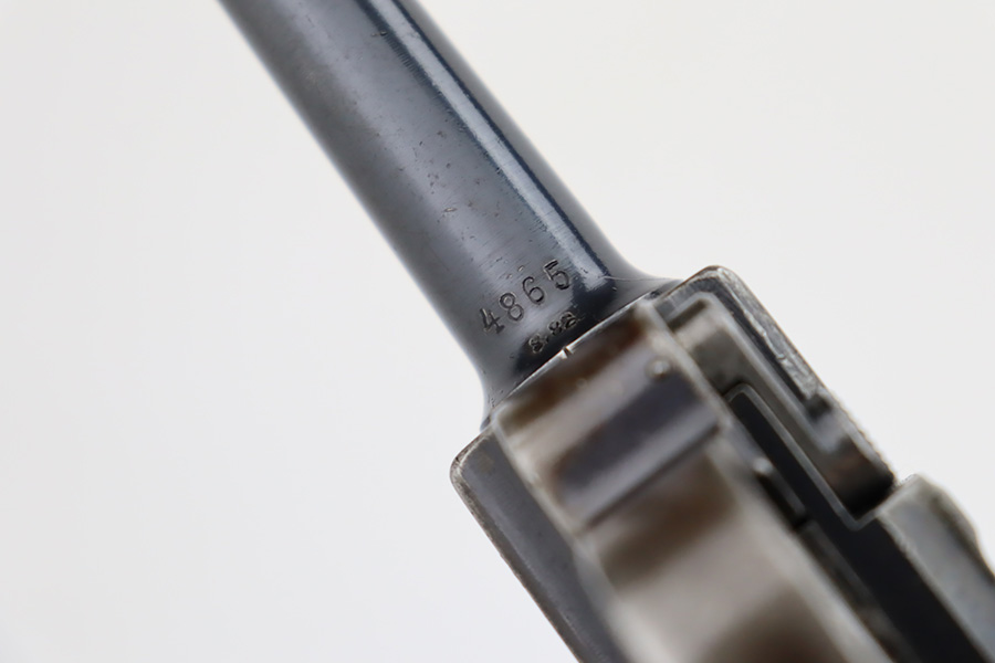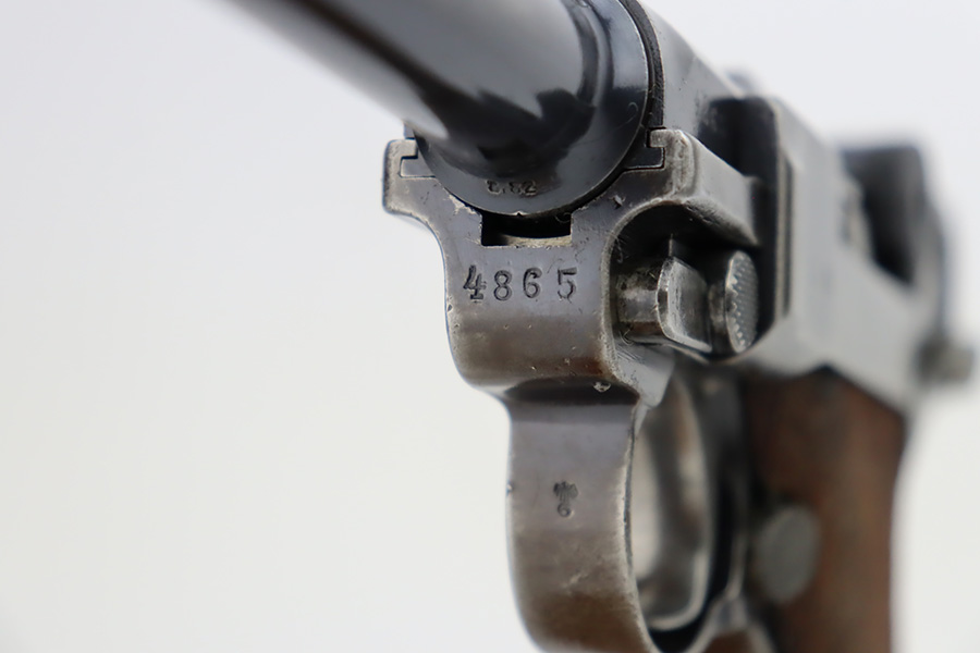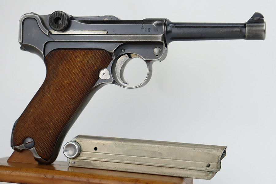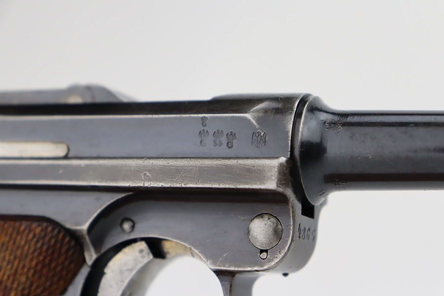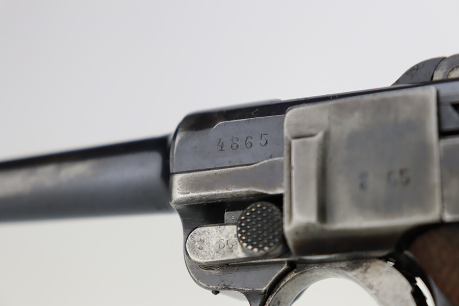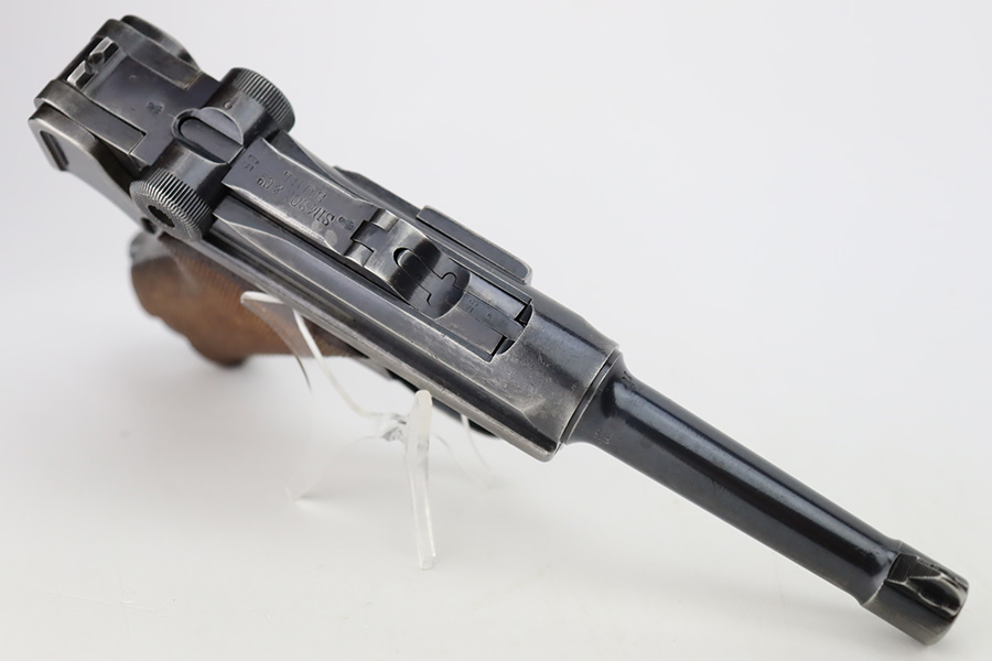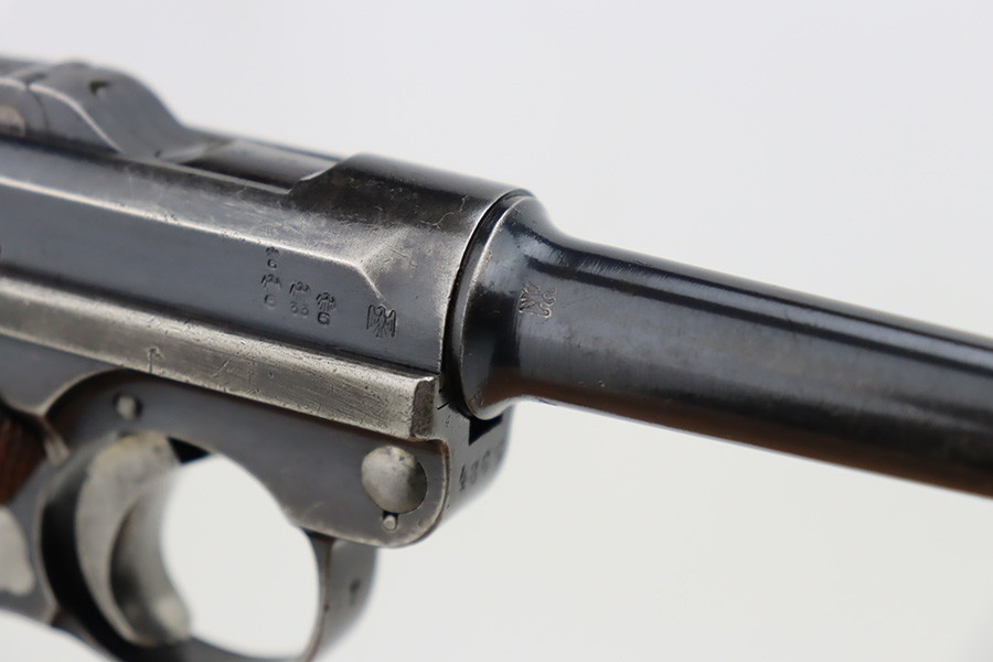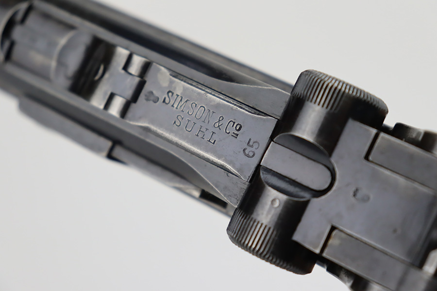 10/4/23 – This is a rare Simson Luger, manufactured in the 1920’s. It is all matching and has the proper “Eagle 6” Simson proofs throughout. Replaced grip screws. The bluing rates roughly 40% with obvious finish loss and wear throughout. Fitted with excellent but mismatched wood grips. Comes with a mismatched but correct Simson magazine. The rifling in the bore is worn with pitting throughout.