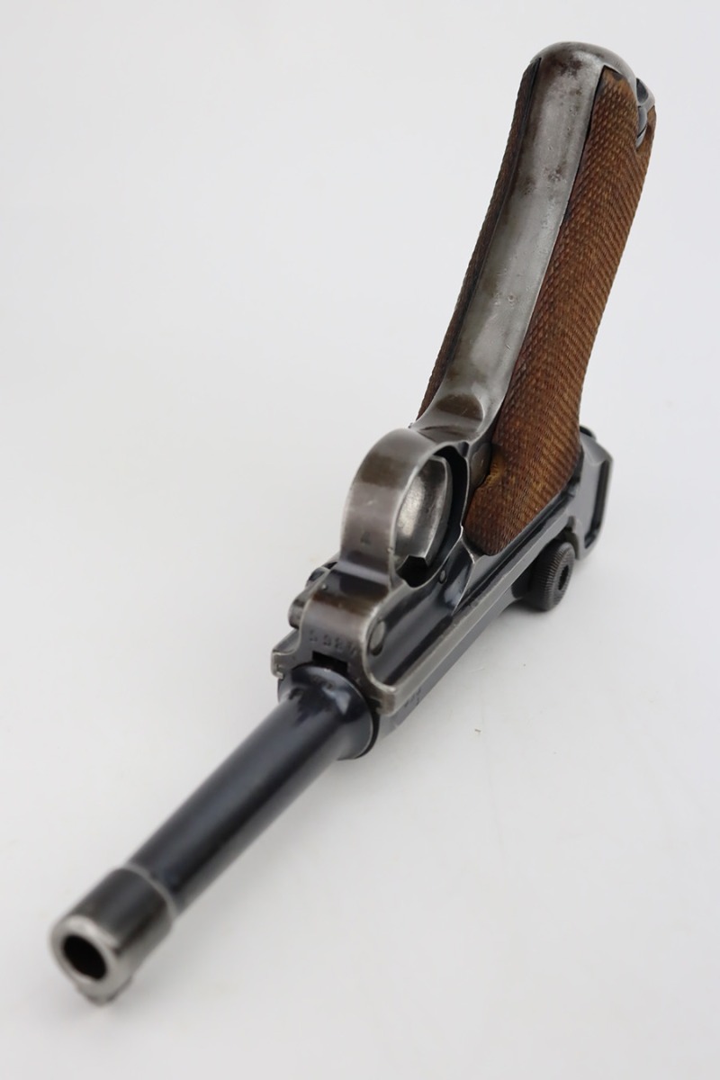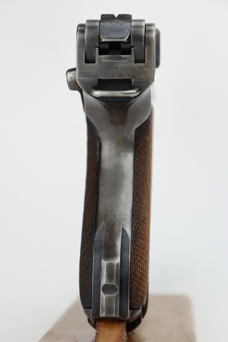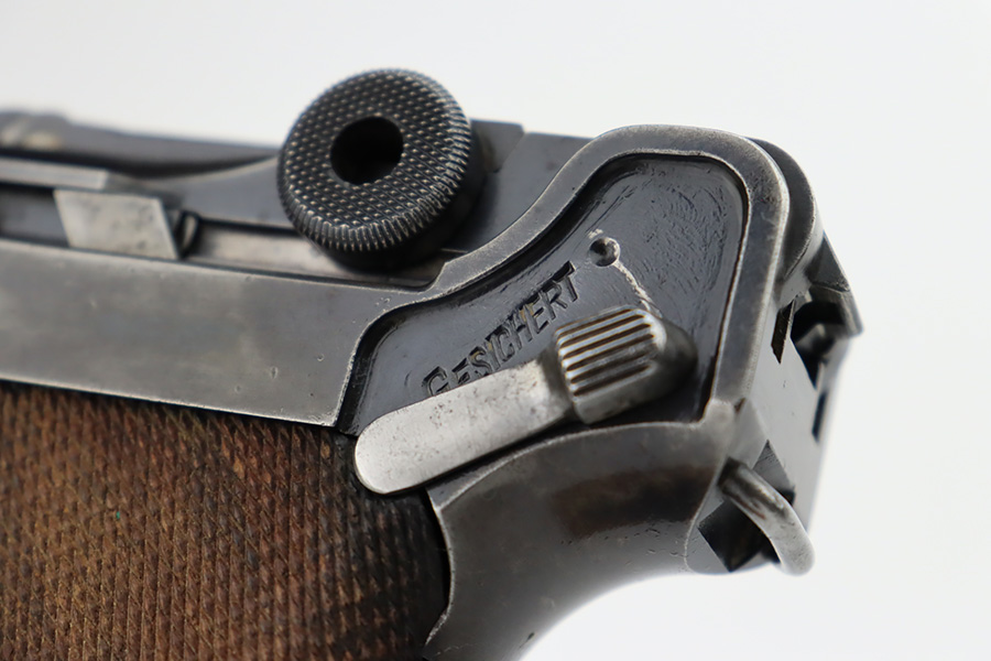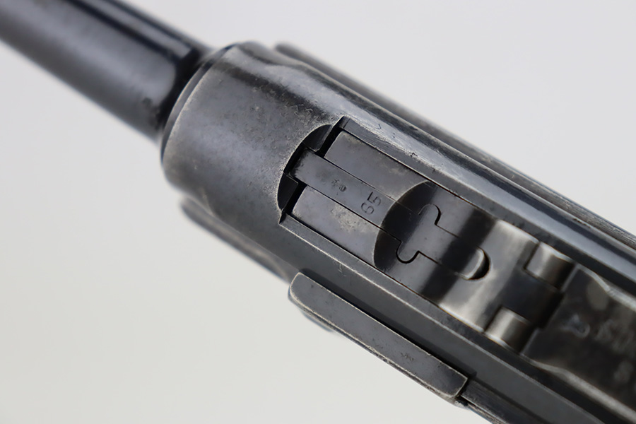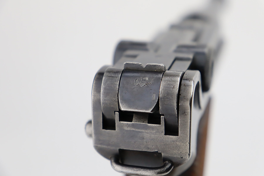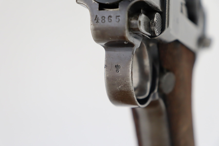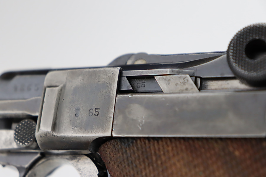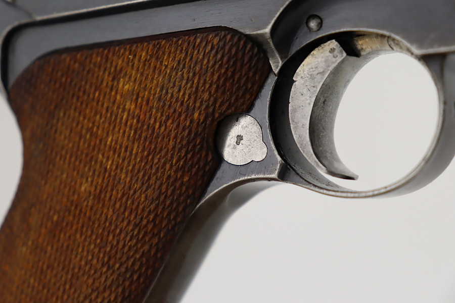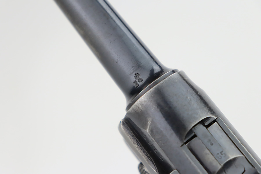 10/4/23 – This is a rare Simson Luger, manufactured in the 1920’s. It is all matching and has the proper “Eagle 6” Simson proofs throughout. Replaced grip screws. The bluing rates roughly 40% with obvious finish loss and wear throughout. Fitted with excellent but mismatched wood grips. Comes with a mismatched but correct Simson magazine. The rifling in the bore is worn with pitting throughout.