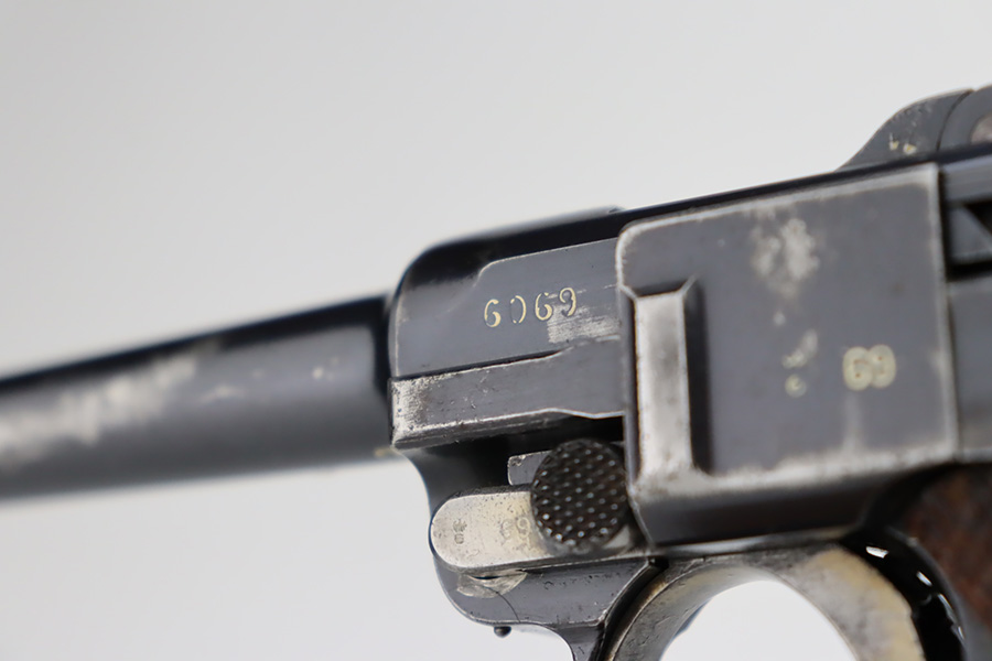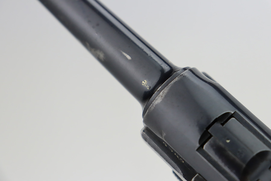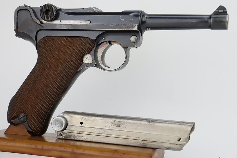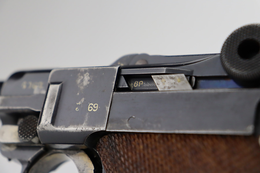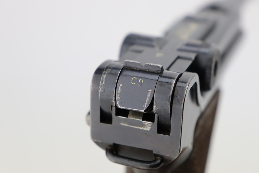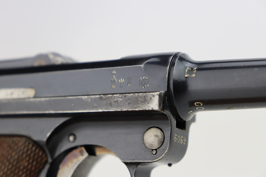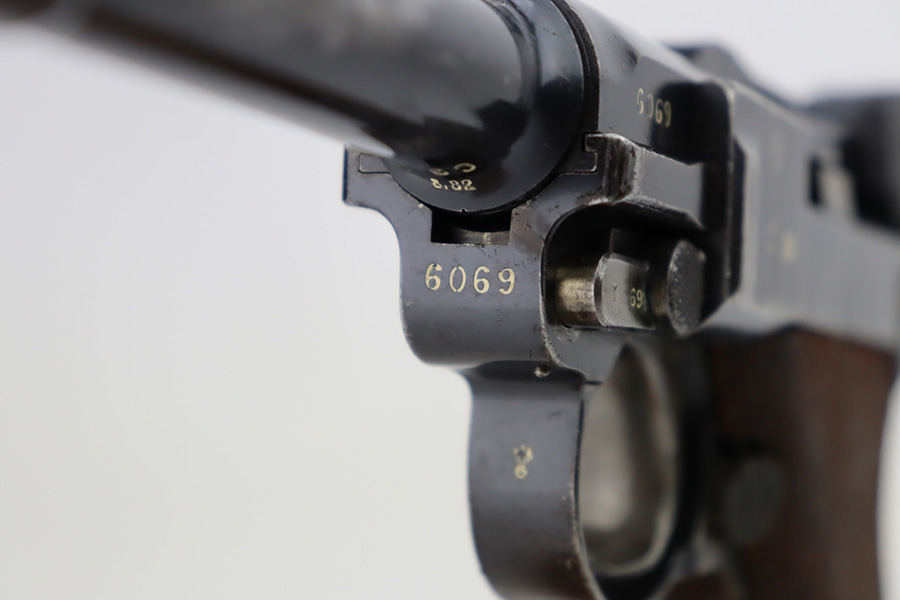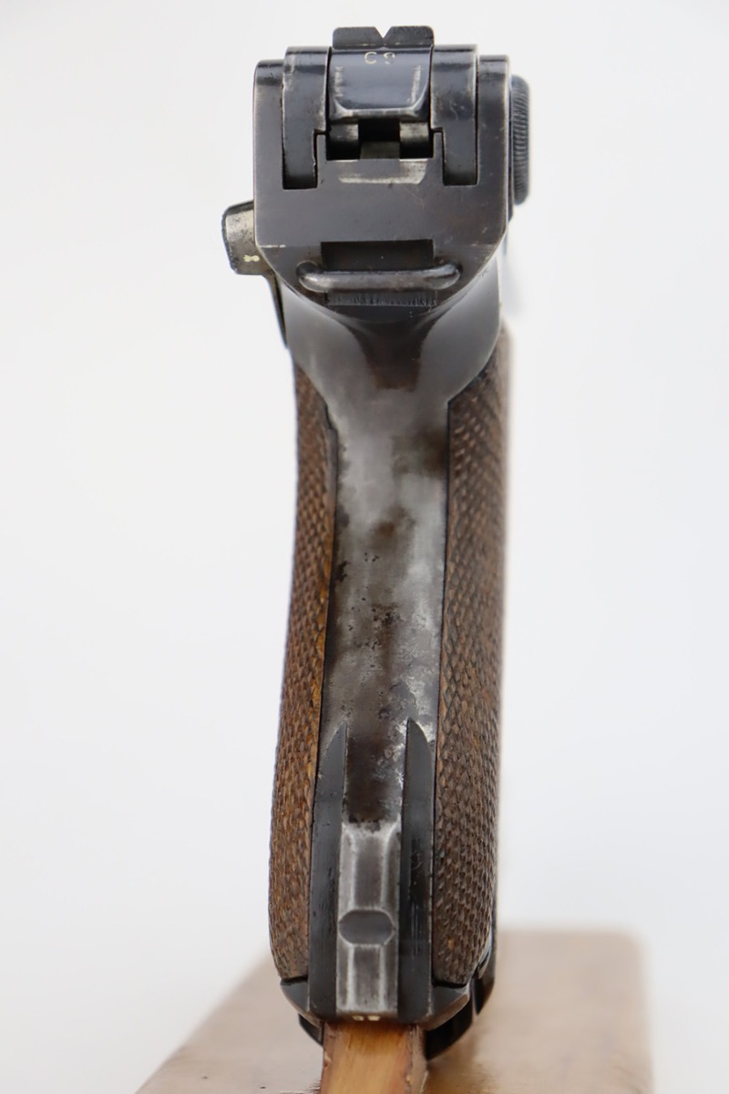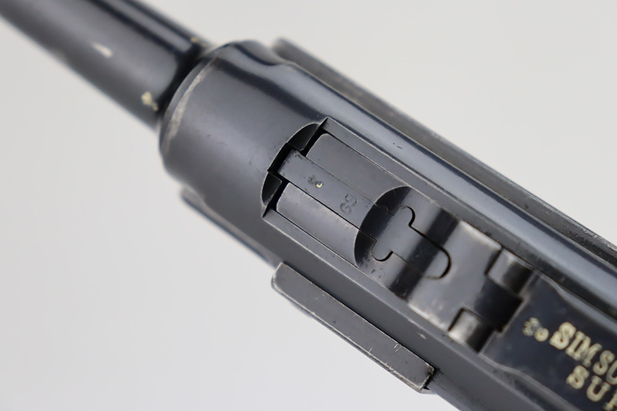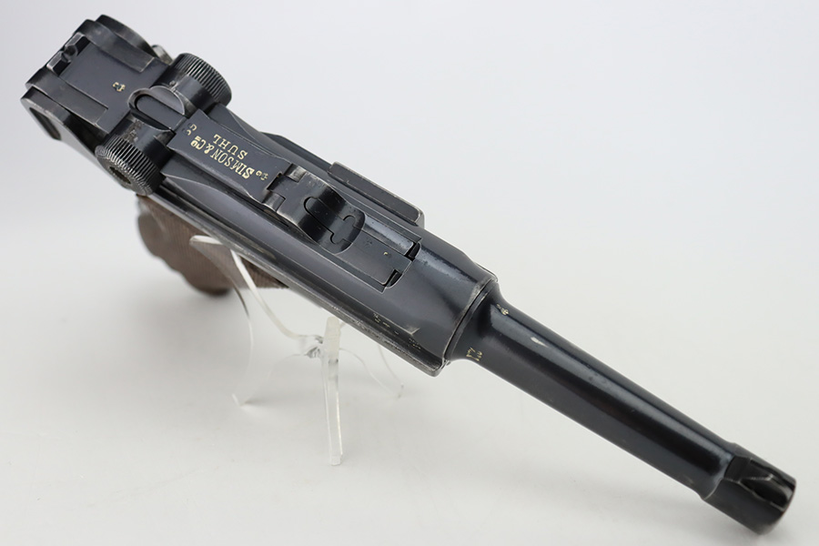 10/4/23 – This is a rare Simson Luger, manufactured in the 1920’s. It is all matching and has the proper “Eagle 6” Simson proofs throughout There is an “A.S.434.” unit marking on the front strap, indicating it was issued to the Artillery School. There are initials “CKR” lightly stamped into the left side of the frame. The bluing rates roughly 60% with obvious spotty wear and splotchy discoloration throughout, concentrated mostly on the left side of the gun and on the grip straps. Some small pits on the grip straps as well. Fitted with excellent but mismatched wood grips. Comes with a mismatched but correct Simson magazine. The rifling in the bore is worn with pitting throughout. Fitted with excellent but mismatched wood grips. Comes with an authentic Simson magazine that was re-numbered later – not matching. The rifling in the bore is worn with minor pitting throughout.