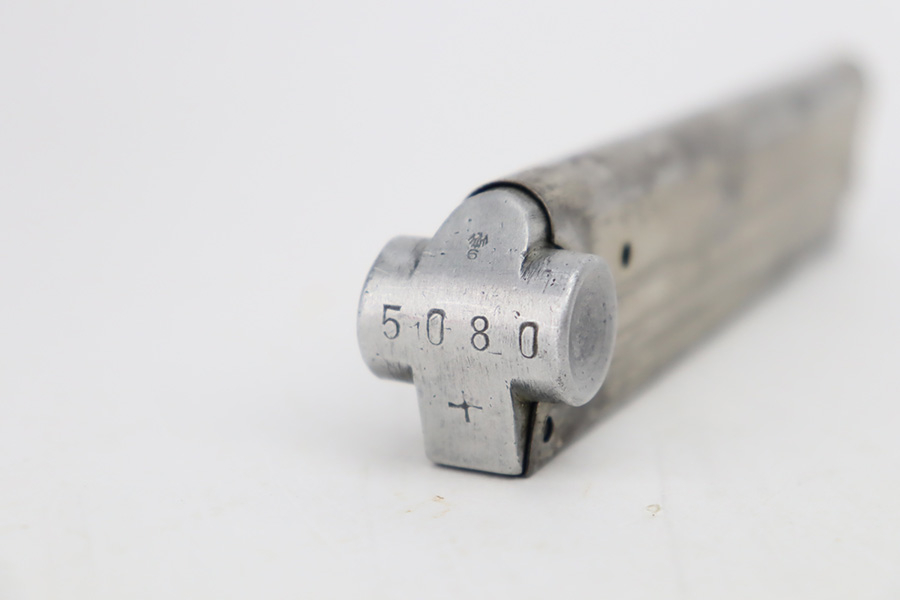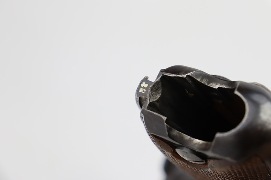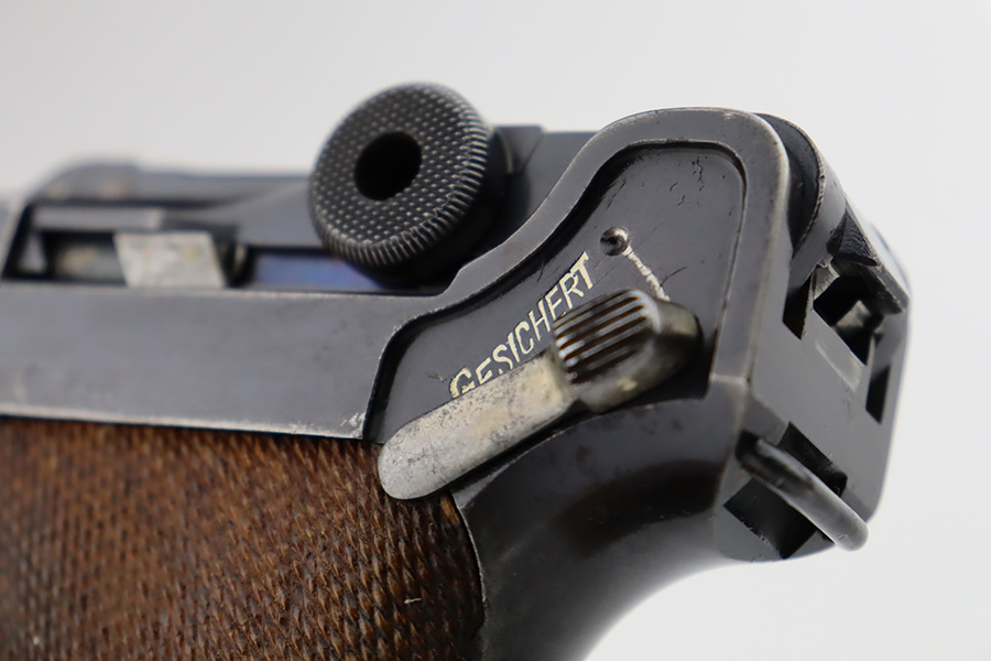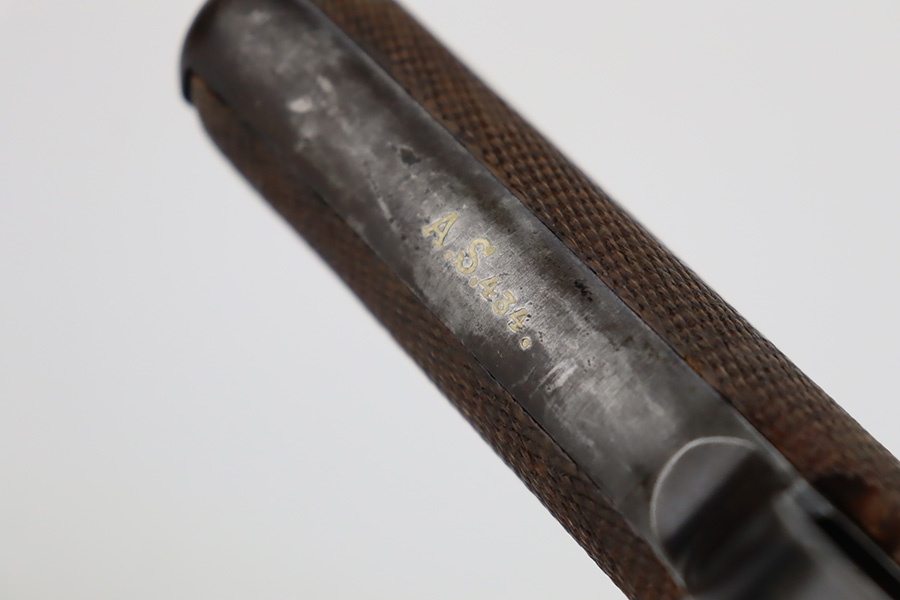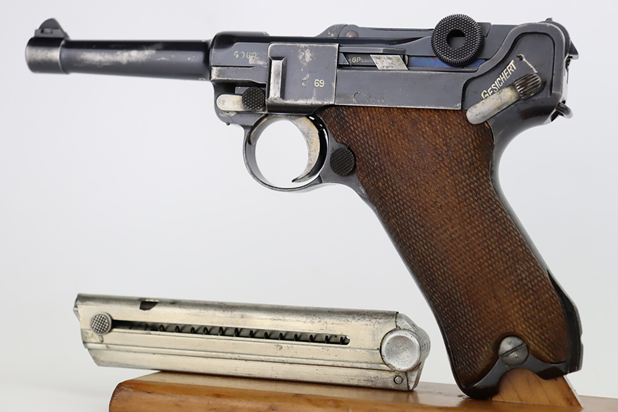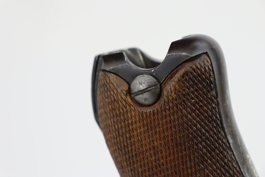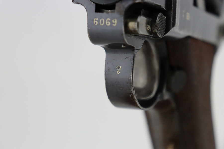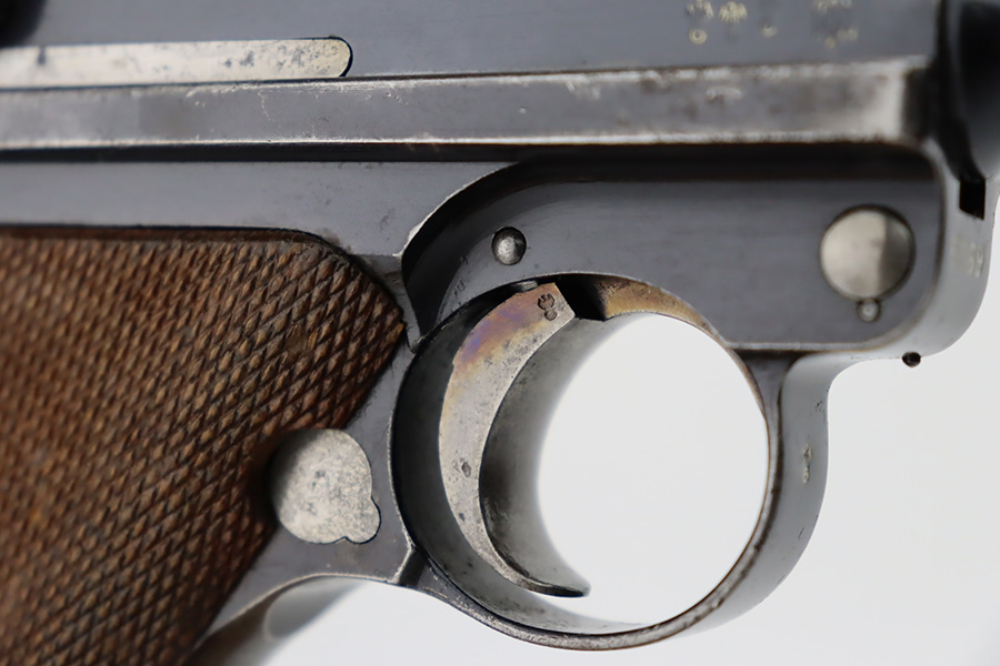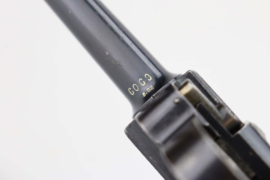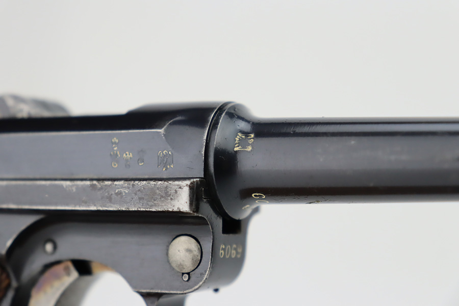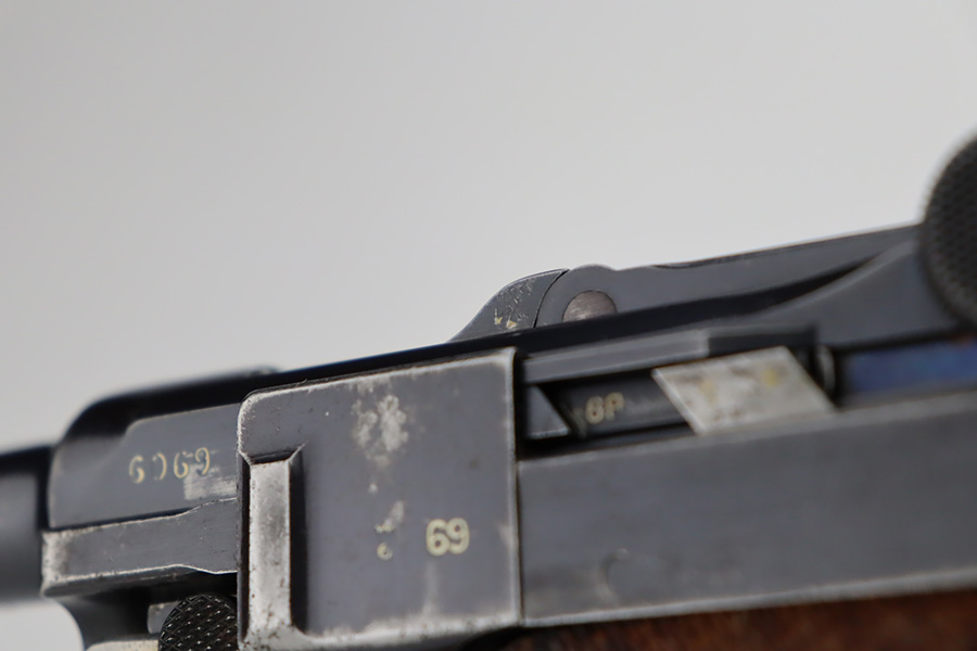 10/4/23 – This is a rare Simson Luger, manufactured in the 1920’s. It is all matching and has the proper “Eagle 6” Simson proofs throughout There is an “A.S.434.” unit marking on the front strap, indicating it was issued to the Artillery School. There are initials “CKR” lightly stamped into the left side of the frame. The bluing rates roughly 60% with obvious spotty wear and splotchy discoloration throughout, concentrated mostly on the left side of the gun and on the grip straps. Some small pits on the grip straps as well. Fitted with excellent but mismatched wood grips. Comes with a mismatched but correct Simson magazine. The rifling in the bore is worn with pitting throughout. Fitted with excellent but mismatched wood grips. Comes with an authentic Simson magazine that was re-numbered later – not matching. The rifling in the bore is worn with minor pitting throughout.