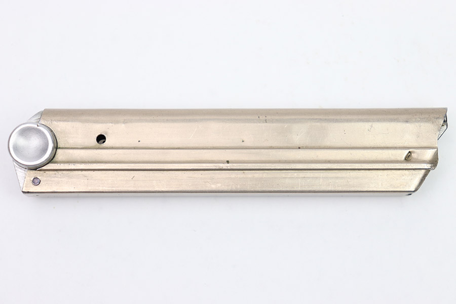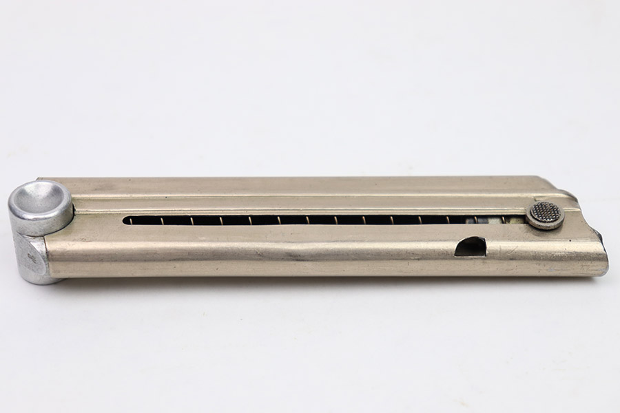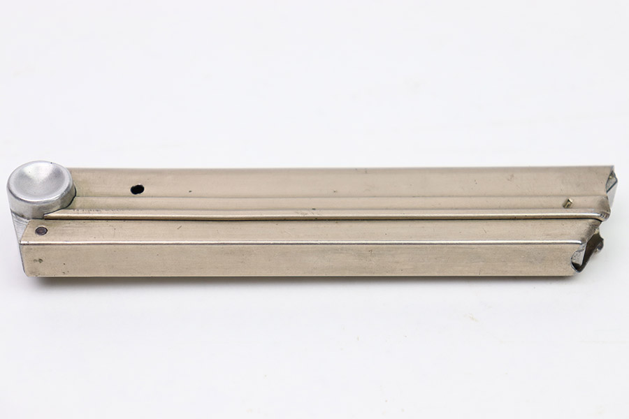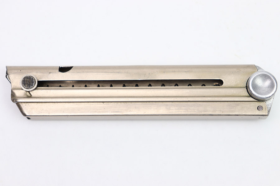 10/31/22 – This is an excellent example of an original Simson Luger magazine from the pre-WW2 / 1930s. The nickeled tube has retained a majority of its finish with only minor signs of use/handling wear. The magazine bottom is is in excellent condition with minimal handling wear. The bottom is serial numbered “5221” and has two eagle 6 proof marks. The bottom of the magazine’s spine also features an eagle 6 proof mark. The follower is in excellent condition. The spring is strong and functional.