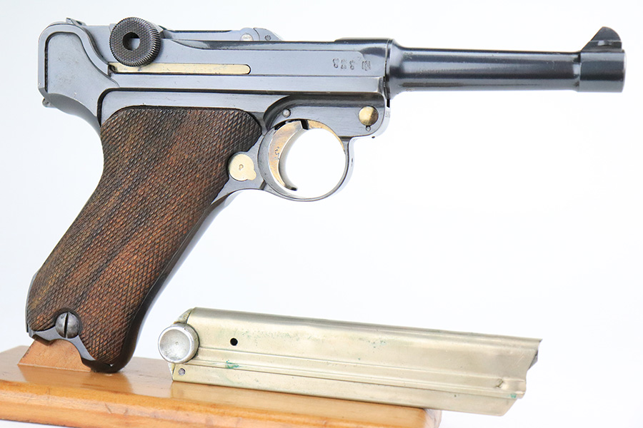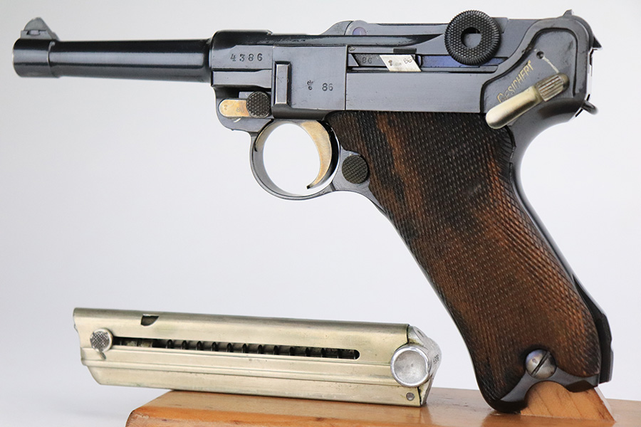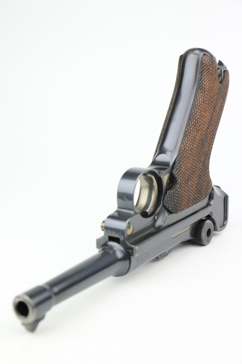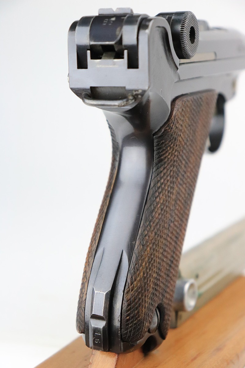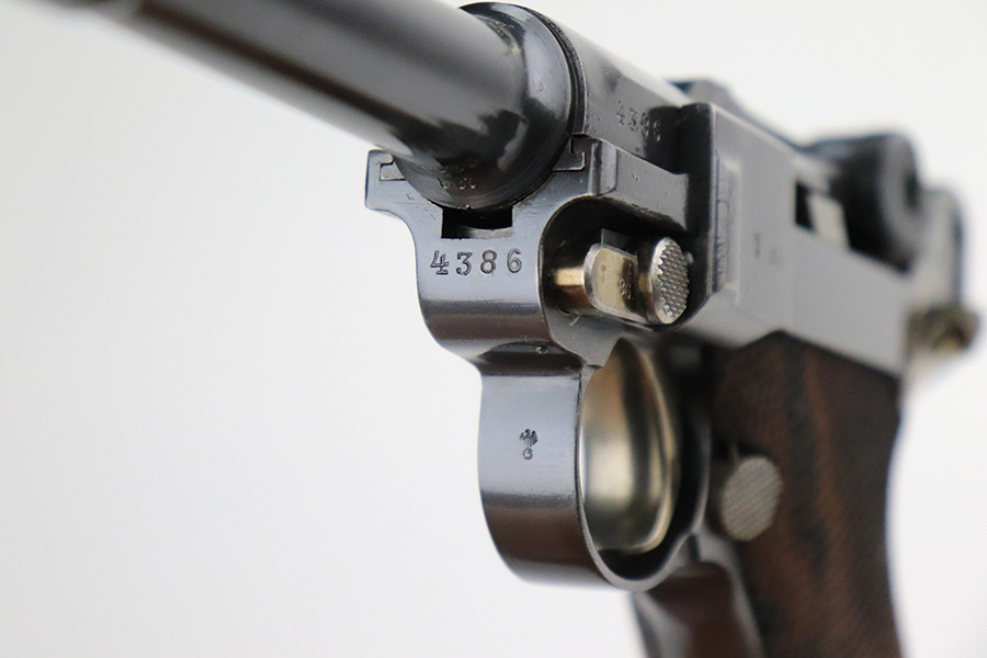 7/22/22 – This is a rare Simson Luger, manufactured in the 1920’s. It is all matching and has the proper “Eagle 6” Simson proofs throughout, even on the screws and on the magazine bottom. The magazine is matching to the gun. The whole gun has been professionally restored and re-blued, so it has a really nice fit and finish overall. Very little sign of wear or use. Comes with excellent wood grips – the left panel is matching (has some dark discoloration), the right is mismatched. Very nice bore with great rifling.