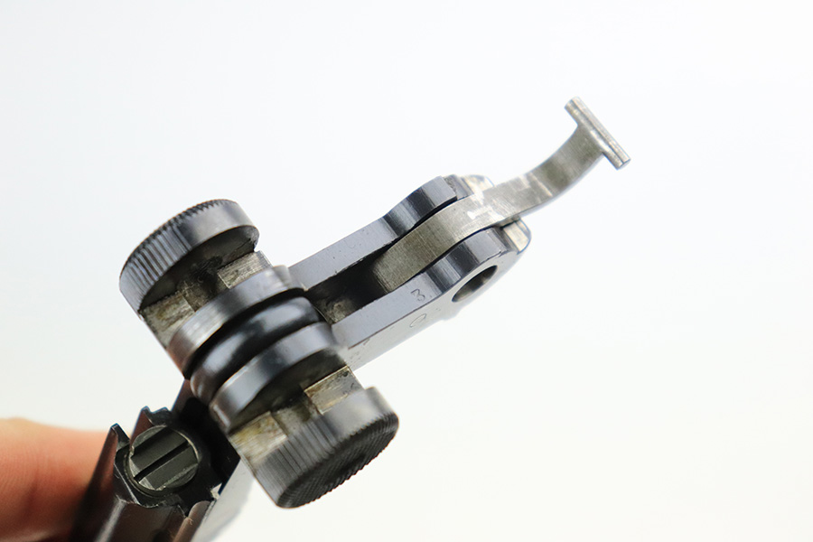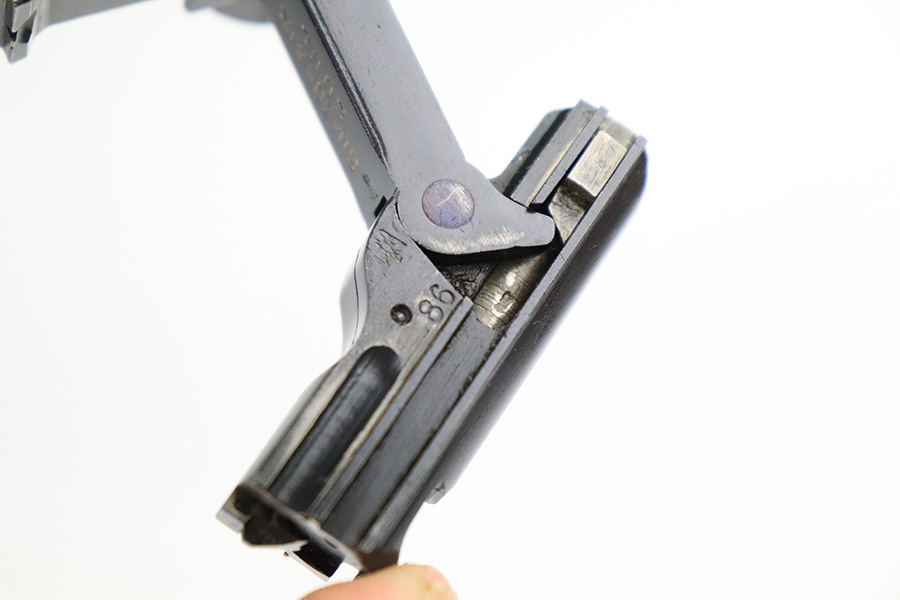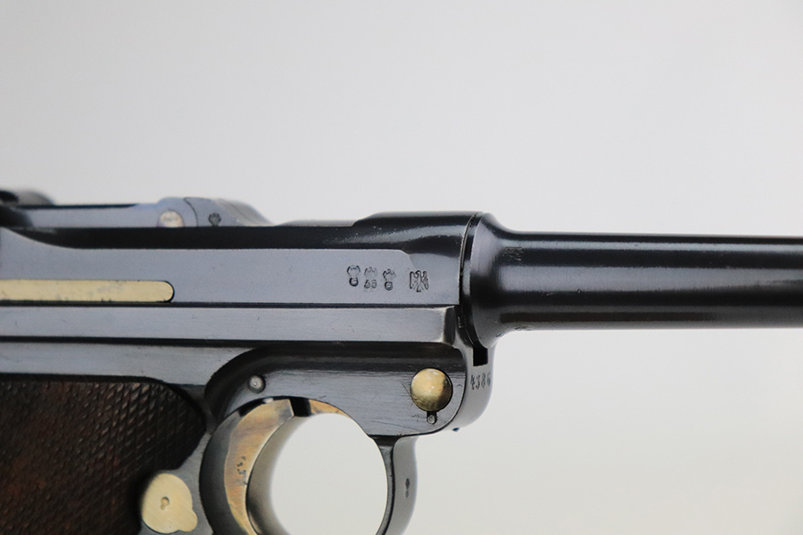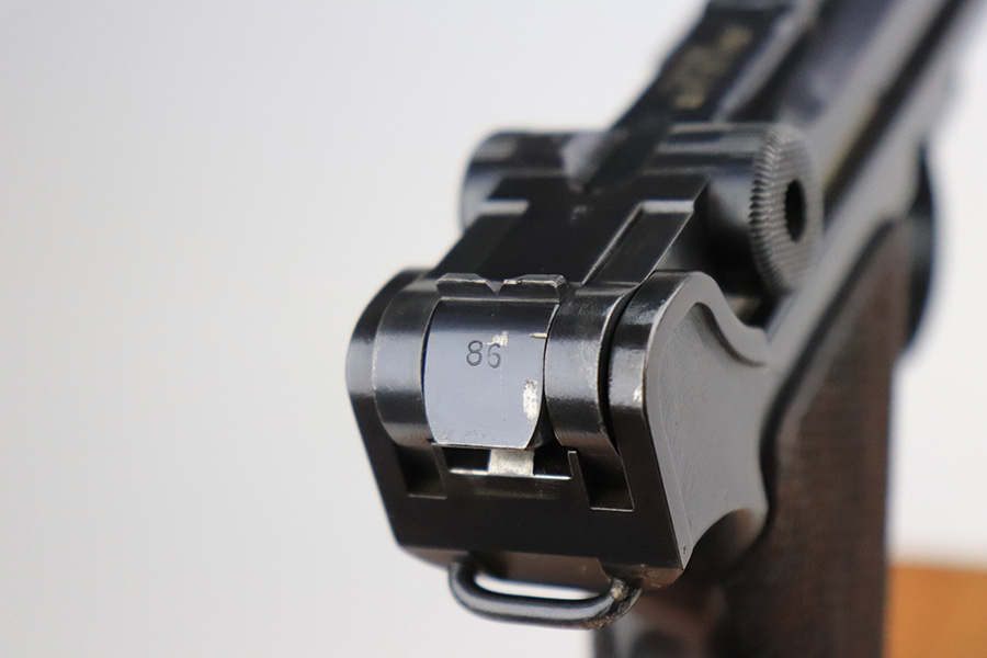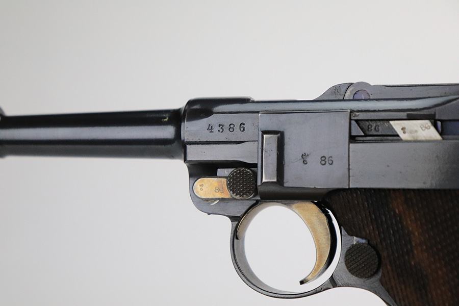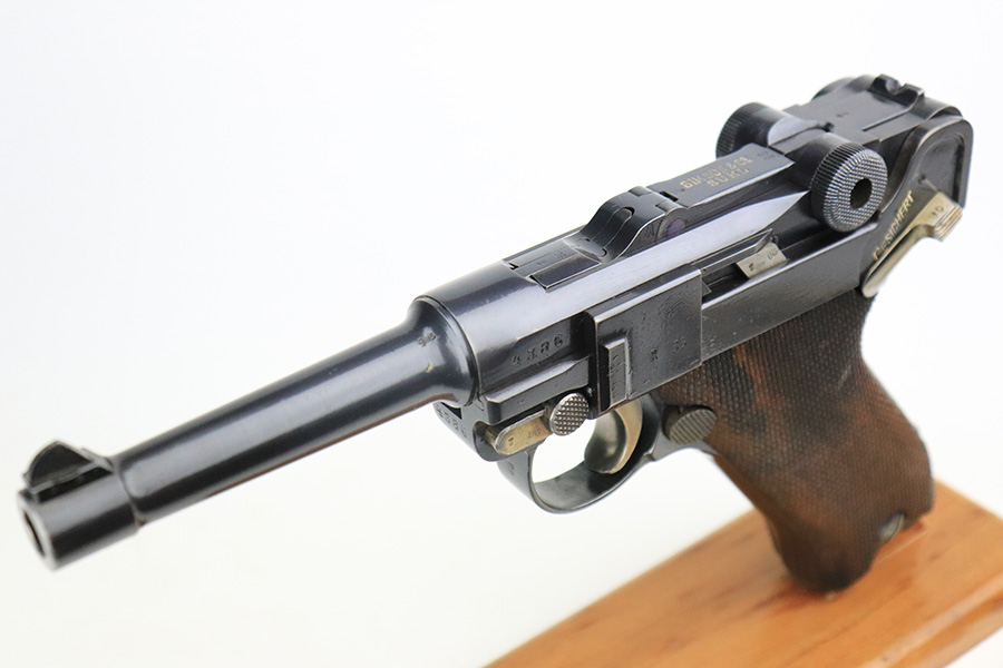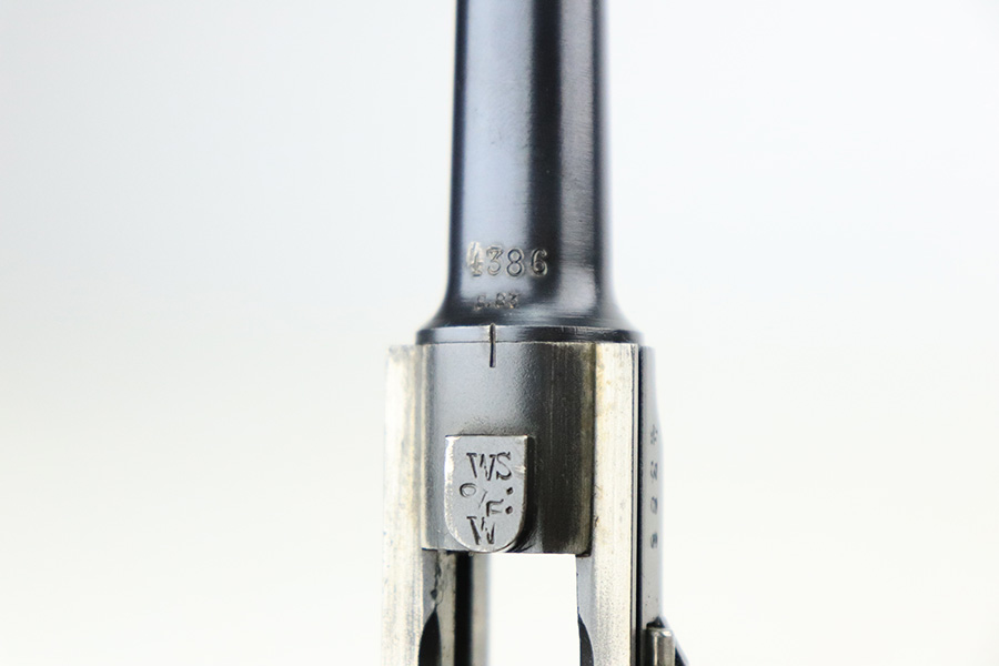 7/22/22 – This is a rare Simson Luger, manufactured in the 1920’s. It is all matching and has the proper “Eagle 6” Simson proofs throughout, even on the screws and on the magazine bottom. The magazine is matching to the gun. The whole gun has been professionally restored and re-blued, so it has a really nice fit and finish overall. Very little sign of wear or use. Comes with excellent wood grips – the left panel is matching (has some dark discoloration), the right is mismatched. Very nice bore with great rifling.