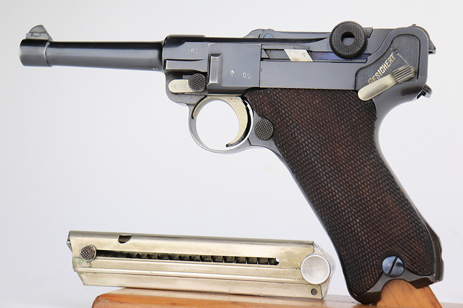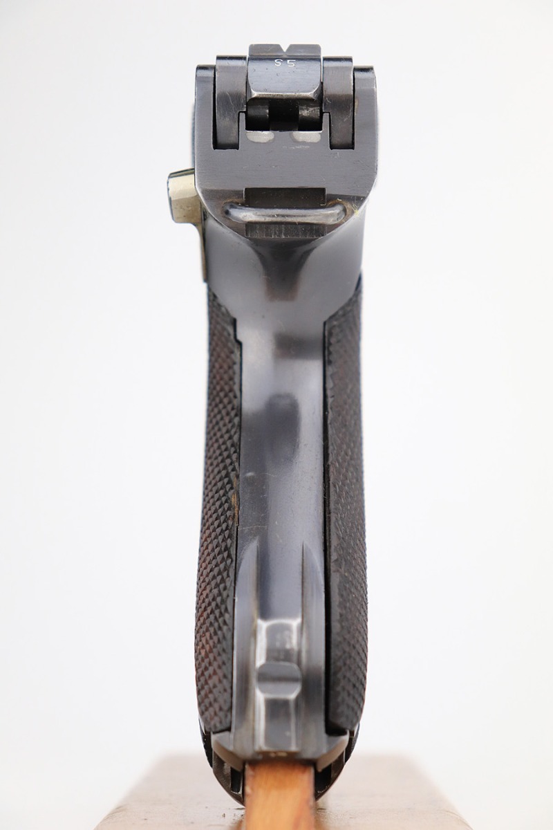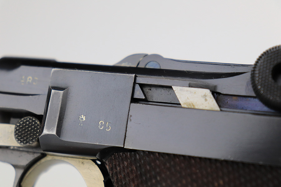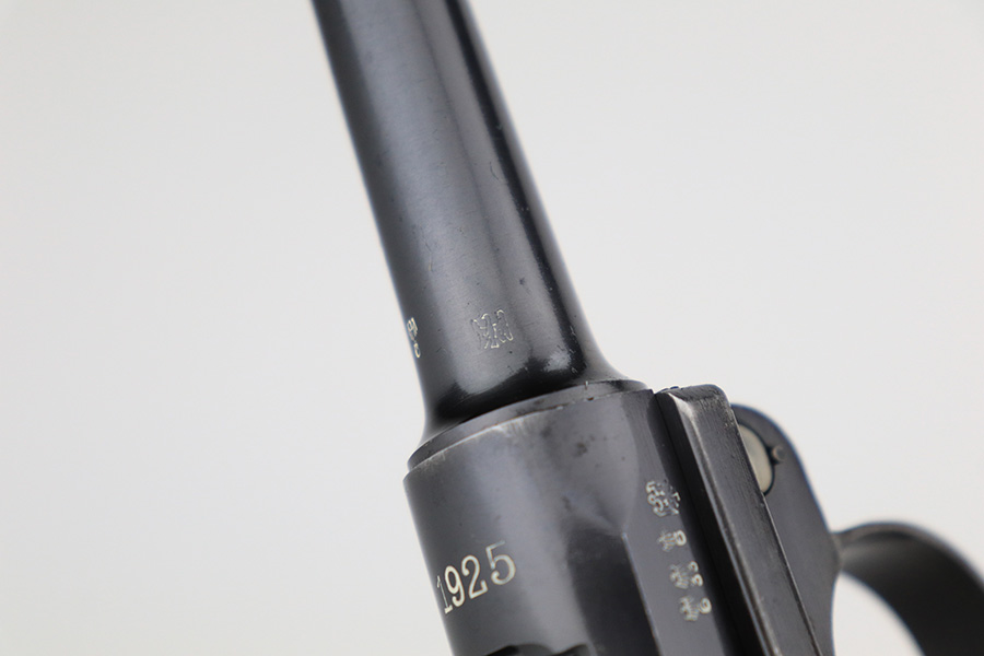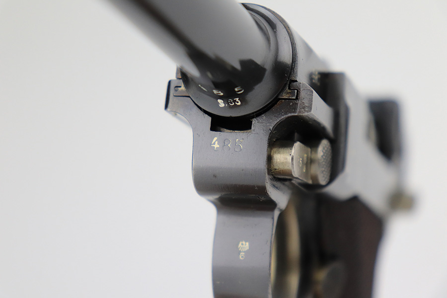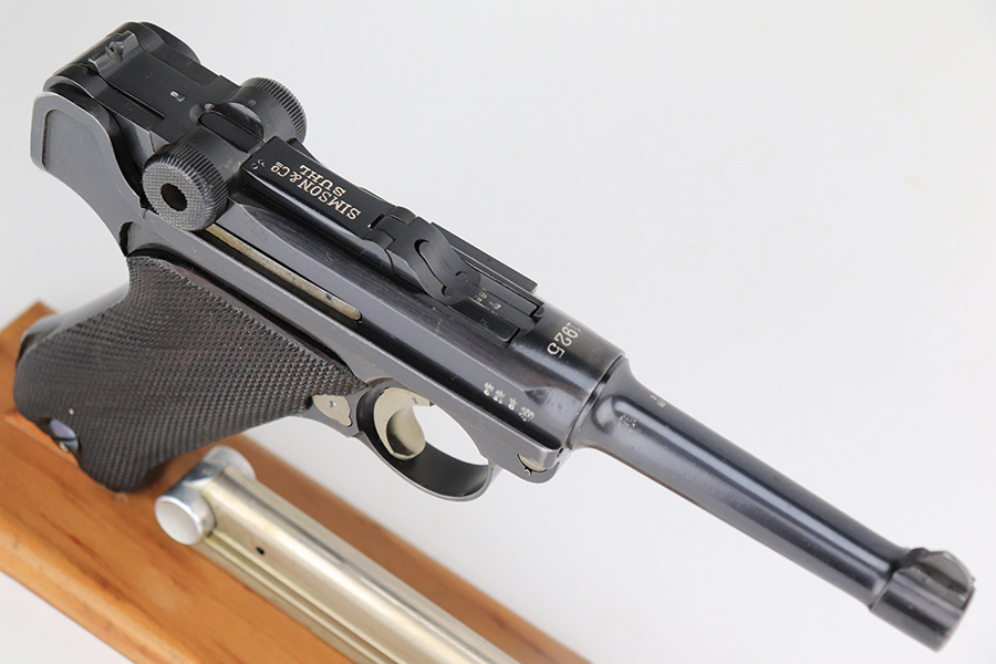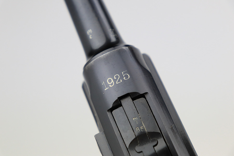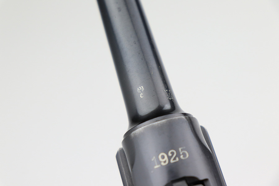 6/15/23 – This is a rare Simson Luger, manufactured in 1925. It is all matching and has the proper “Eagle 6” Simson proofs throughout, even on the screws. The whole gun has been professionally restored and re-blued, so the finish is really nice for the most part. There is just some light spotty wear on the front strap. Fitted with minty mismatched but “Eagle 6” proofed wood grips. Comes with one original matching-numbered magazine. The rifling in the bore is a bit worn with pin-pricking throughout.
