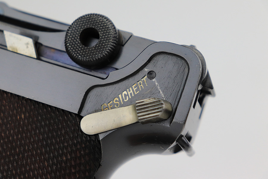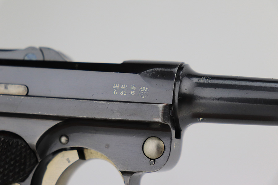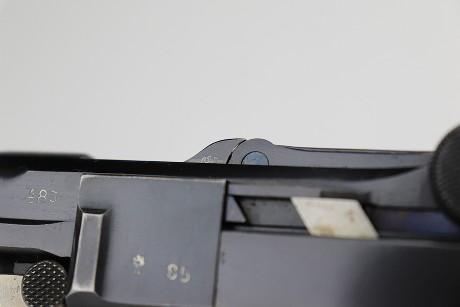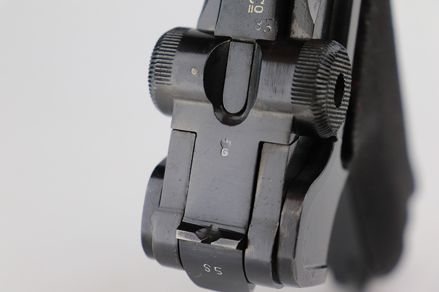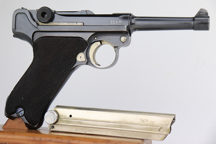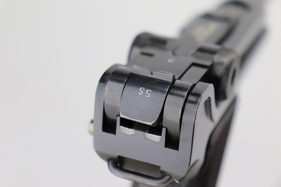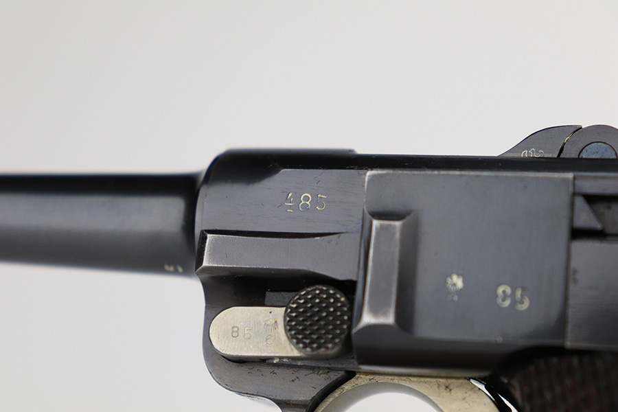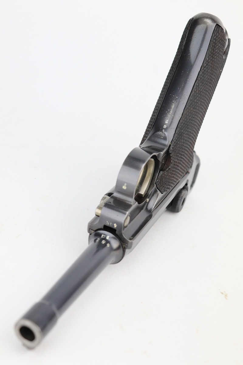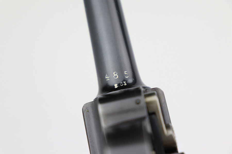 6/15/23 – This is a rare Simson Luger, manufactured in 1925. It is all matching and has the proper “Eagle 6” Simson proofs throughout, even on the screws. The whole gun has been professionally restored and re-blued, so the finish is really nice for the most part. There is just some light spotty wear on the front strap. Fitted with minty mismatched but “Eagle 6” proofed wood grips. Comes with one original matching-numbered magazine. The rifling in the bore is a bit worn with pin-pricking throughout.
