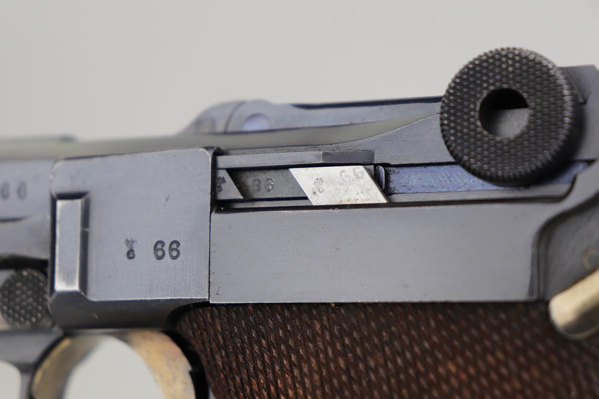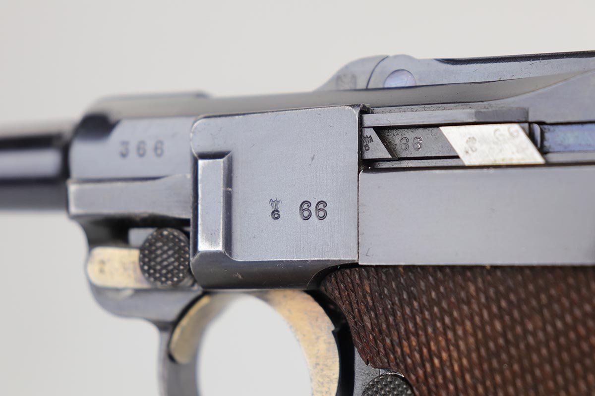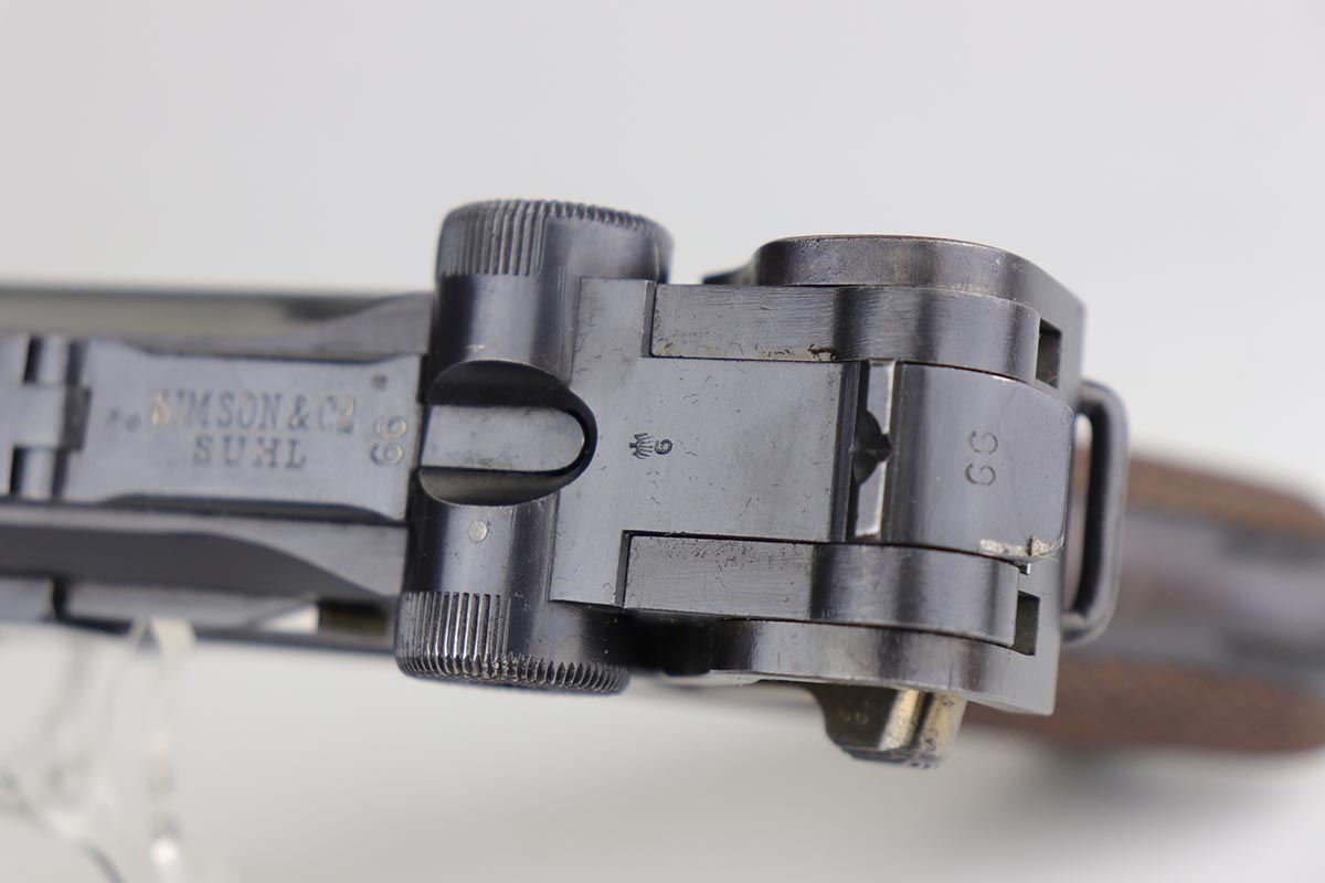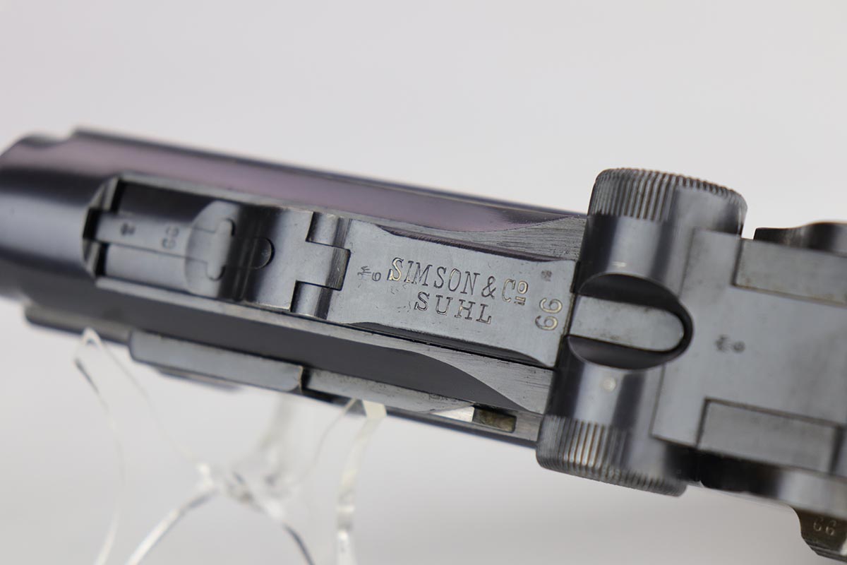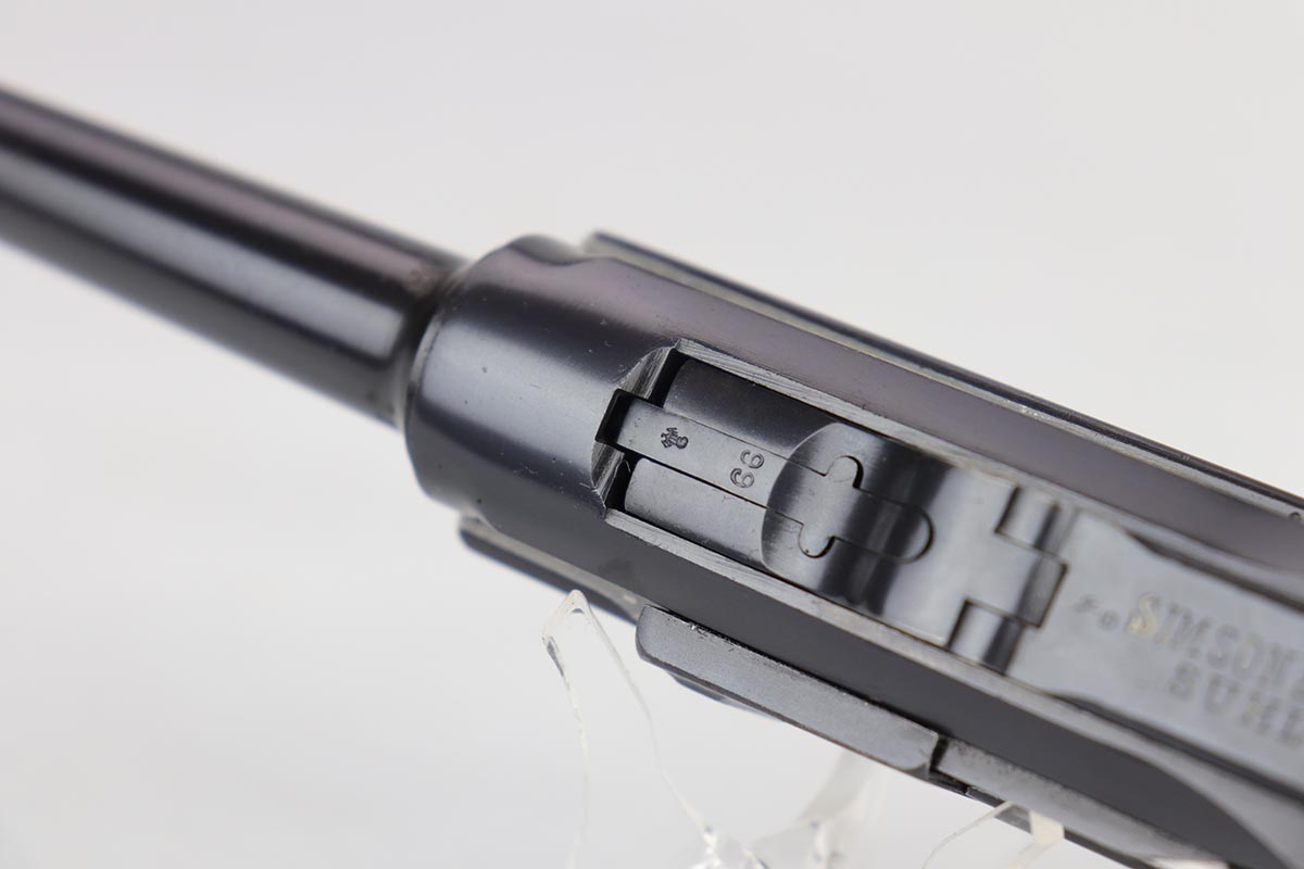 3/6/20 – This is a scarce Simson Luger made in the Weimar period in Germany, between the wars. Simson started manufacturing lugers in 1925 using equipment from the old Erfurt arsenal. Production was very low as the German army was limited in size and equipment following the Treaty of Versailles. Simson & Co. was the only company authorized to produce lugers for the German army during this time but then the company was nationalized by the Nazis in 1933. So total production from 1925 -1933 was very limited – even more rare than the Krieghoff lugers. Only about 12,000 ever produced. This gun is all matching and all parts are correctly stamped with the Simson Eagle/6 proof mark, including the screws. The magazine is numbered to a different gun, but is only off by a couple hundred serials and is an original, scarce Simson magazine. This gun was likely made 1931-32. The original finish is about 90+% with nice straw colored small parts. There is some finish loss on the barrel, and a decent amount of patina on the straps. Fantastic grips with the full serial of the pistol inside. Excellent bore.