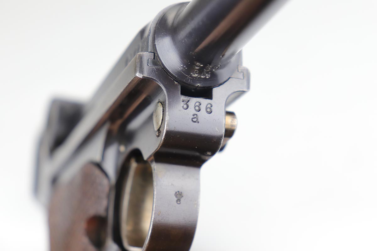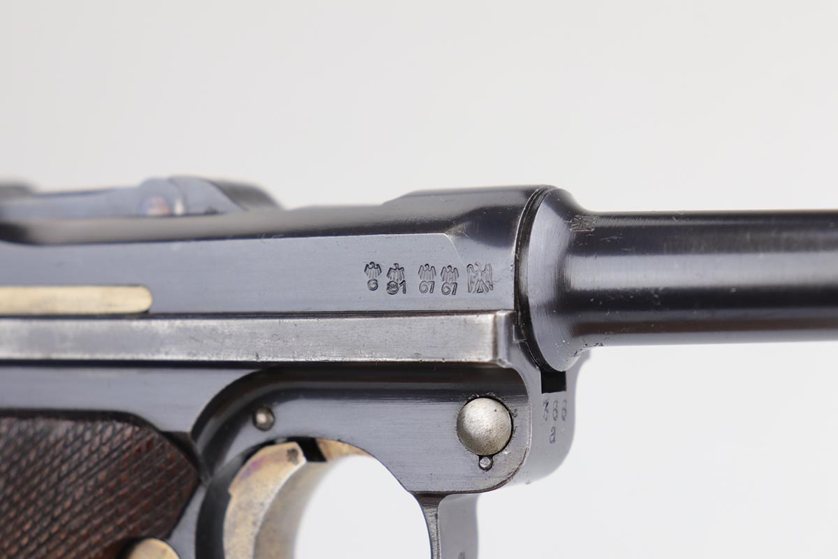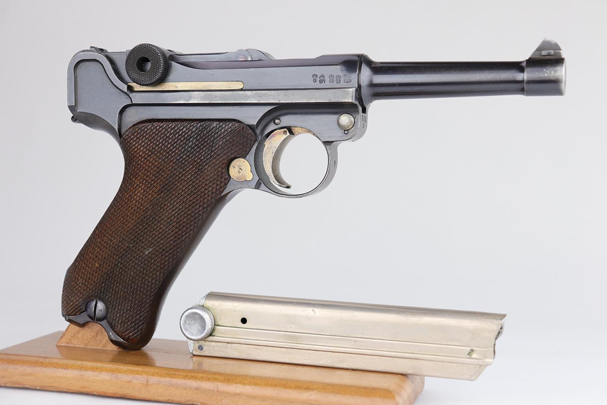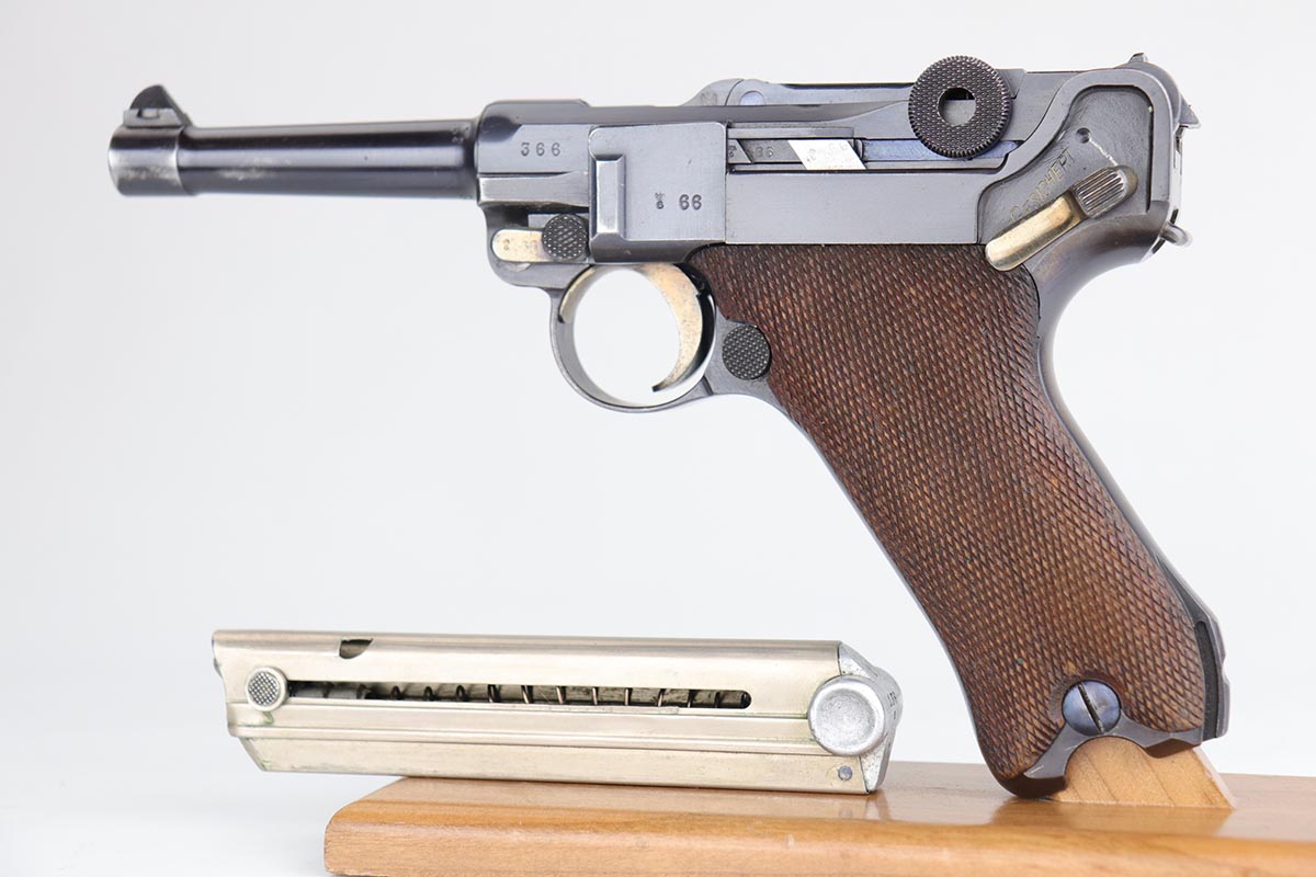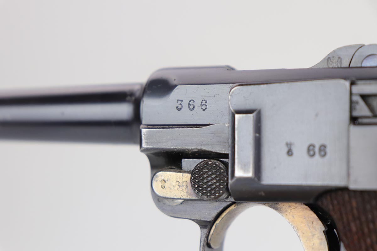 3/6/20 – This is a scarce Simson Luger made in the Weimar period in Germany, between the wars. Simson started manufacturing lugers in 1925 using equipment from the old Erfurt arsenal. Production was very low as the German army was limited in size and equipment following the Treaty of Versailles. Simson & Co. was the only company authorized to produce lugers for the German army during this time but then the company was nationalized by the Nazis in 1933. So total production from 1925 -1933 was very limited – even more rare than the Krieghoff lugers. Only about 12,000 ever produced. This gun is all matching and all parts are correctly stamped with the Simson Eagle/6 proof mark, including the screws. The magazine is numbered to a different gun, but is only off by a couple hundred serials and is an original, scarce Simson magazine. This gun was likely made 1931-32. The original finish is about 90+% with nice straw colored small parts. There is some finish loss on the barrel, and a decent amount of patina on the straps. Fantastic grips with the full serial of the pistol inside. Excellent bore.