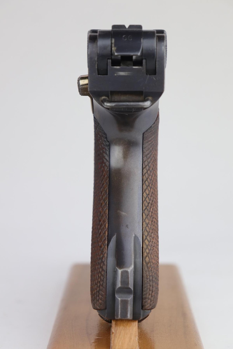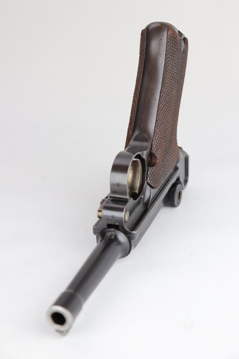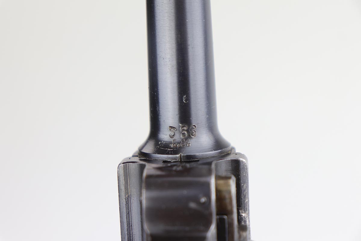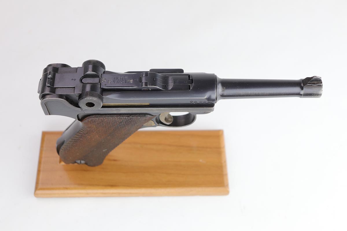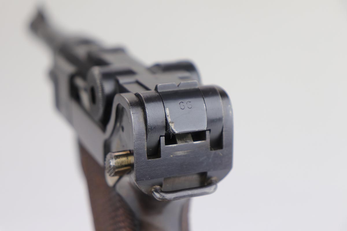 3/6/20 – This is a scarce Simson Luger made in the Weimar period in Germany, between the wars. Simson started manufacturing lugers in 1925 using equipment from the old Erfurt arsenal. Production was very low as the German army was limited in size and equipment following the Treaty of Versailles. Simson & Co. was the only company authorized to produce lugers for the German army during this time but then the company was nationalized by the Nazis in 1933. So total production from 1925 -1933 was very limited – even more rare than the Krieghoff lugers. Only about 12,000 ever produced. This gun is all matching and all parts are correctly stamped with the Simson Eagle/6 proof mark, including the screws. The magazine is numbered to a different gun, but is only off by a couple hundred serials and is an original, scarce Simson magazine. This gun was likely made 1931-32. The original finish is about 90+% with nice straw colored small parts. There is some finish loss on the barrel, and a decent amount of patina on the straps. Fantastic grips with the full serial of the pistol inside. Excellent bore.