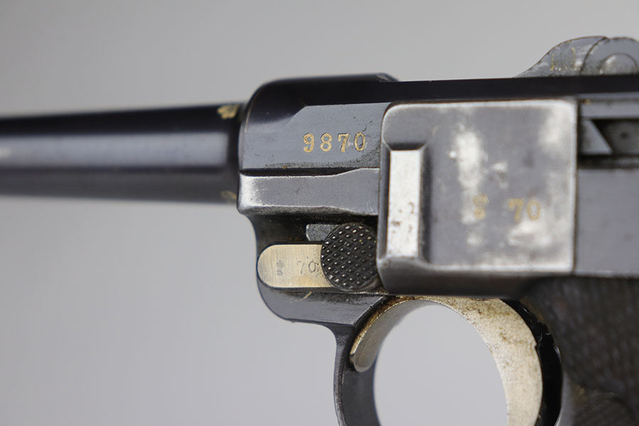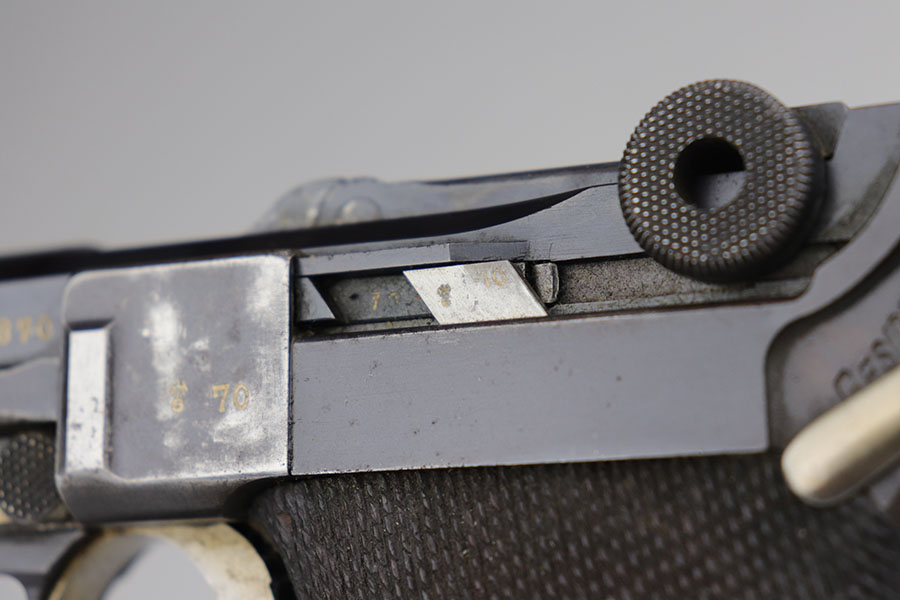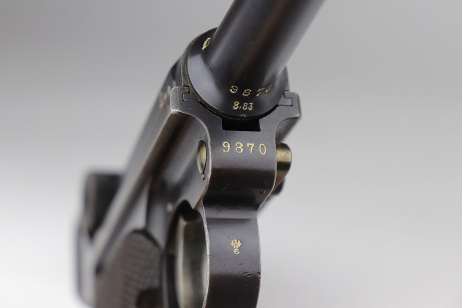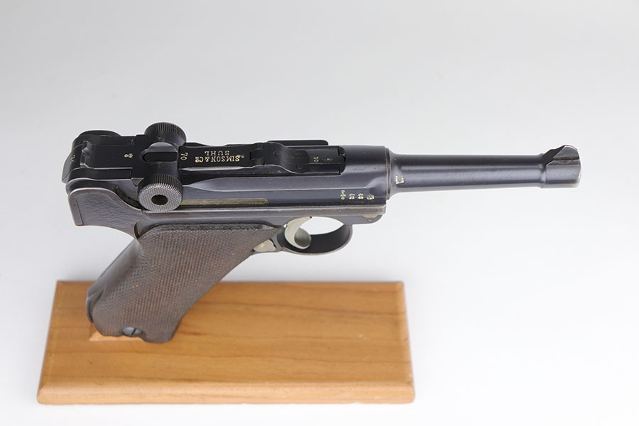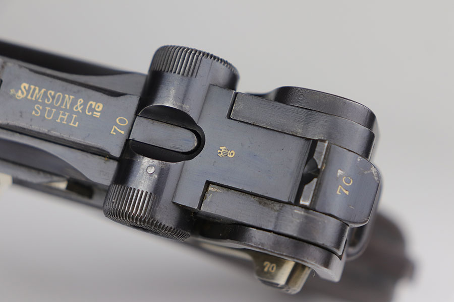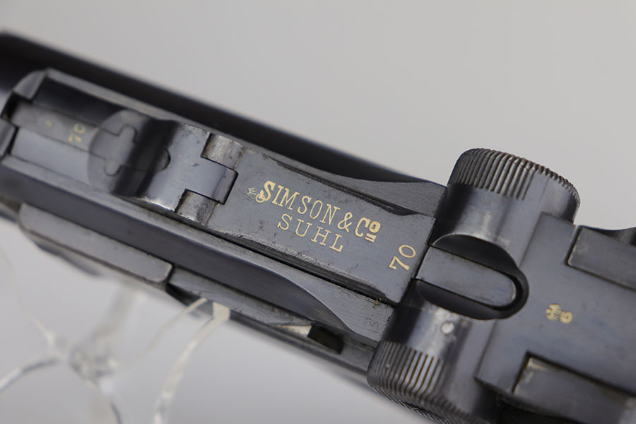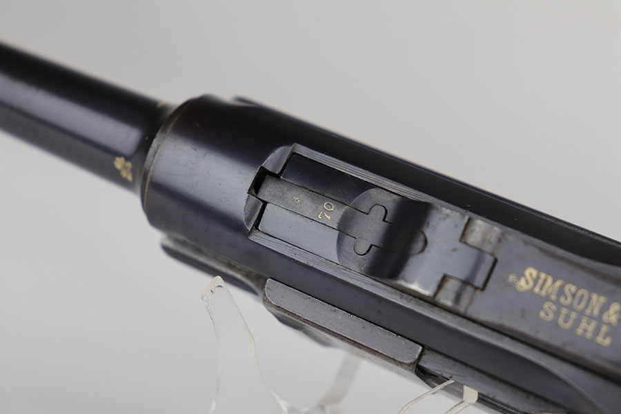 8/14/20 – This is a scarce Simson Luger made in the Weimar period in Germany, between the wars. Simson started manufacturing lugers in 1925 using equipment from the old Erfurt arsenal. Production was very low as the German army was limited in size and equipment following the Treaty of Versailles. Simson & Co. was the only company authorized to produce lugers for the German army during this time but then the company was nationalized by the Nazis in 1933. So total production from 1925 -1933 was very limited – even more rare than the Krieghoff lugers. Only about 12,000 ever produced. This gun is all matching and all parts are correctly stamped with the Simson Eagle/6 proof mark, including the screws. The magazine is a WWI era mag with blank wood bottom. This gun was likely made 1931-32. The original finish is about 92% with most of the finish loss on the sideplate and left side of barrel. There is some patina all over, most pronounced on the straps. Original grips are present and have the full serial of the pistol inside. Bore is clean and shiny but shows a bit of wear to the rifling. Listing includes a police marked tool and an unmarked commercial holster.