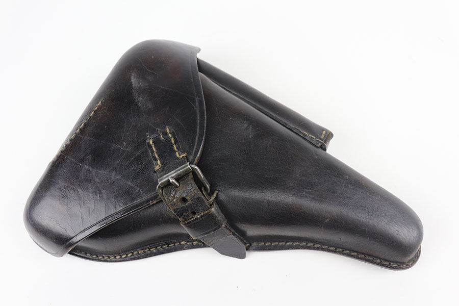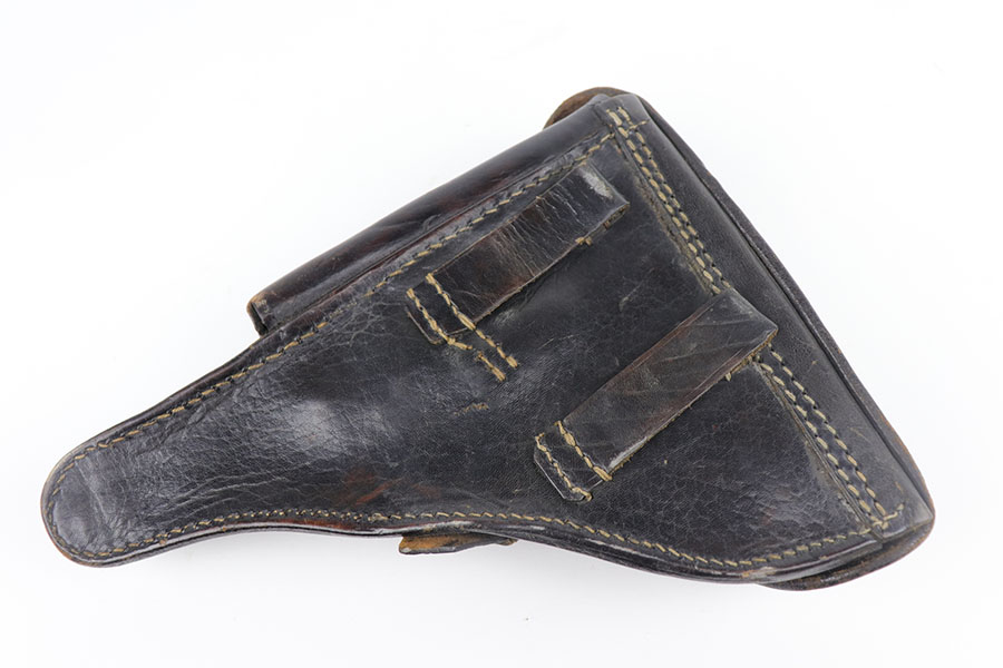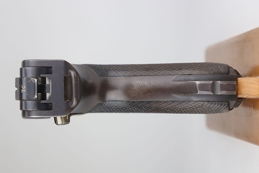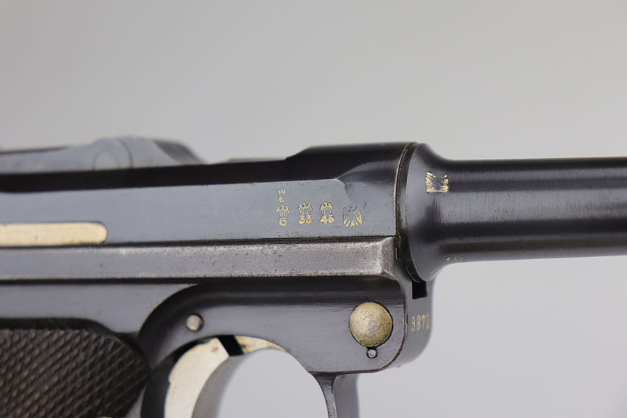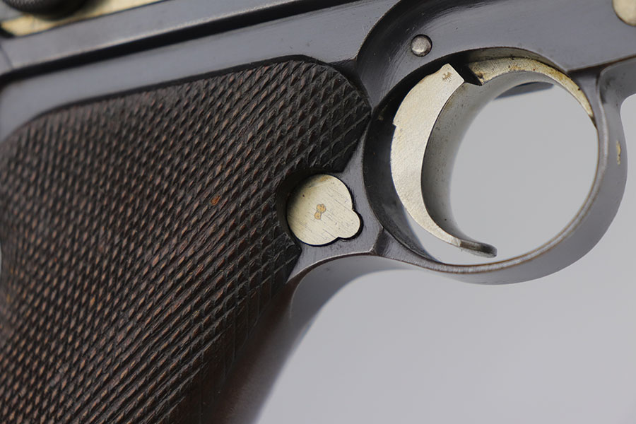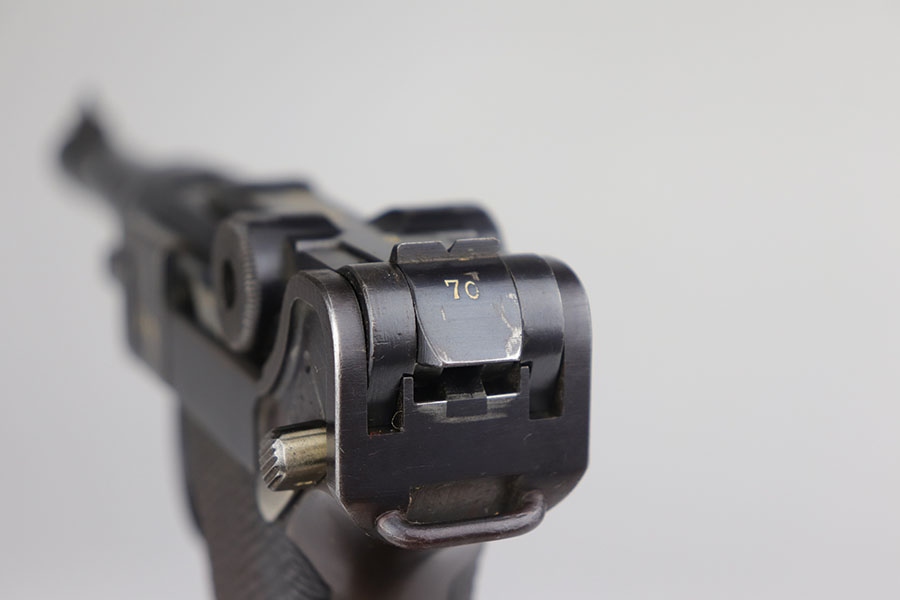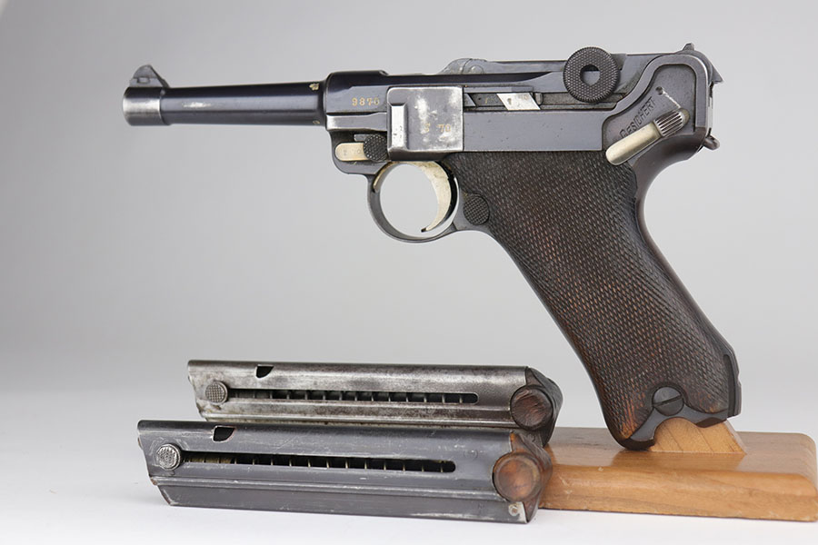 8/14/20 – This is a scarce Simson Luger made in the Weimar period in Germany, between the wars. Simson started manufacturing lugers in 1925 using equipment from the old Erfurt arsenal. Production was very low as the German army was limited in size and equipment following the Treaty of Versailles. Simson & Co. was the only company authorized to produce lugers for the German army during this time but then the company was nationalized by the Nazis in 1933. So total production from 1925 -1933 was very limited – even more rare than the Krieghoff lugers. Only about 12,000 ever produced. This gun is all matching and all parts are correctly stamped with the Simson Eagle/6 proof mark, including the screws. The magazine is a WWI era mag with blank wood bottom. This gun was likely made 1931-32. The original finish is about 92% with most of the finish loss on the sideplate and left side of barrel. There is some patina all over, most pronounced on the straps. Original grips are present and have the full serial of the pistol inside. Bore is clean and shiny but shows a bit of wear to the rifling. Listing includes a police marked tool and an unmarked commercial holster.