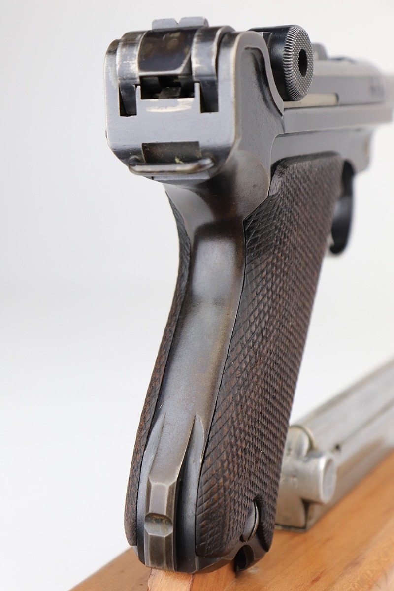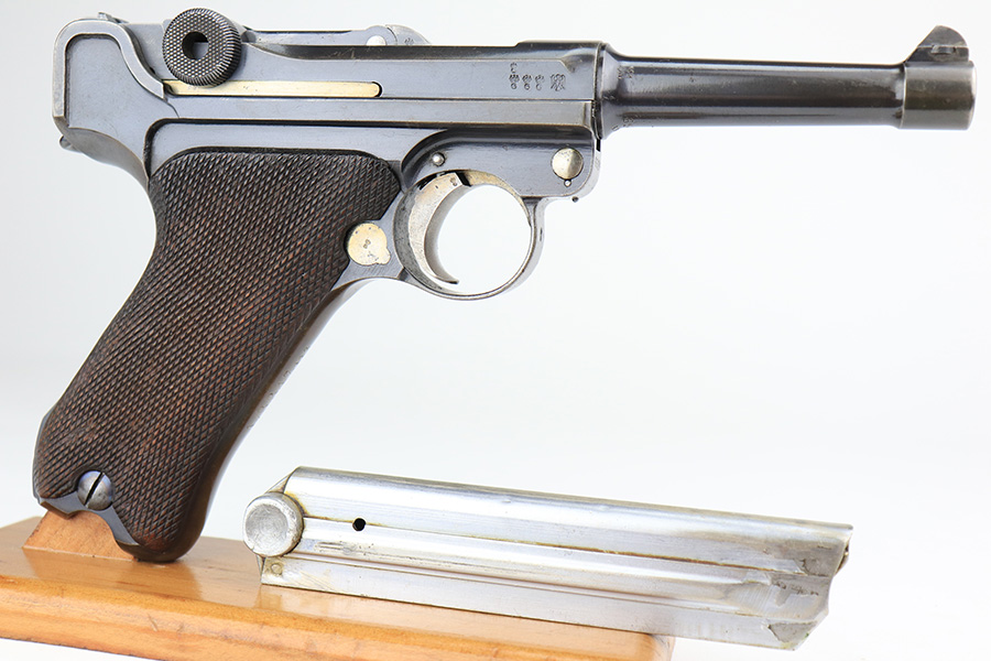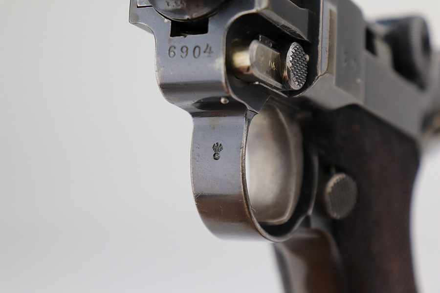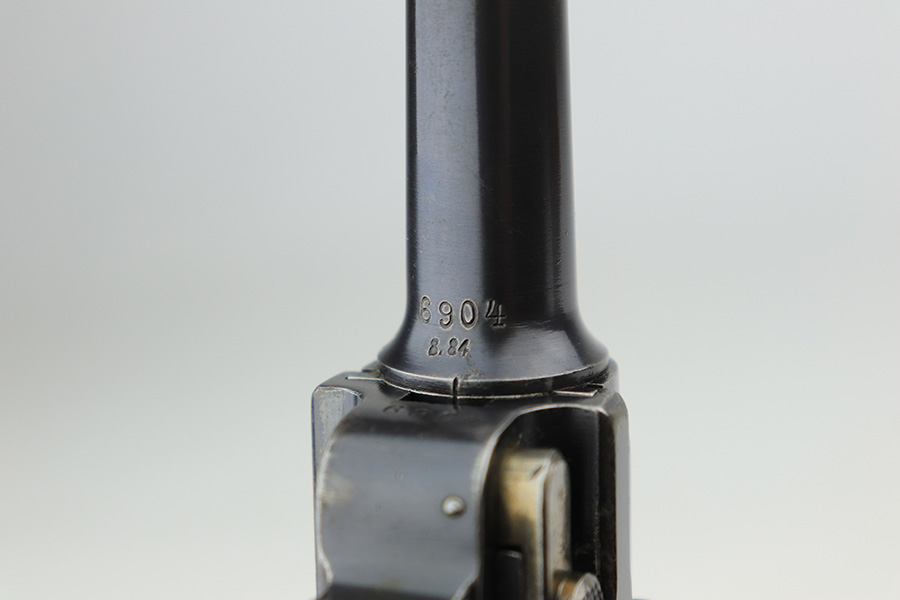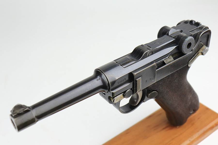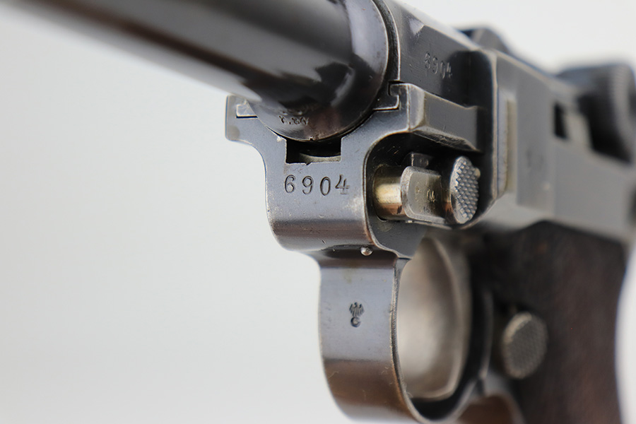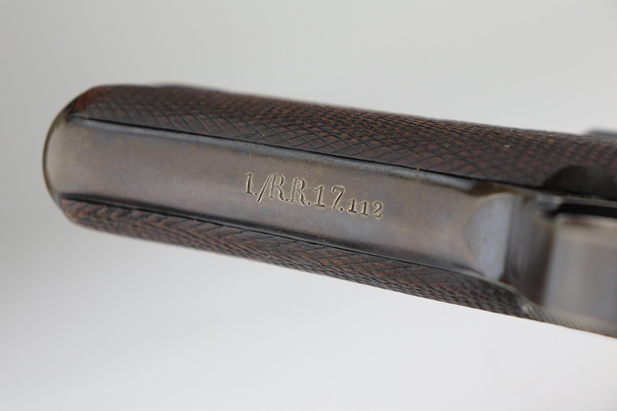 3/29/22 – This is a rare Simson Luger with Weimar-era military regimental marking on the front strap. The marking (1/R.R.17.112) indicates it was issued the 1st Reiter Regiment of the 1st squadron. There were only 12,000 total Simson Lugers produced in the 1920s and 1930s, with only a small fraction of those receiving regimental unit markings. It’s all matching, including the original grips with full four-digit serial present. The bluing is very good overall with most of the wear and patina on the straps. The grips show smoothing and handling wear but no chips or cracks. Bore is shiny with strong rifling and just a bit of freckling. Small parts are all Simson-proofed, including the grip screws. The magazine is a WW2 police replacement.