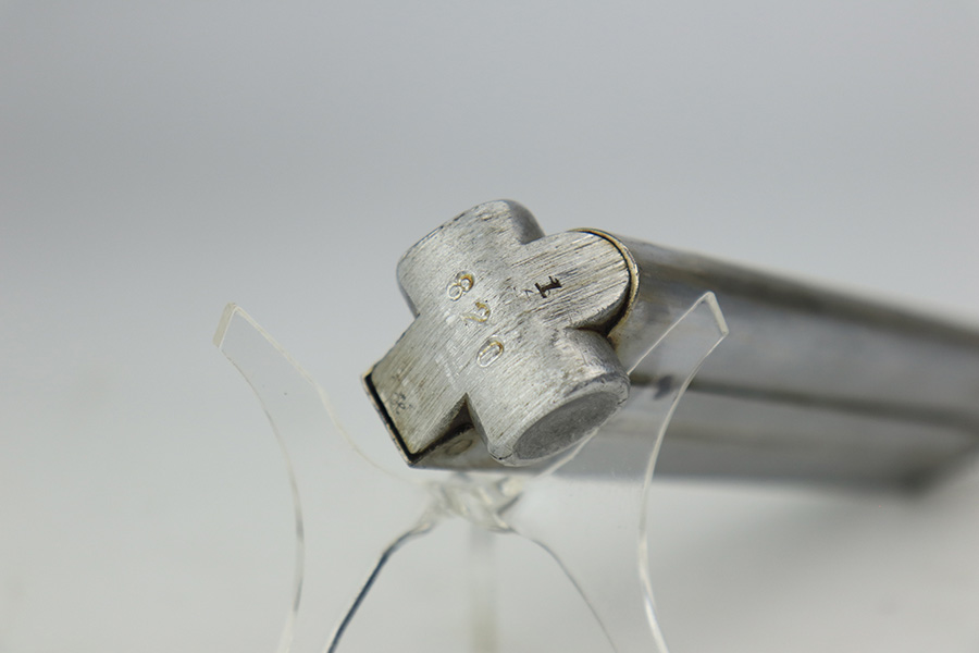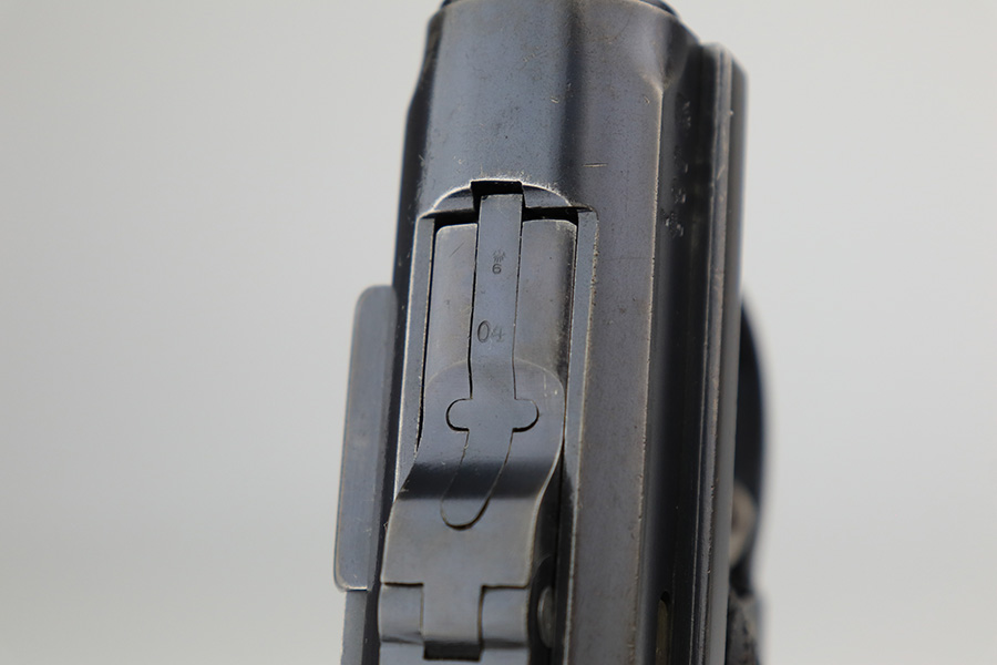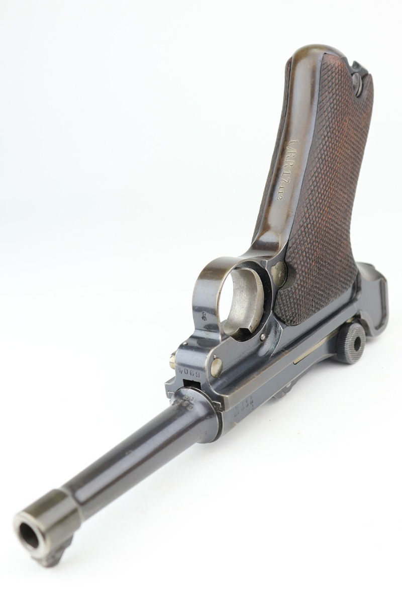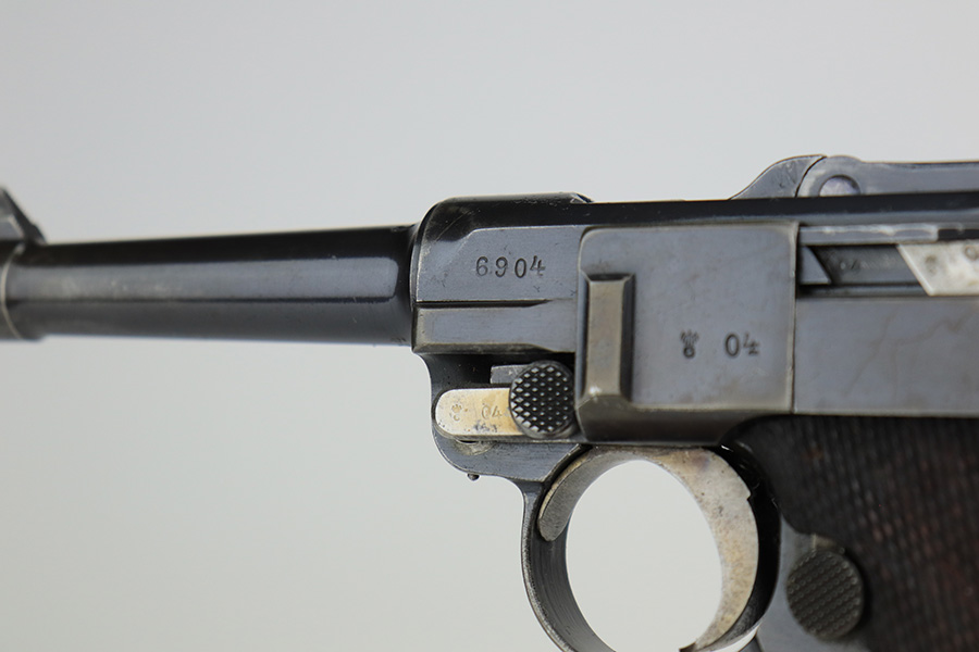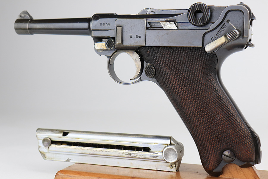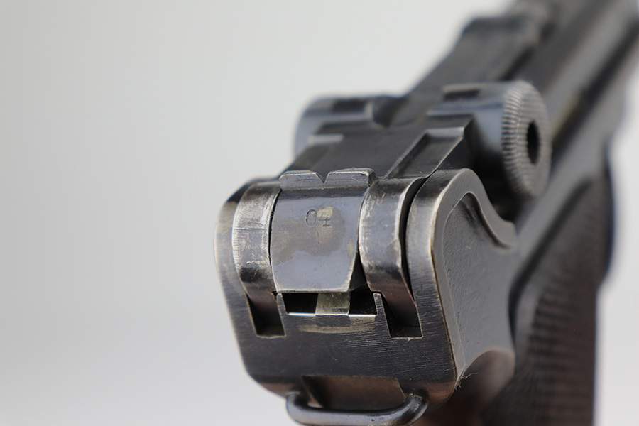 3/29/22 – This is a rare Simson Luger with Weimar-era military regimental marking on the front strap. The marking (1/R.R.17.112) indicates it was issued the 1st Reiter Regiment of the 1st squadron. There were only 12,000 total Simson Lugers produced in the 1920s and 1930s, with only a small fraction of those receiving regimental unit markings. It’s all matching, including the original grips with full four-digit serial present. The bluing is very good overall with most of the wear and patina on the straps. The grips show smoothing and handling wear but no chips or cracks. Bore is shiny with strong rifling and just a bit of freckling. Small parts are all Simson-proofed, including the grip screws. The magazine is a WW2 police replacement.