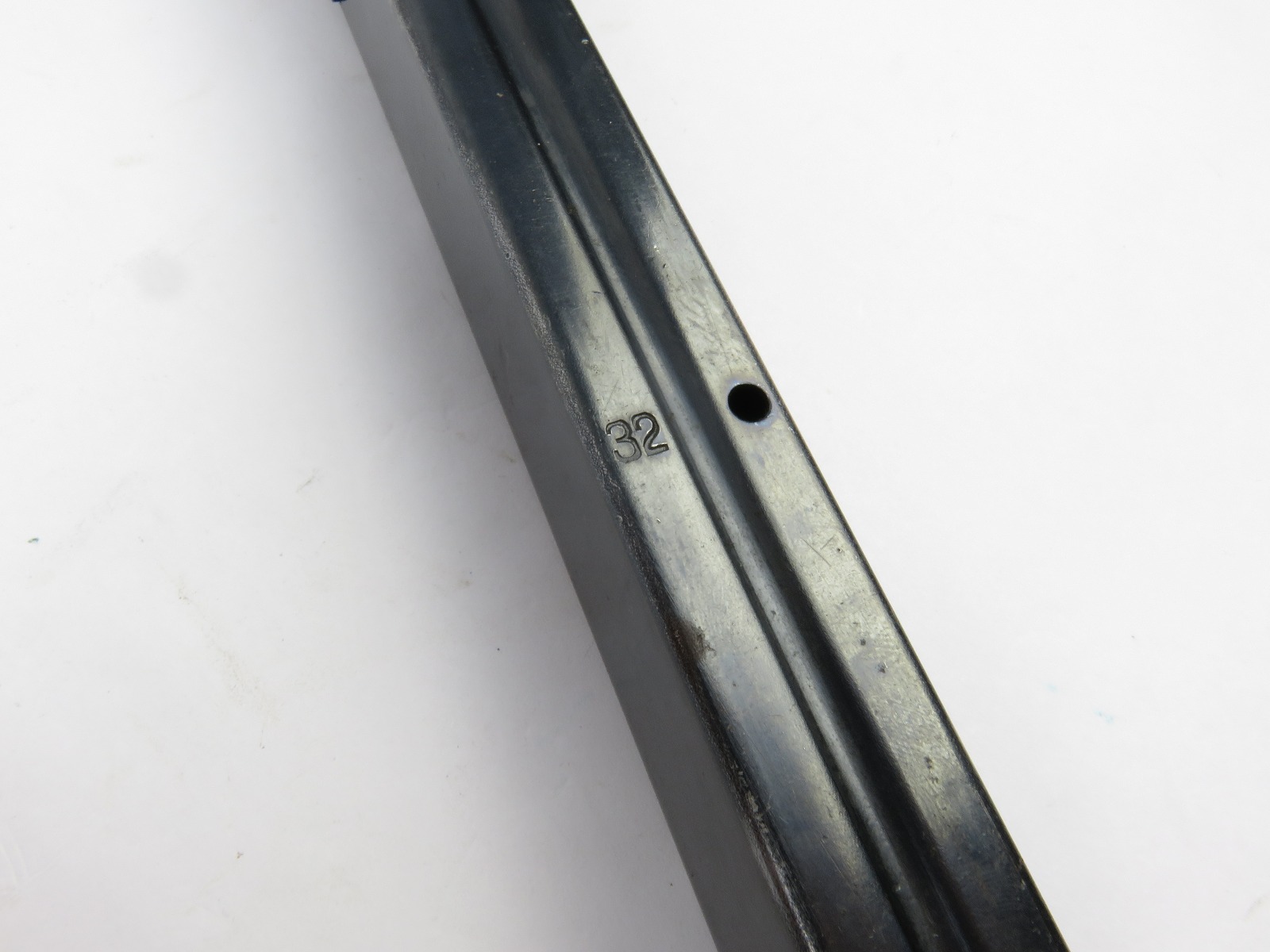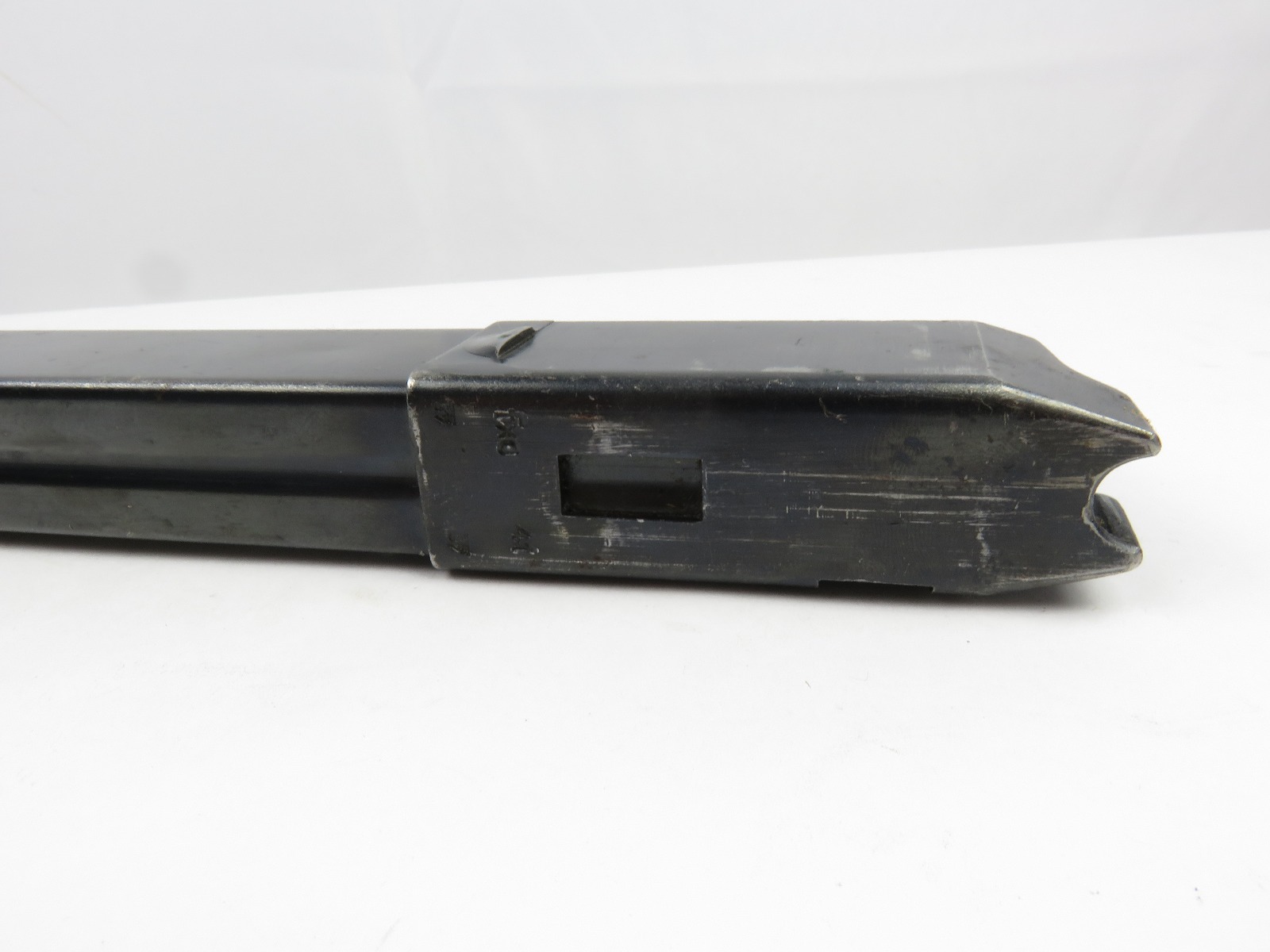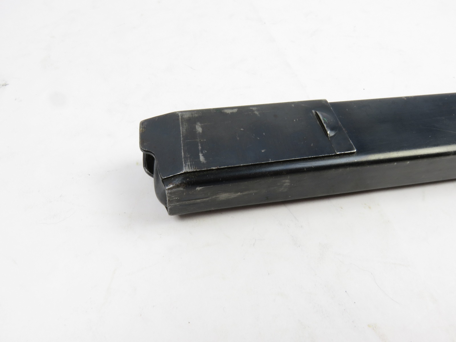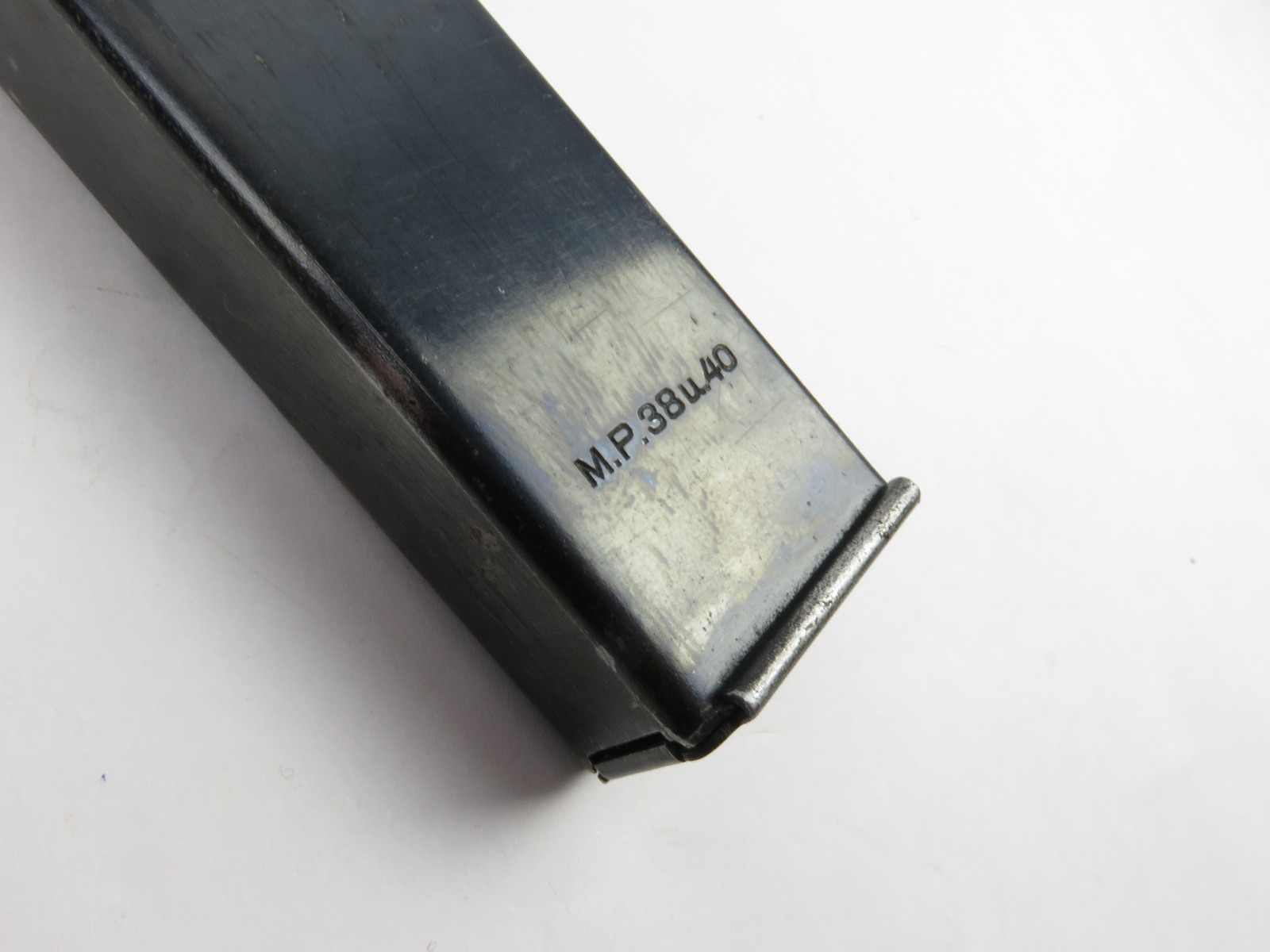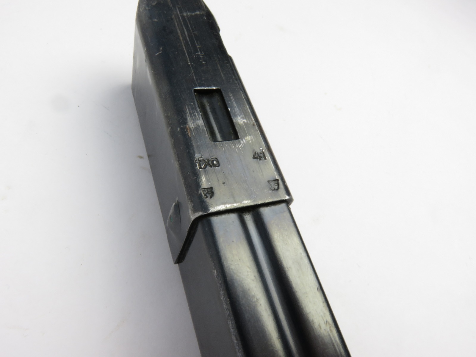 12/13/17 – This is an original WW2 production MP.38/40 magazine. The magazine is a rare variation “slab side” , meaning there are no ribbed grooves on either side of the magazine. The spine of the magazine is “fxo” maker stamped with two eagle/37 proofs and a ’41 date stamp. Guaranteed original and authentic. The spring is strong and fully functional. There is some minor bluing loss, but overall the condition is excellent.