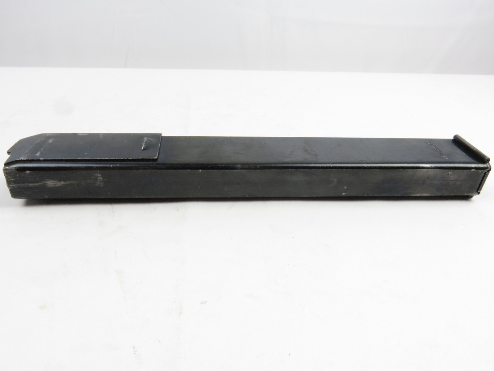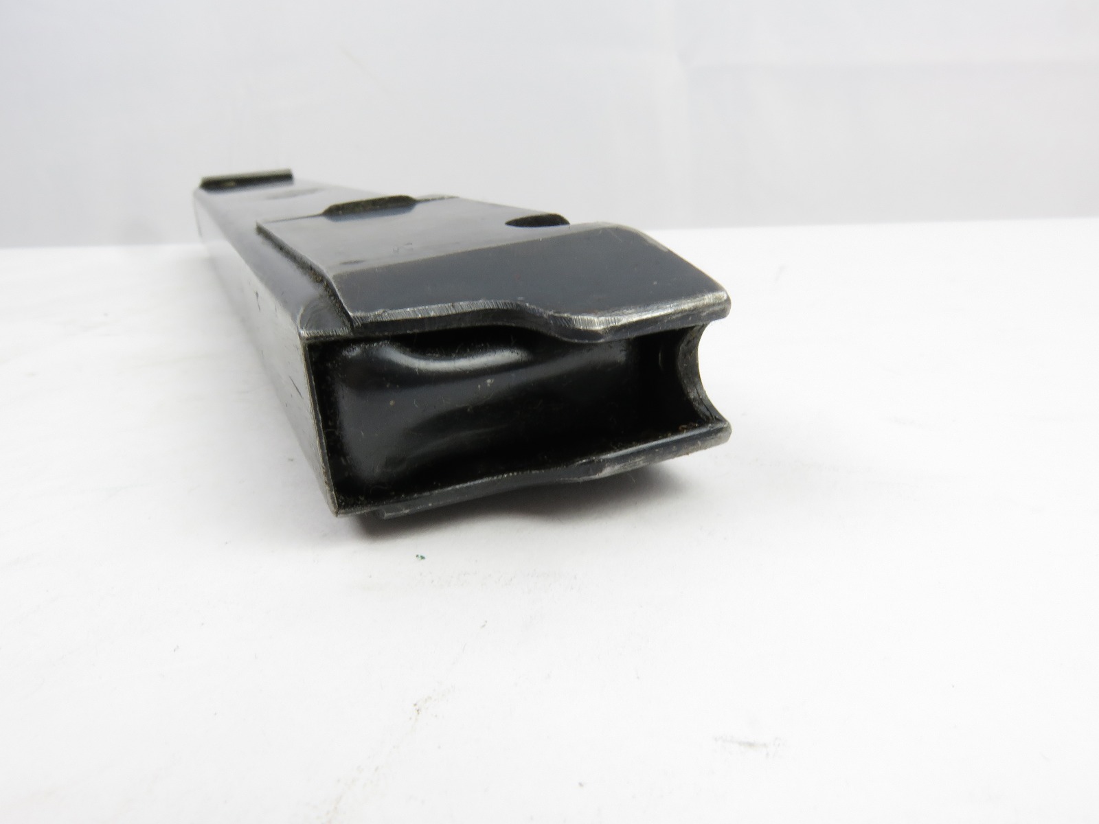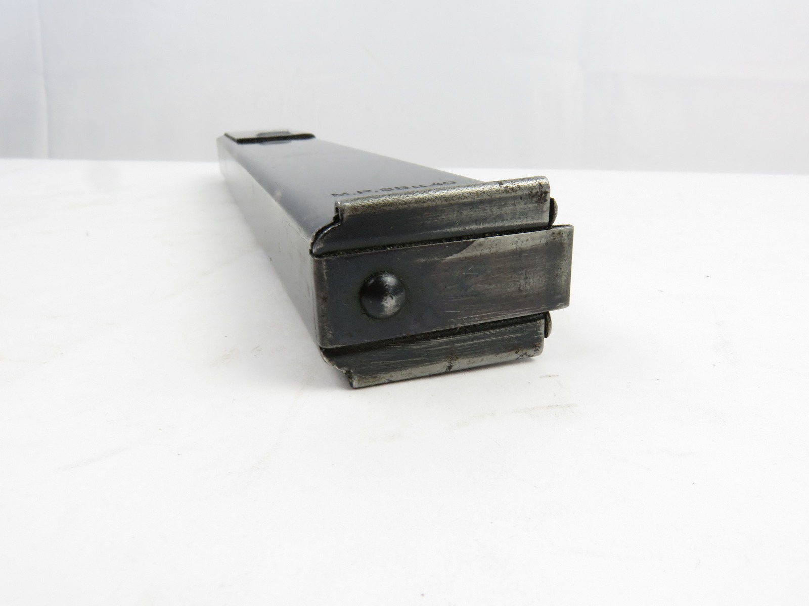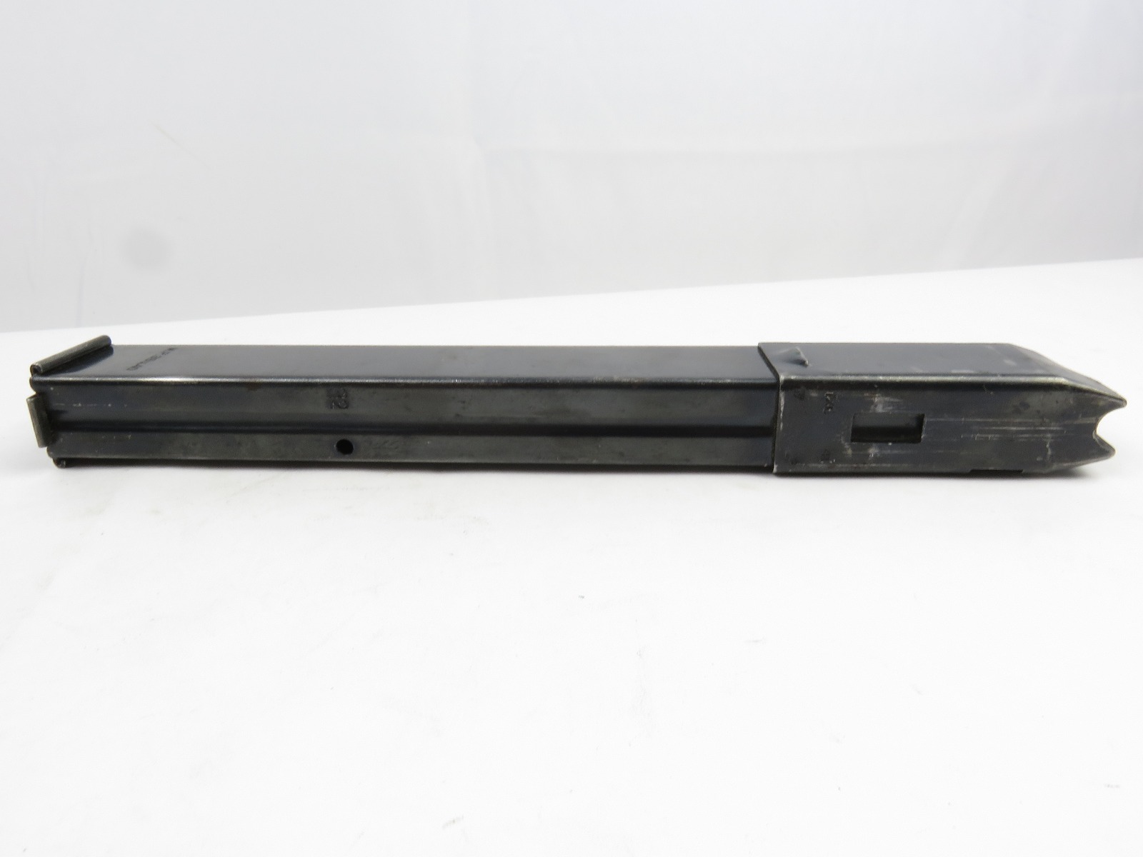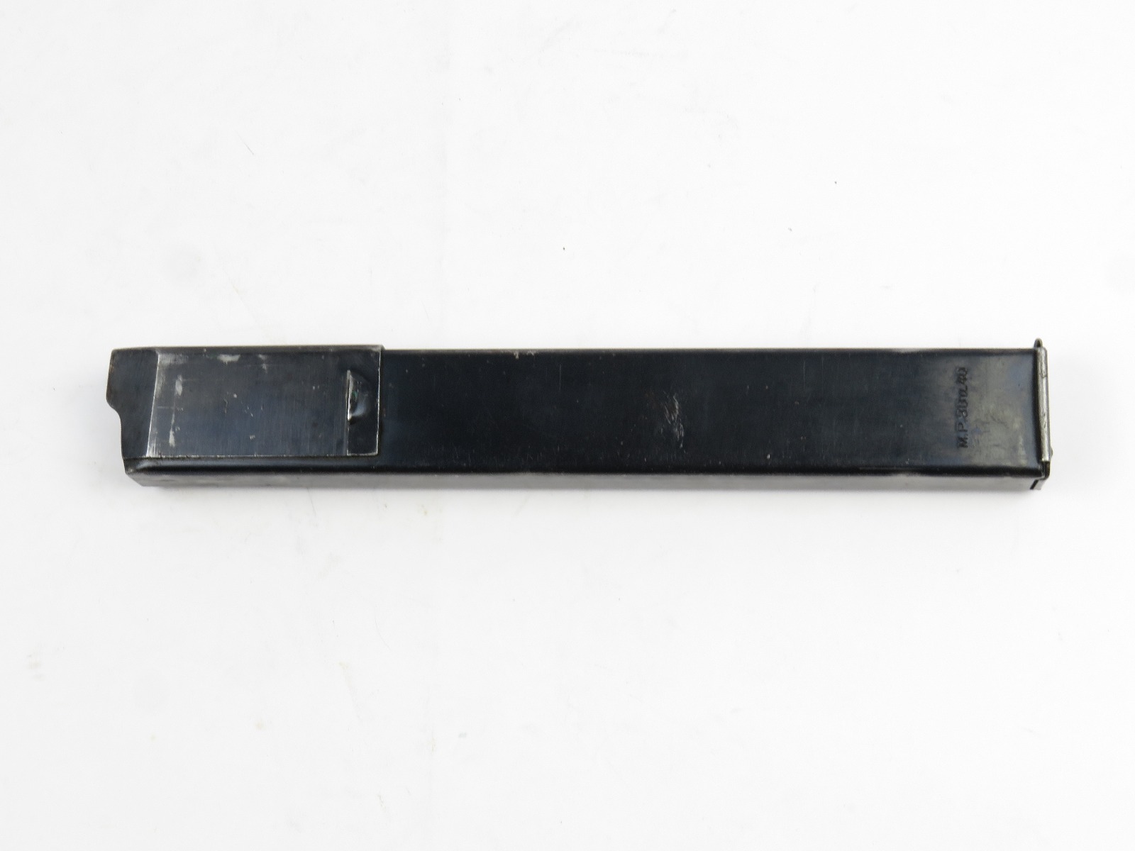 12/13/17 – This is an original WW2 production MP.38/40 magazine. The magazine is a rare variation “slab side” , meaning there are no ribbed grooves on either side of the magazine. The spine of the magazine is “fxo” maker stamped with two eagle/37 proofs and a ’41 date stamp. Guaranteed original and authentic. The spring is strong and fully functional. There is some minor bluing loss, but overall the condition is excellent.