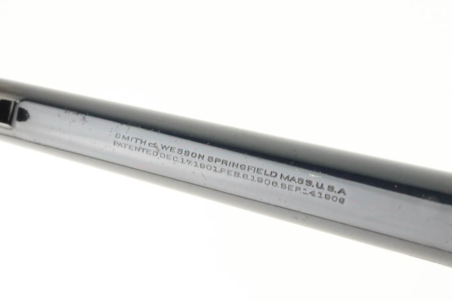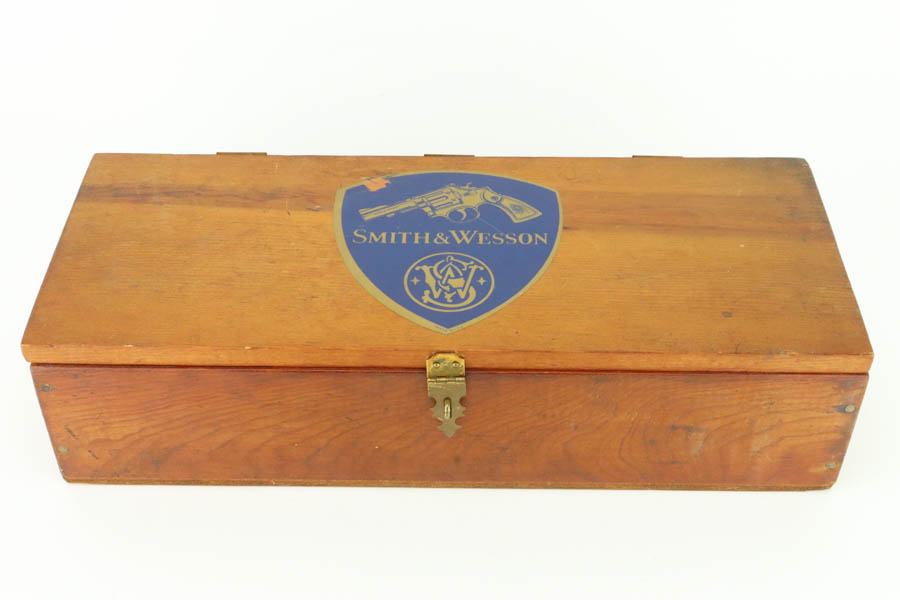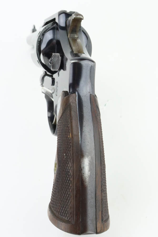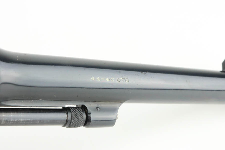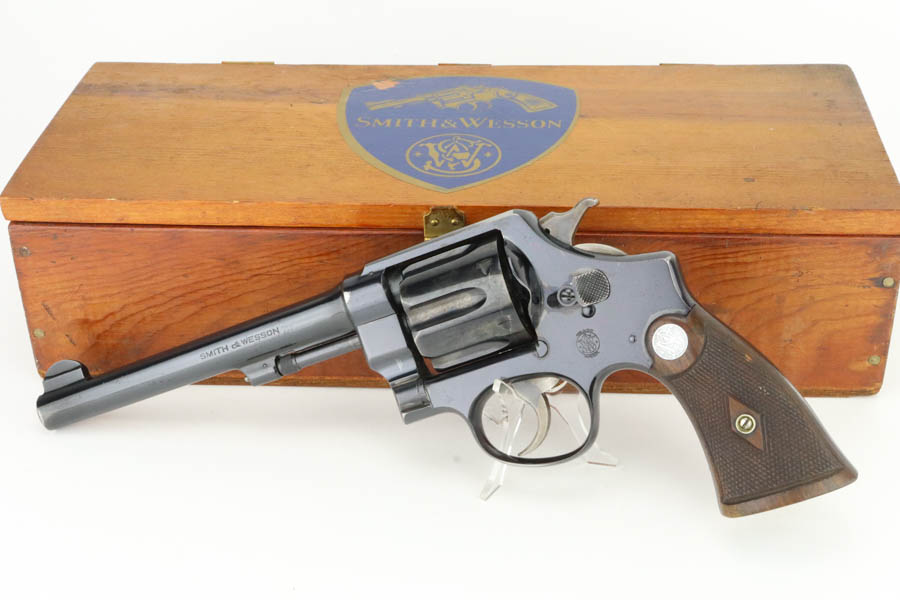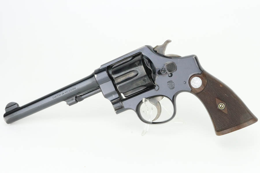6/3/24 – This is an excellent example of a rare Smith & Wesson 2nd Model Hand Ejector Revolver, manufactured in the 1920’s and chambered in .44-40. All matching with about 95% of its original high polish bluing. There is minor muzzle wear, general high edge wear (especially on the cylinder), a spot of wear on the underside of the trigger guard, and some thinning on the back strap. Original matching grips. Mint bore. Comes with a S&W wood presentation case.