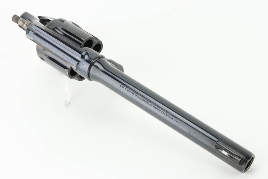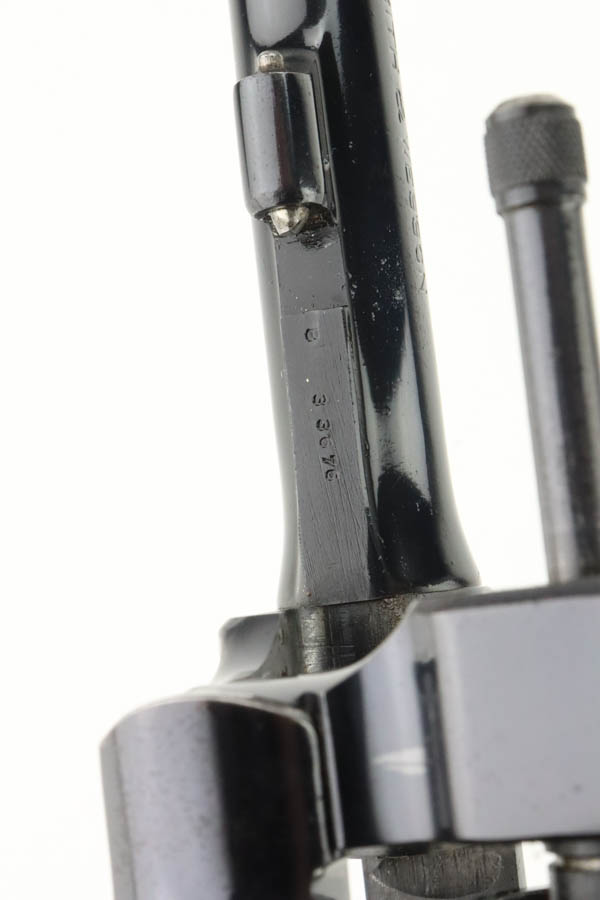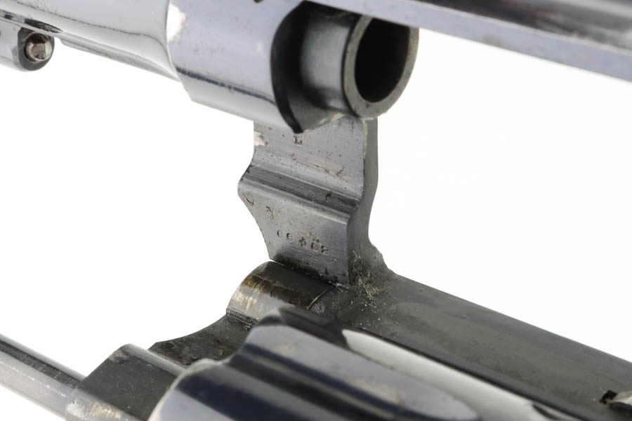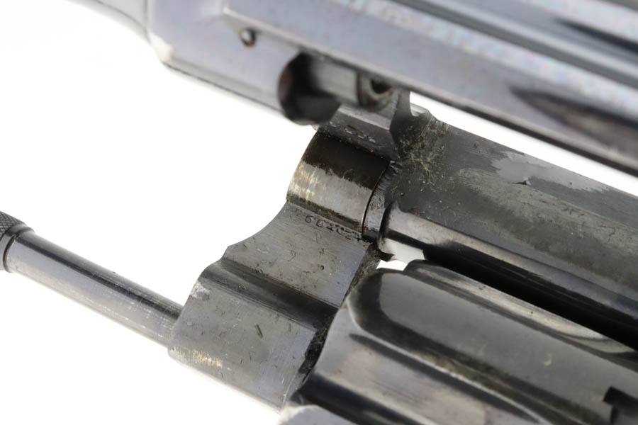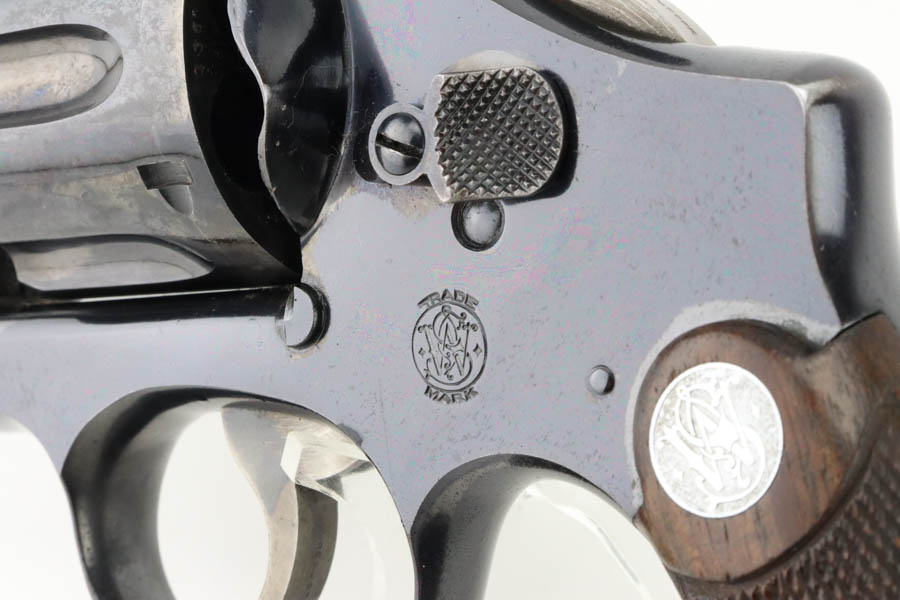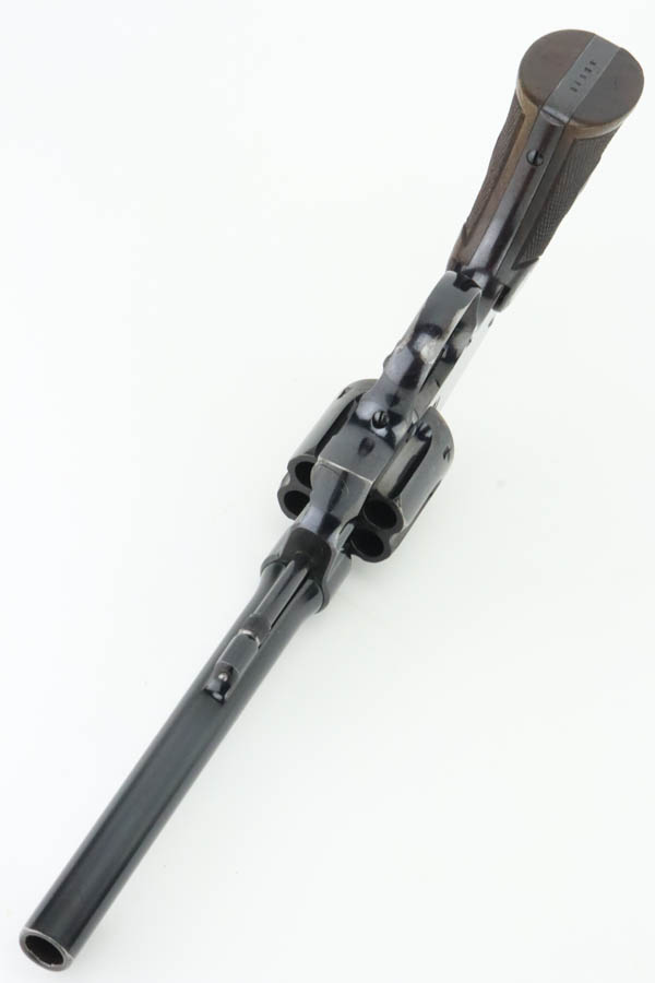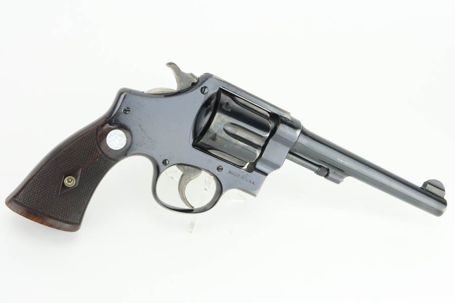 6/3/24 – This is an excellent example of a rare Smith & Wesson 2nd Model Hand Ejector Revolver, manufactured in the 1920’s and chambered in .44-40. All matching with about 95% of its original high polish bluing. There is minor muzzle wear, general high edge wear (especially on the cylinder), a spot of wear on the underside of the trigger guard, and some thinning on the back strap. Original matching grips. Mint bore. Comes with a S&W wood presentation case.