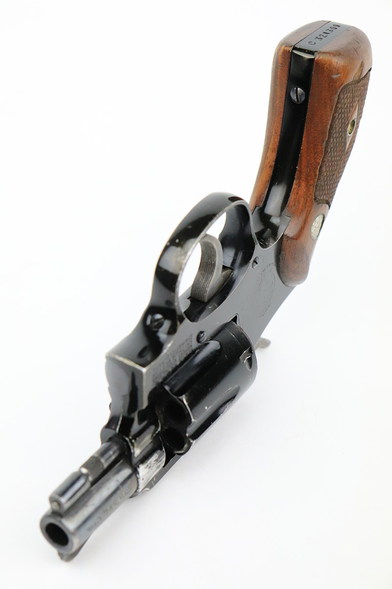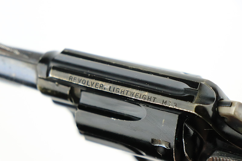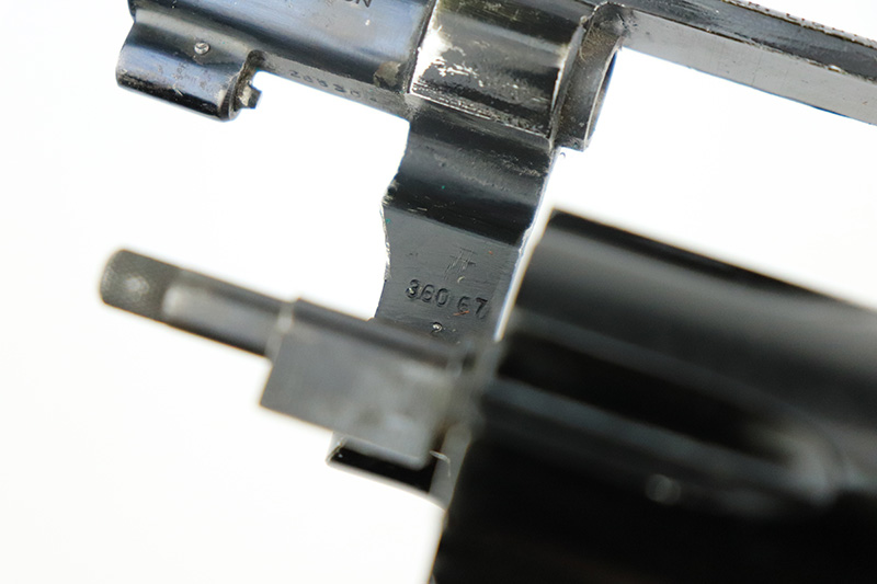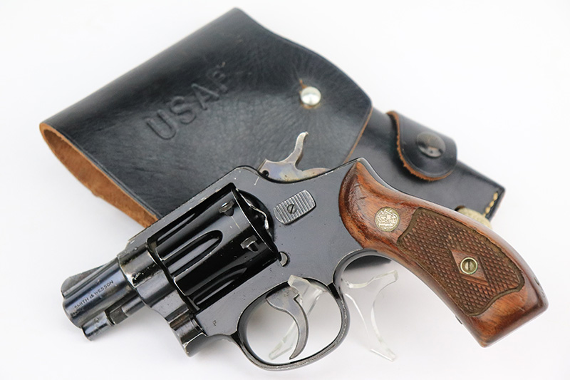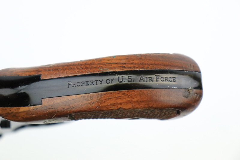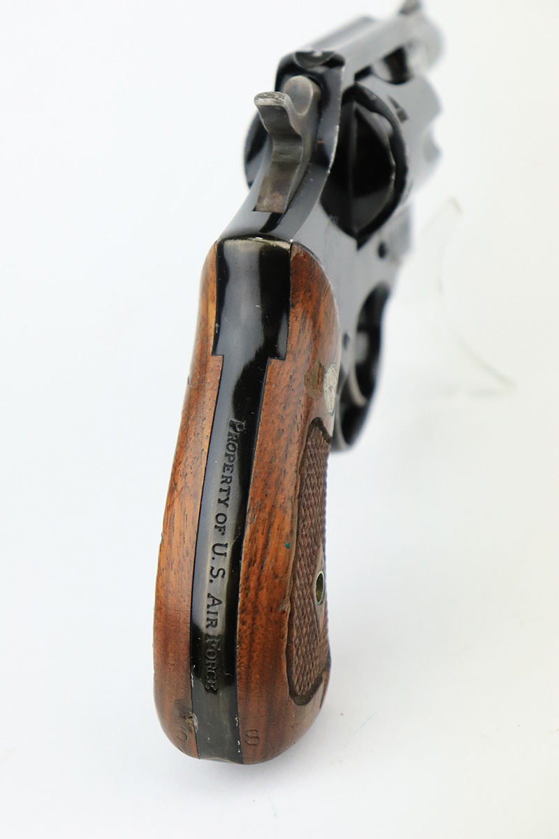 8/24/22 – This is a rare Smith & Wesson Model 13 lightweight revolver that was produced and issued to the US Air Force. About 40,000 were initially produced but only a tiny fraction remain as they were deemed unsafe and most were destroyed by the Air Force. Cylinders would split due to overpowered ammunition being used. The finish shows some obvious wear around the barrel and front edges of the frame as it was likely issued and used by the Air Force. Mismatched numbers throughout, though the original grips are present and matched to the frame. Grip frame is marked ‘PROPERTY OF U.S. AIR FORCE’, and top of frame is marked ‘REVOLVER, LIGHT WEIGHT M13’. Comes with original holster that is also marked USAF. Minty bore.