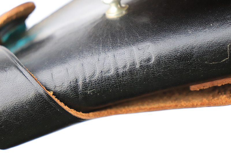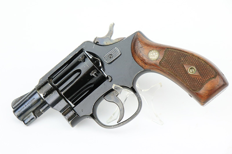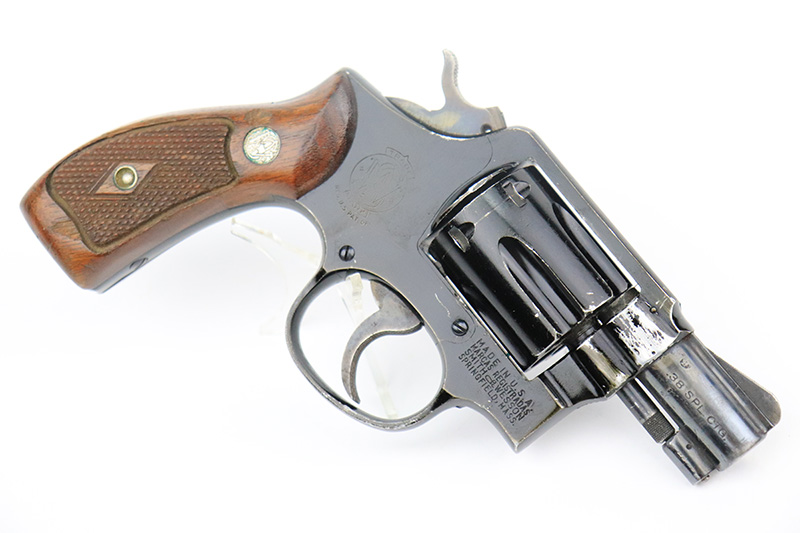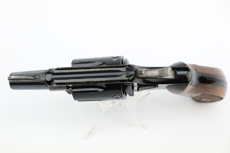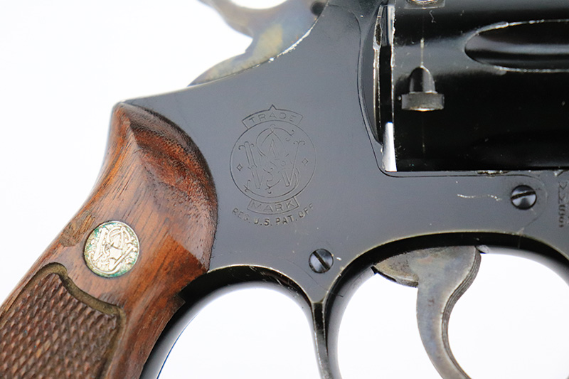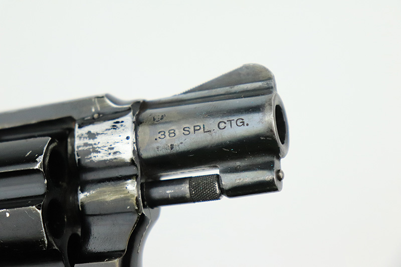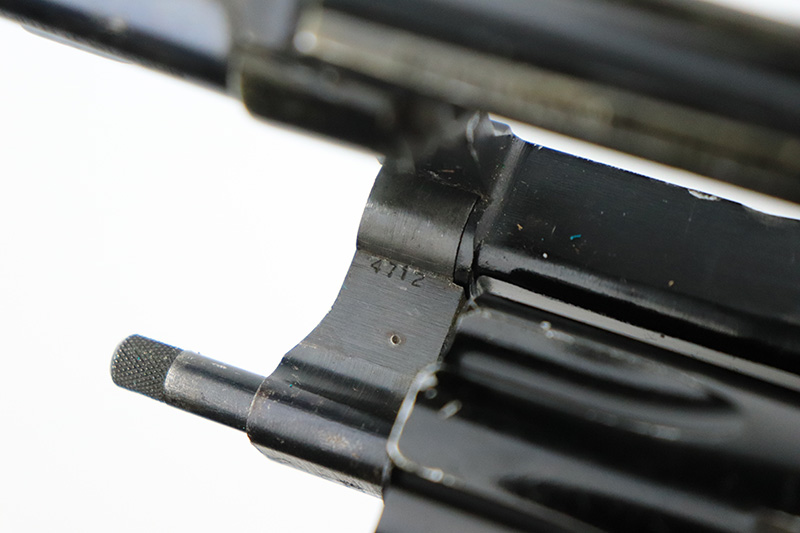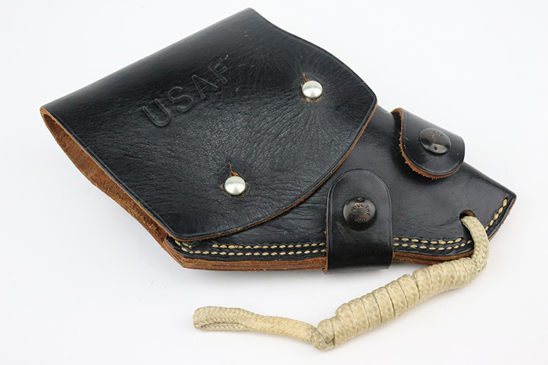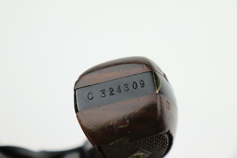 8/24/22 – This is a rare Smith & Wesson Model 13 lightweight revolver that was produced and issued to the US Air Force. About 40,000 were initially produced but only a tiny fraction remain as they were deemed unsafe and most were destroyed by the Air Force. Cylinders would split due to overpowered ammunition being used. The finish shows some obvious wear around the barrel and front edges of the frame as it was likely issued and used by the Air Force. Mismatched numbers throughout, though the original grips are present and matched to the frame. Grip frame is marked ‘PROPERTY OF U.S. AIR FORCE’, and top of frame is marked ‘REVOLVER, LIGHT WEIGHT M13’. Comes with original holster that is also marked USAF. Minty bore.
