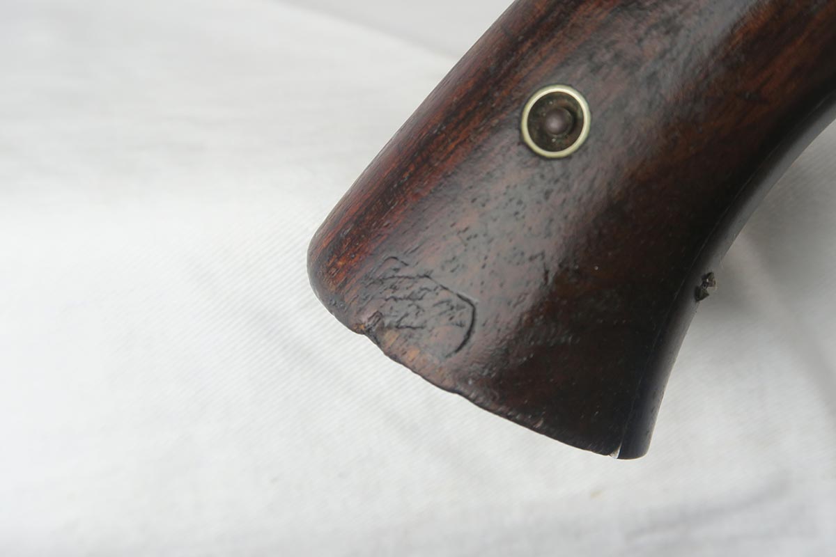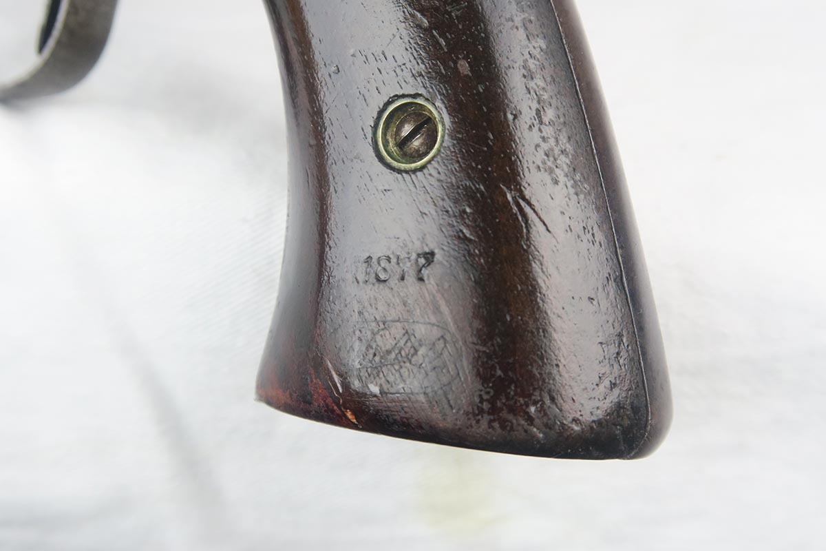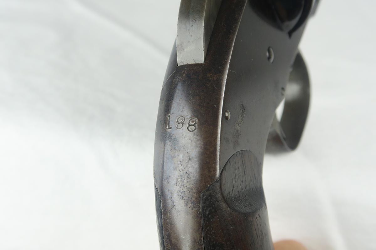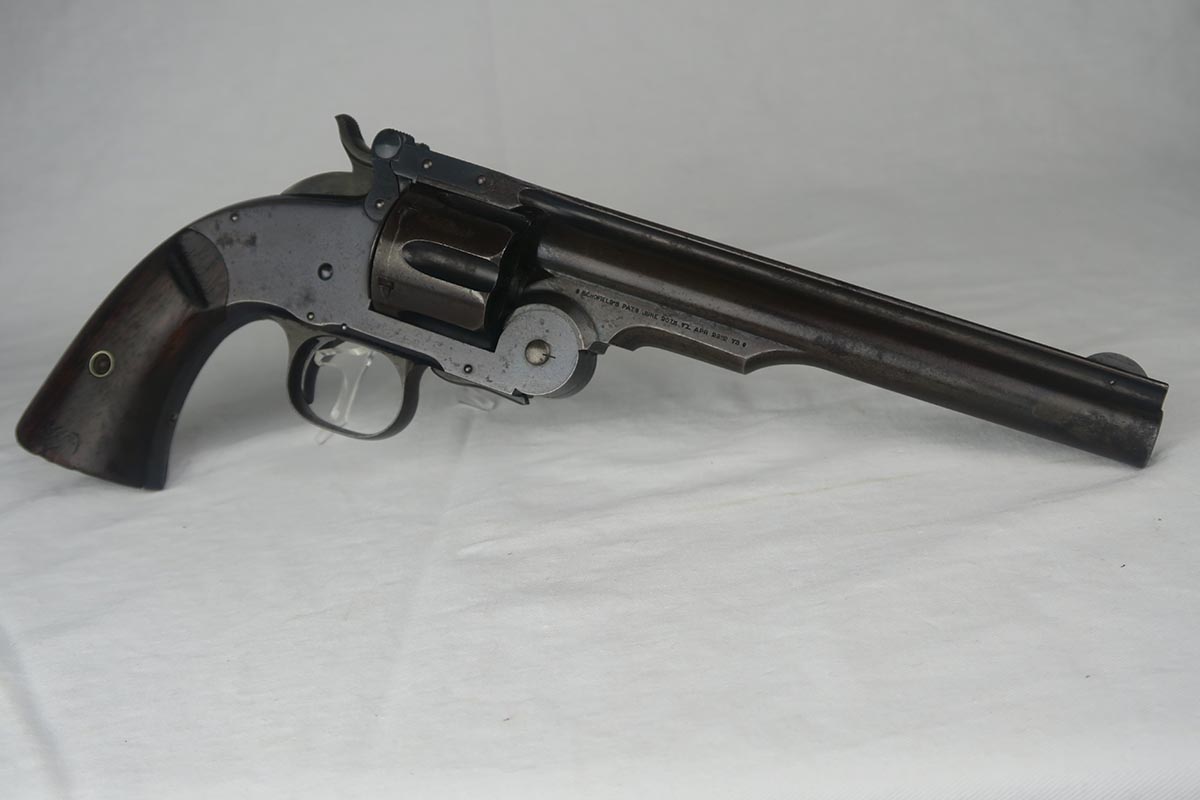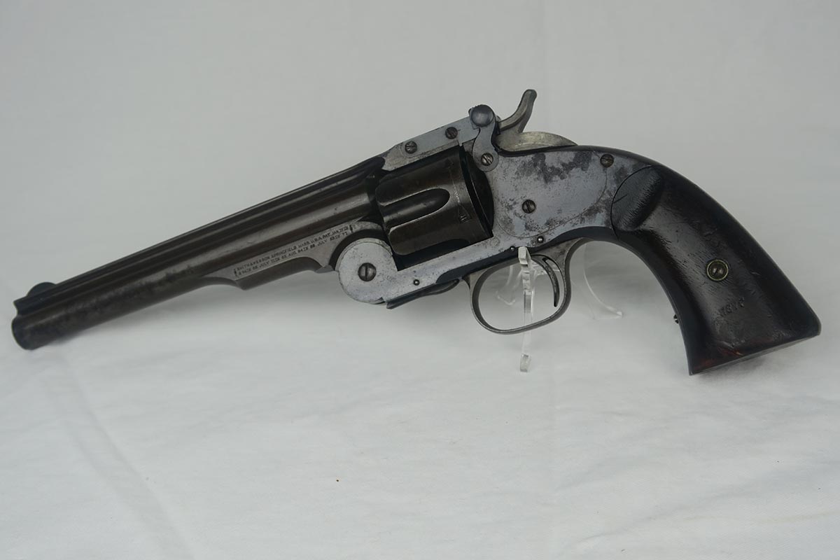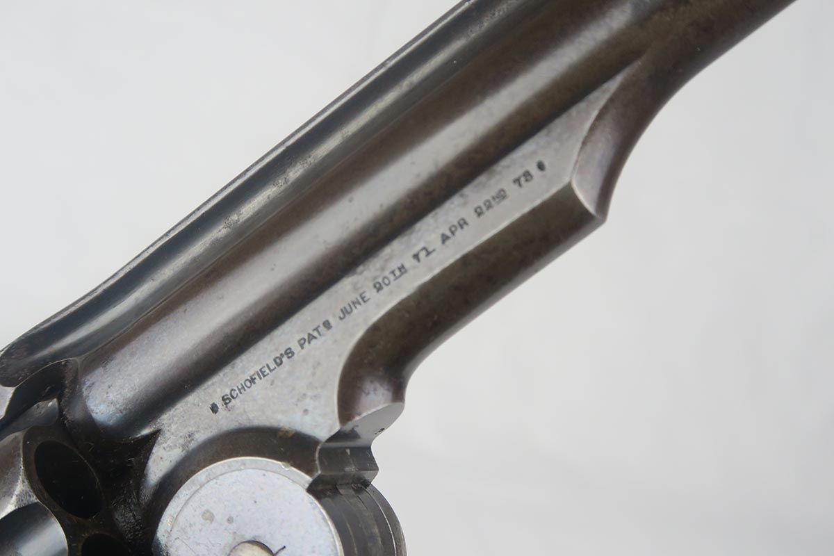 10/6/17 – This is a rare Smith & Wesson Schofield 2nd model revolver, manufactured in 1877, with cartouche on both grip panels, US property mark on frame and police arsenal numbering on back strap.  The left grip has a “DAL” (Lt. David A Lyle) Inspectors cartouche under “1877” and the right grip is stamped with the “CW” (Charles Woodman) Sub-Inspectors initials.  This revolver is one of approximately 300 that were issued from the Benicia Arsenal to the San Francisco Committee of Safety during the labor riots and civil unrest of 1877-78. The riots and unrest were a result of the great railroad strikes of 1877 that sprung up in many large cities across the United States. Records do exist of these 300 revolvers being issued however, no records exist of them being returned and it is popular belief that once the riots were put down all the revolvers were obtained by the California militia. The top of the back strap features the hand stamped SFPD marking “188”.  All numbered parts are matching.  There is light freckling in a few spots and patina throughout.  The bore and action are excellent, however.  Minty bore.