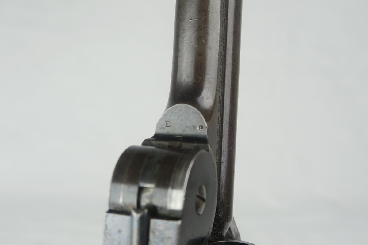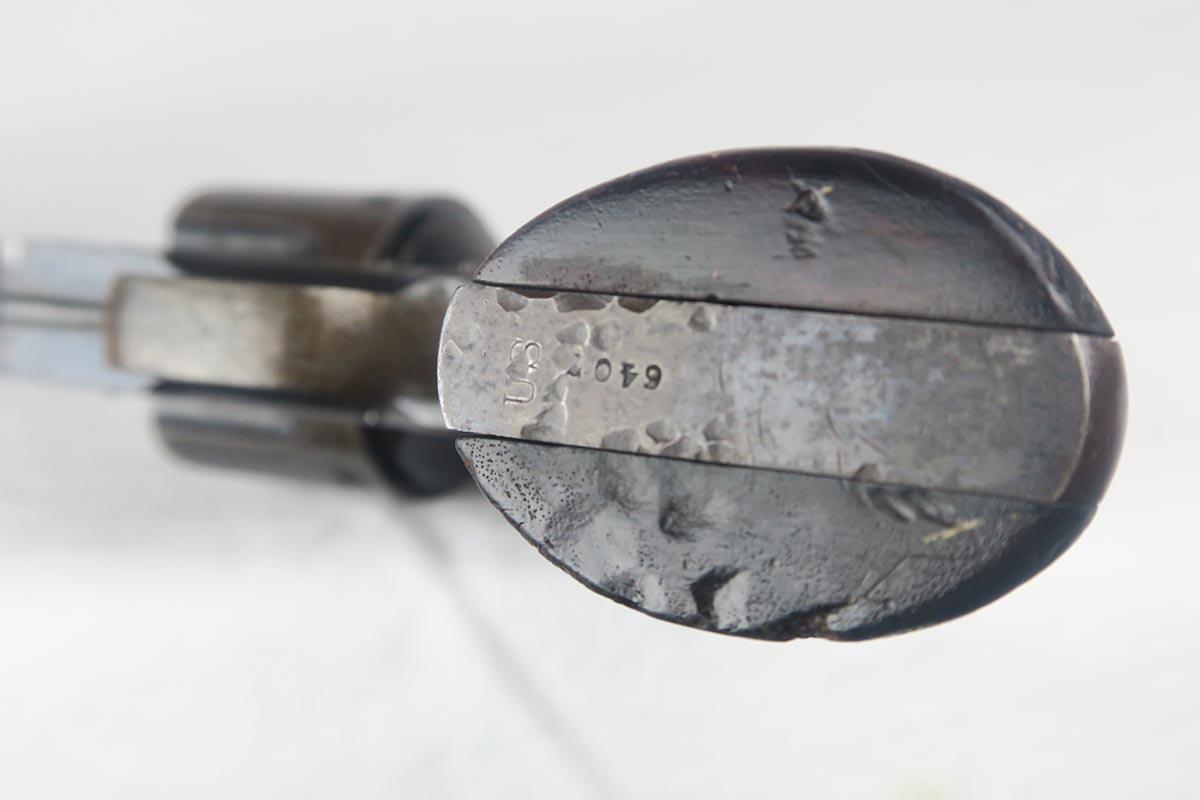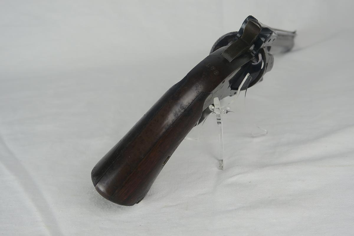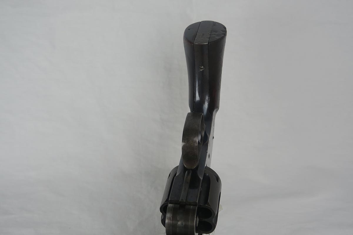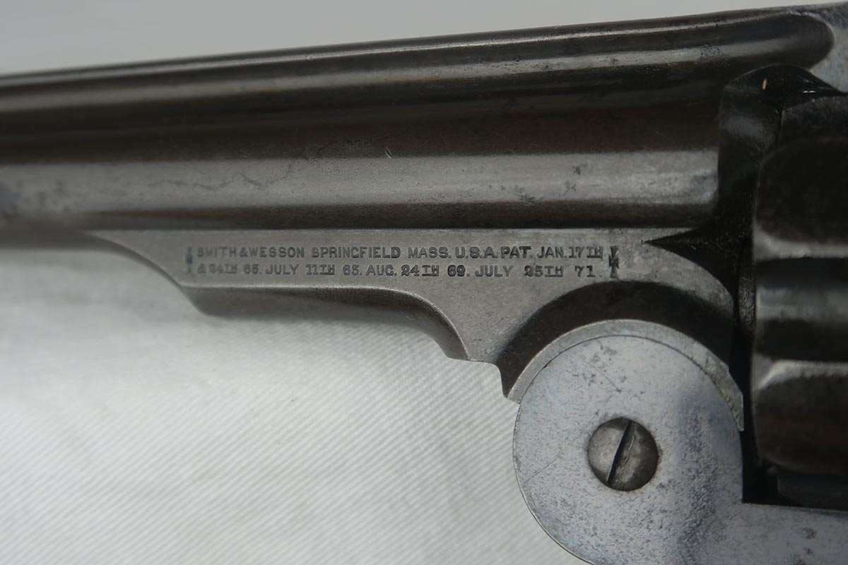 “Another interesting chapter in the story of the Smith & Wesson Schofield occurred in the San Francisco area during 1877 and 1878. In 1873, an economic depression had afflicted most of Europe and had migrated to American shores. While the combination of factors creating the crisis were multidimensional, one that directly affected the American West was the Coinage Act of 1873, the decision to move from a gold-silver monetary system to the gold standard. This ended the minting of silver coins in America, which had a disastrous effect on the silver mines of the west, as the value of silver plummeted with the government no longer buying it for use in coins. Additionally, the economic collapse had started in the major cities of the east, primarily New York, Boston and Chicago, and the lack of jobs and economic opportunity had caused many Americans to move west. The pressures placed on western US economies by the precipitous drop in silver value and the increased population resulted in widespread unemployment, particularly in urban centers like San Francisco. The end result was that thousands of unemployed and disenchanted people struggling to survive and in search of hope. Many found a hopeful message with the Workingman’s Party of the United States, a socialist labor movement. On July 23, 1877, some 8,000 members and interested parties gathered near the San Francisco City Hall for a “meeting”, which by the end of the night had devolved into a massive riot that lasted well into the next day. One of the points of tension, and a classic cry of those who would incite violence during hard economic times, was that the problem was the “foreigners”. Little thought was given to the fact that nearly all of those who gathered for this meeting were immigrants themselves who had only been in the United States for one or two generations. The chosen scapegoat were the Chinese laborers, whose massive influx over the last decade had resulted in lower wages and fewer job opportunities for newly arrived easterners. The cry of “Chinamen must go!” echoed through the night and would become the rallying cry for the Workingman’s Party, which would be the genesis of the Socialist Labor Party of America. The riots eventually petered out after heroic efforts by San Francisco Police, supported by the state militia which was called out as well. Soon thereafter a group of concerned citizens known somewhat derisively as the “Pick Axe Brigade” was formed to assist with the suppression of the violence and to discourage further rioting. However, it would take more than a year before the constant threat of possible riots would pass, and much longer before the racial tension would moderate. During this time, the San Francisco Police determined that they were woefully ill-prepared and under equipped to deal with such mass civil unrest. To that end some three hundred US army Schofield revolvers (both first and second models) were issued to the San Francisco Police Force during 1877 and 1878. According to research by Charles Pate (see his Man At Arms article on the subject), the guns were issued from the Benicia Arsenal (about 35 miles north-east of San Francisco). Since 1851, Benicia had been the primary US arsenal on the west coast and would remain so through the mid-1960s. According to Pate’s research, all the revolvers issued to the SFPD from the Arsenal were stamped with large, individual inventory numbers on the backstrap, behind the hammer. Although there are records of the guns being issued, there is no evidence that they were ever returned it seems likely that since the guns were already falling out of favor and most were soon to be sold off as surplus, that the US Army simply did not put any effort into retrieving the three hundred revolvers. The guns no doubt remained in service with the SFPD until they were obsolete, and likely replaced with double action .38 caliber revolvers around the turn-of-the-century. Today, they remain an interesting footnote in the story of the Smith & Wesson Schofield revolver, and make a particularly scarce and desirable variation for the advanced Smith & Wesson collector.”