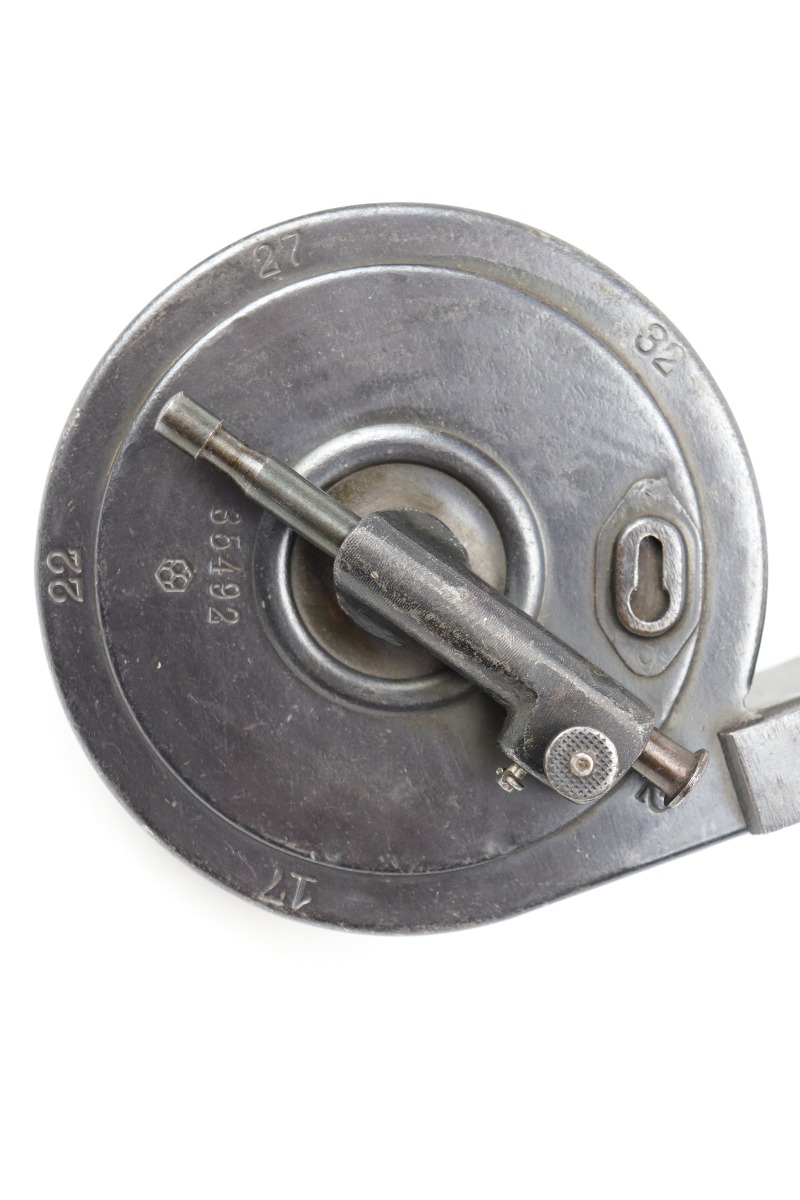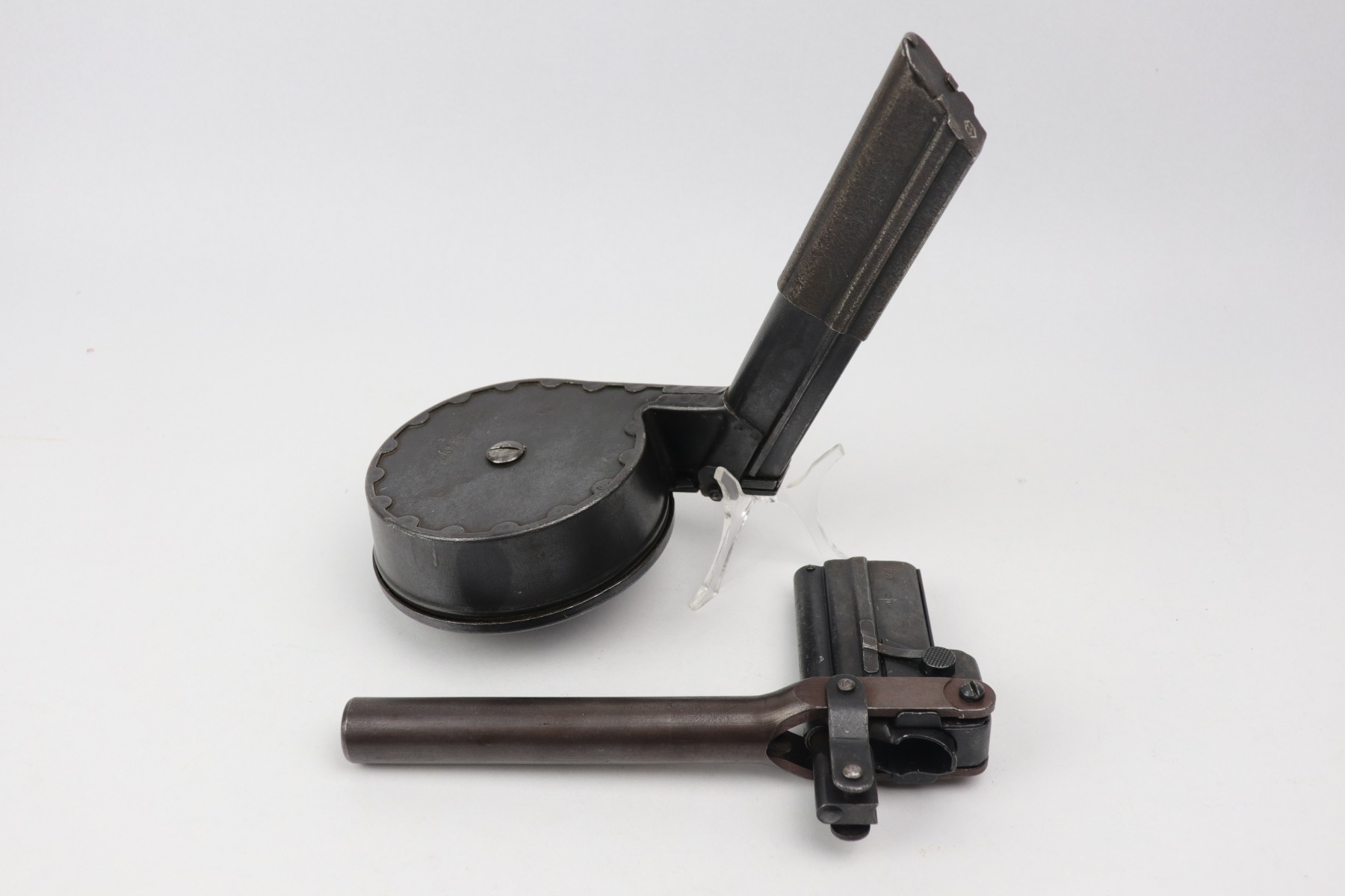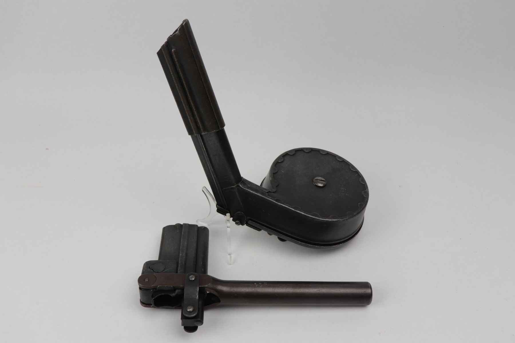 10/6/20 – This is a first model artillery luger snail drum magazine, complete with dust cover and a reproduction loader. The drum seems to be working well and in great overall condition. It is the original drum with dust cover- both marked with the “soccer ball” logo. This is the more scarce, and far more desirable manufacturer, with Bing being much more common. The speed loader is believed to be an excellent quality reproduction. All 3 items included in this listing, priced to sell.