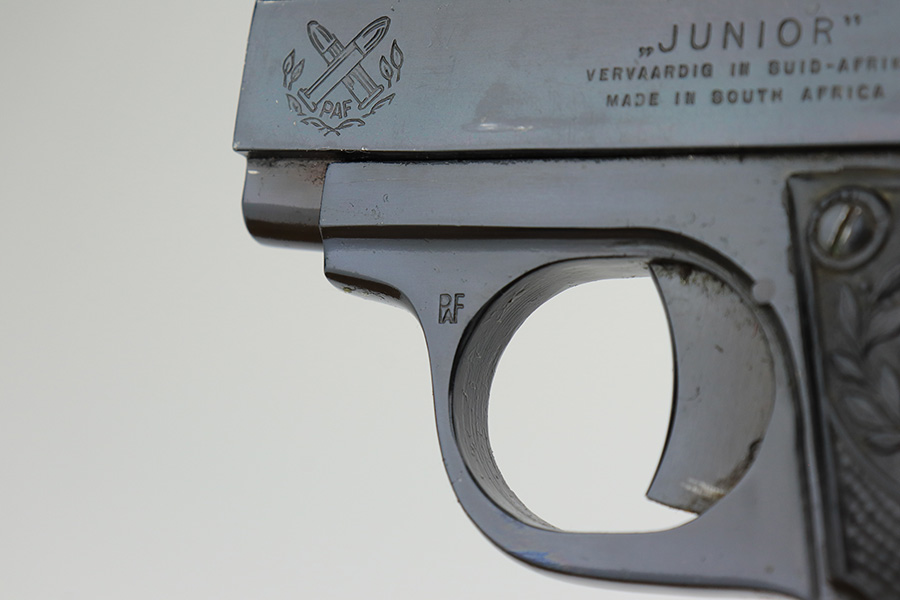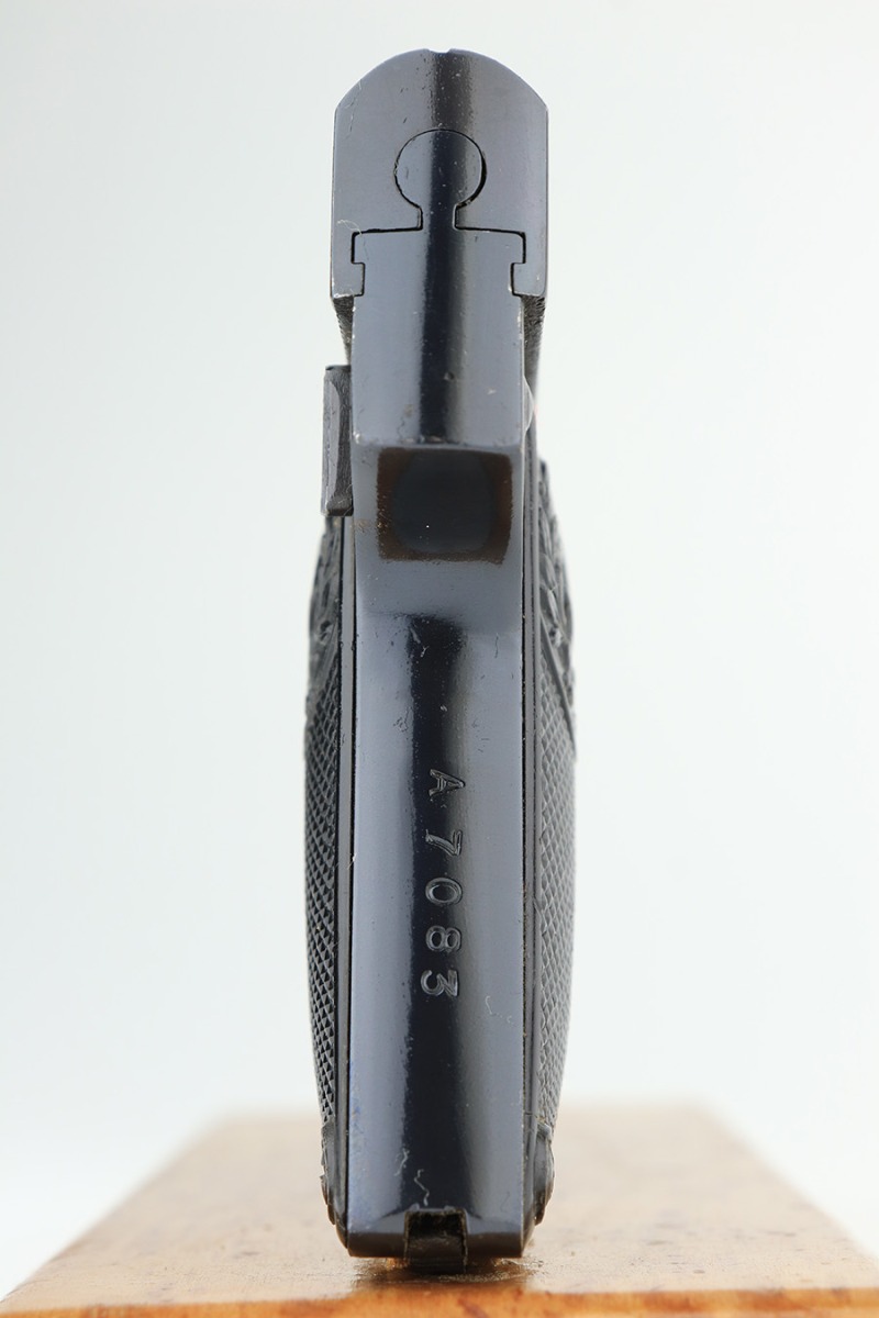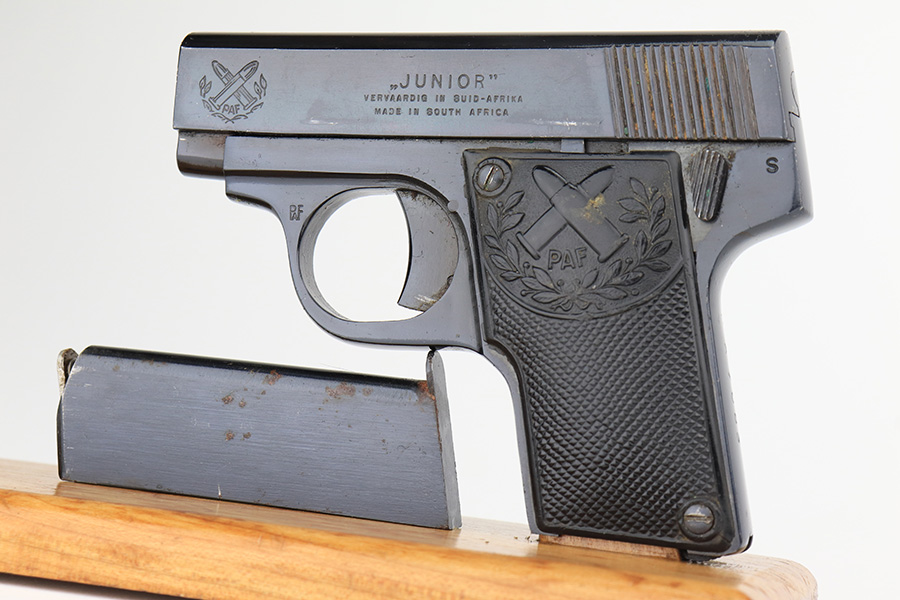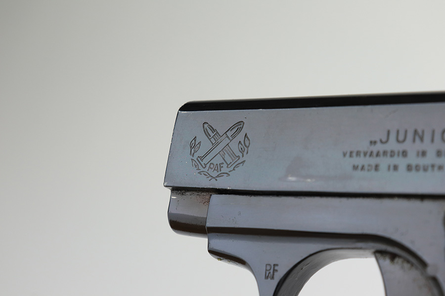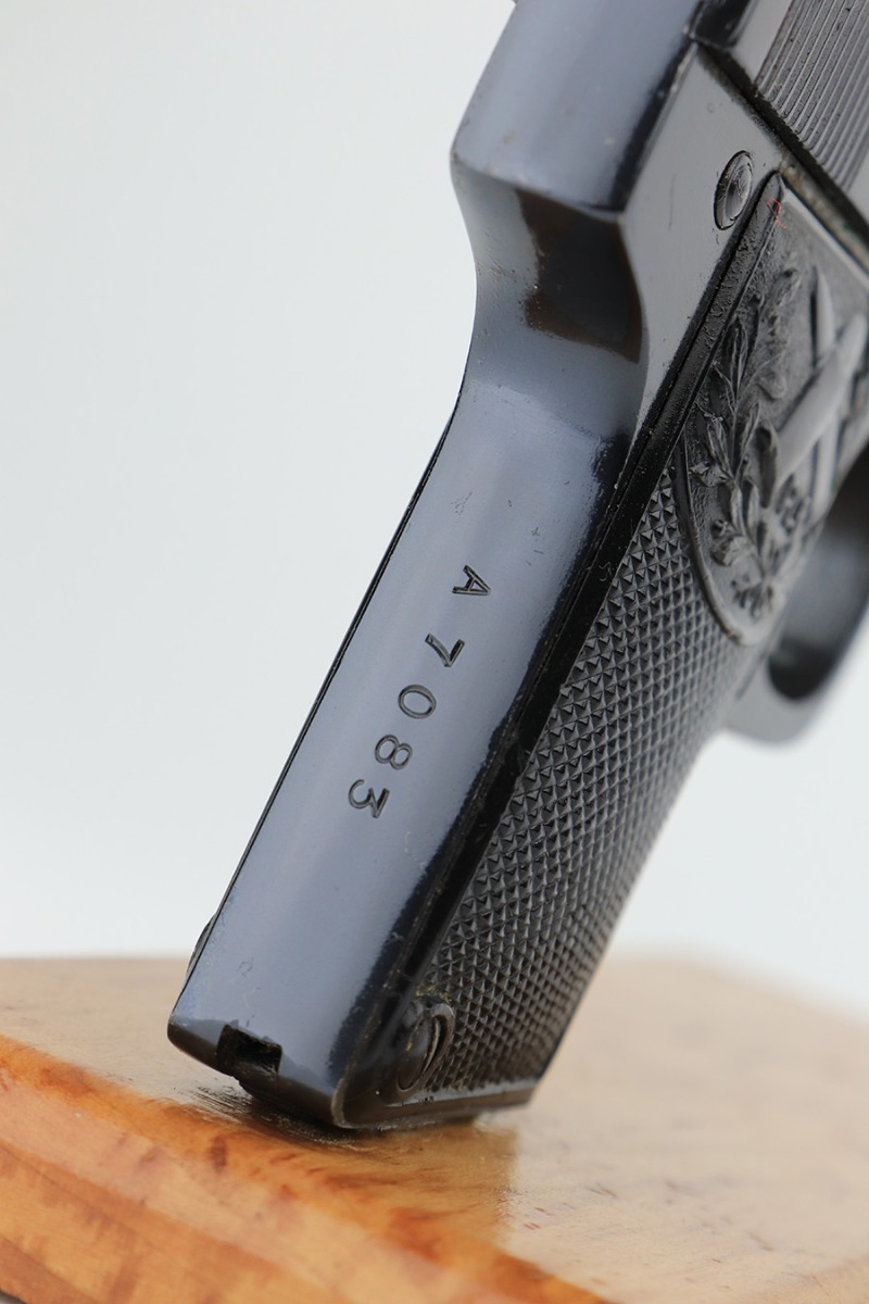 2/27/23 – This is a rare Pretoria Arms Factory “Junior” model pistol, the first commercially produced firearm in South Africa. They were only made from 1954-57, with about 10,000 produced. This one is in near-mint condition with just a spot of wear on the right side of the slide. Excellent bore. The grips are original and show minor handling wear but no major cracks. More info on their history here: https://unblinkingeye.com/Guns/PAF/paf.html