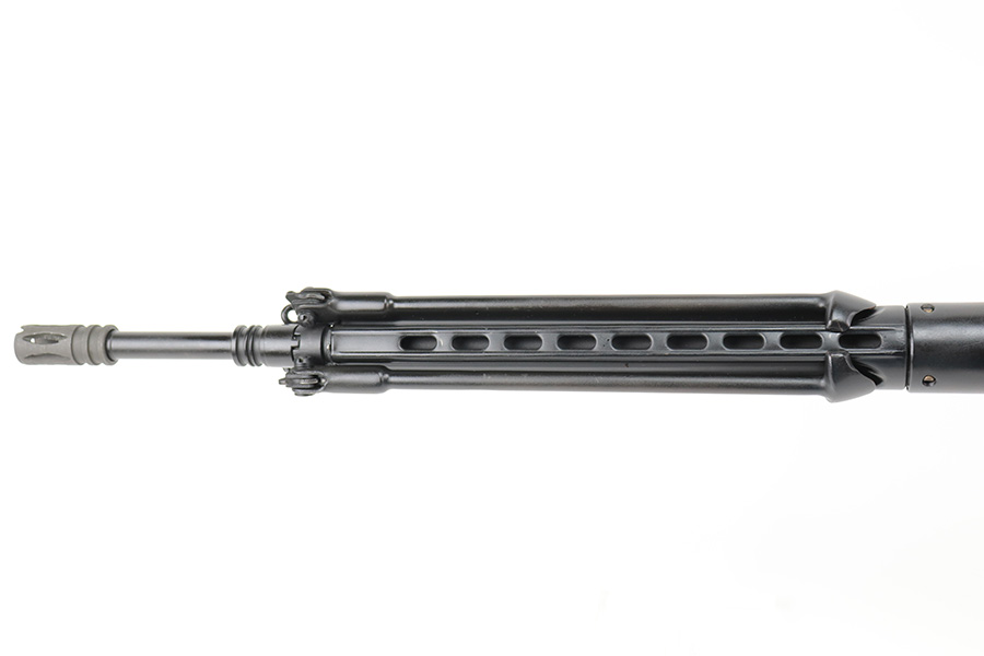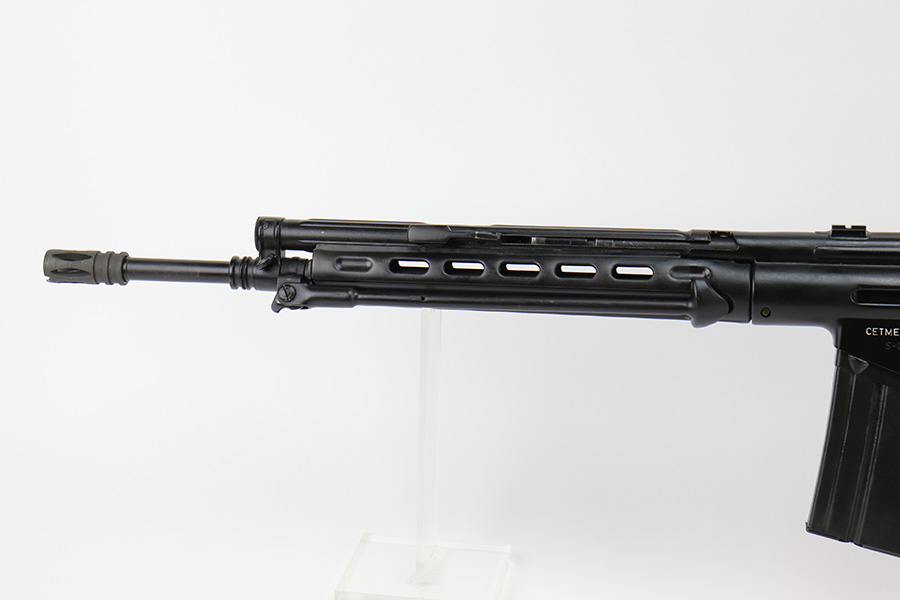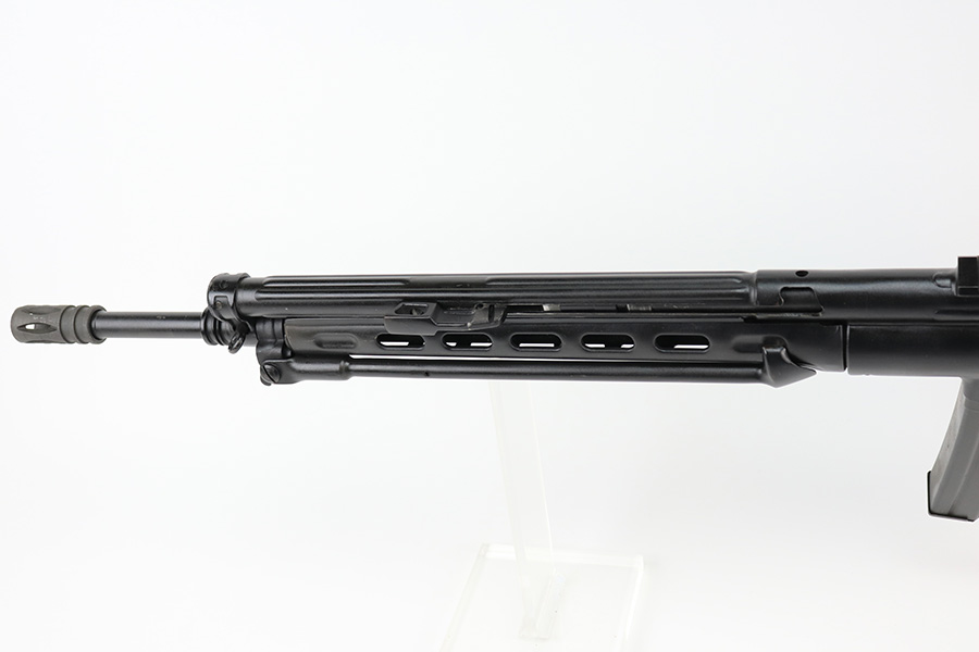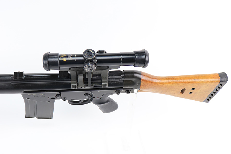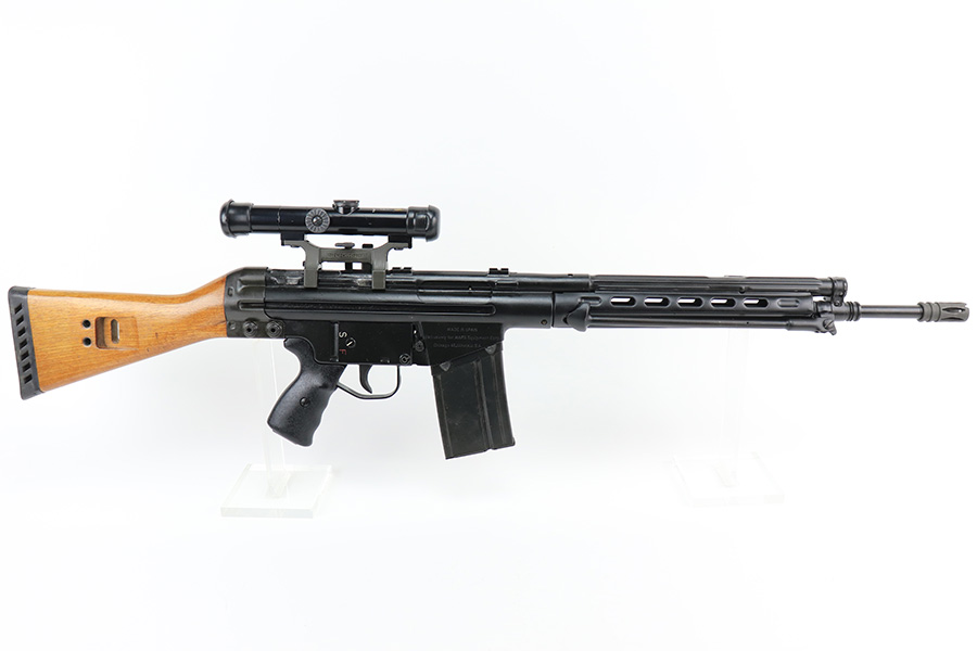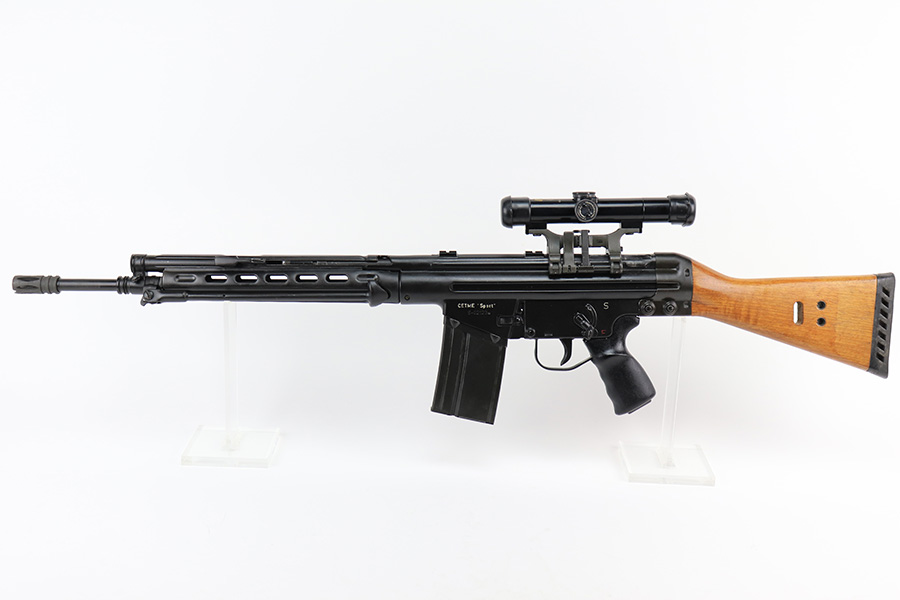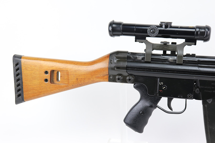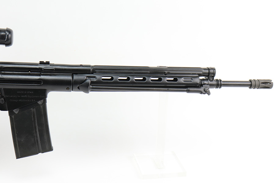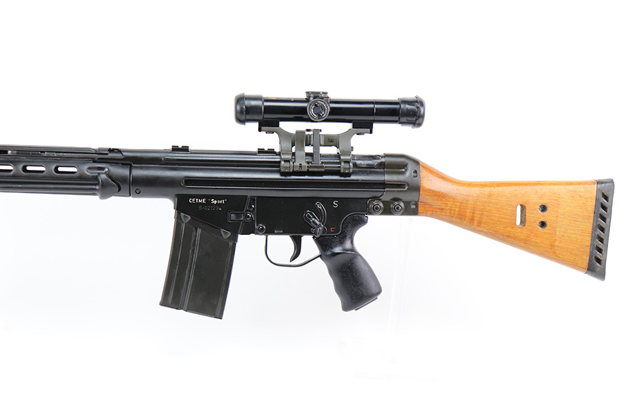 6/10/24 – This is a very rare MARS Cetme Sport rifle in terrific, original condition. These are considered to be a progenitor of the Heckler & Koch family of assault rifles, and the only true CETME that was imported into the US in the mid-1960s. When H&K designed their first assault rifle in the late fifties, they were not able to get a government contract in West Germany, and approached the Spanish arms manufacturer CETME and entered into a contract to produce a newly designed Cetme Model 58 in Spain. The design was based on the experimental Nazi Stg 45 rifle, and was eventually chambered in the standard NATO caliber. A semi-auto version was imported in very limited numbers (several hundred at most) by the Mars company, and this is a great example of those rare rifles. I has the early metal bipod handguard, with excellent Hensoldt scope. Shaved sights to accommodate the scope. Most oft the wear is along the top of the receiver, likely from adjustment of the scope mount. Terrific bore and stock. C&R eligible.