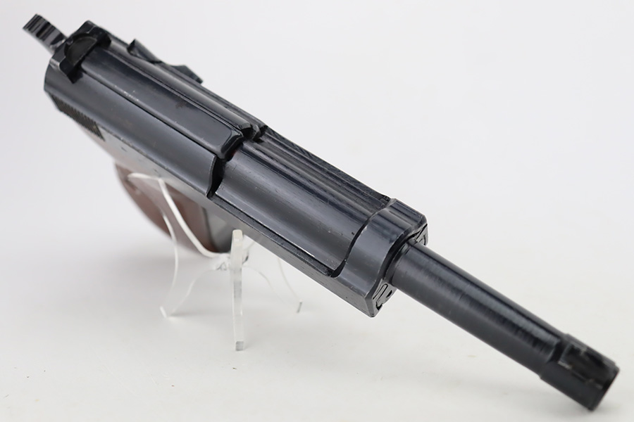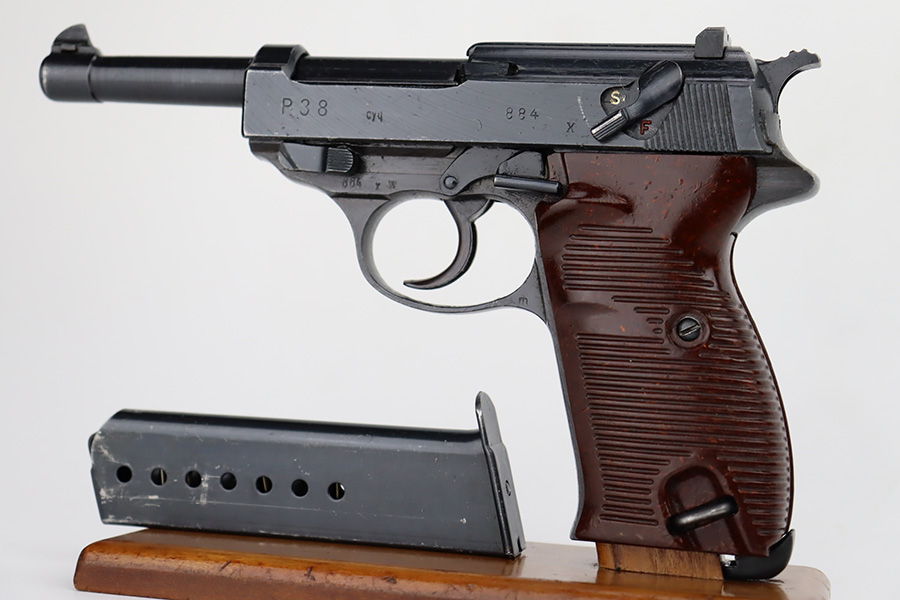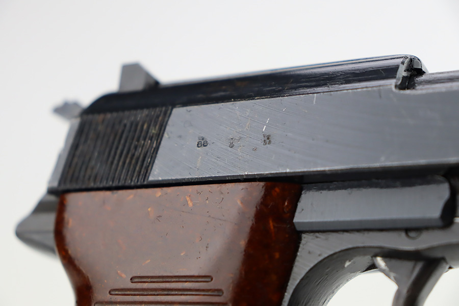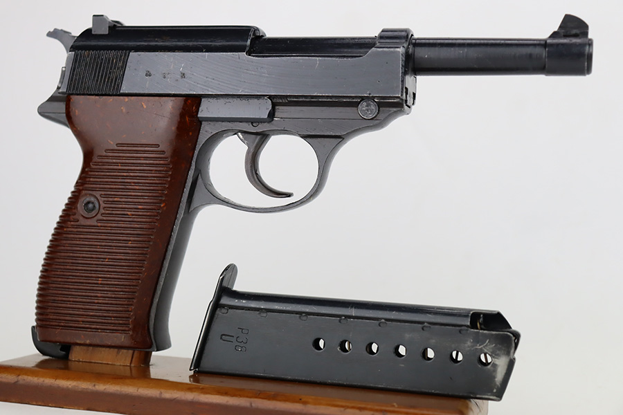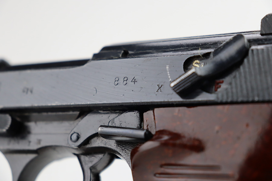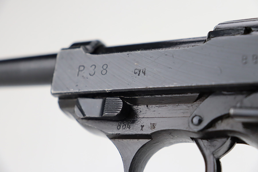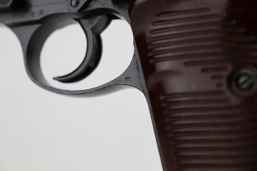 10/12/23 – This is a rare Spreewerk P.38 from December of 1944 with FN-produced frame. There were only 1,200 of this variation produced, from 400x-1600x serial range. This can be identified by the ‘m’ on the frame, and this one is a less common subvariation that still has an E/88 proof on frame. This particular example is all matching and original with 97-98% of the blue remaining. Minor high edge wear on the muzzle and front edge of slide, and light thinning of the front strap. Minty bore. Excellent red grips with no cracks. De-cocker is functional. Late-war mag with large ‘U’ on body.