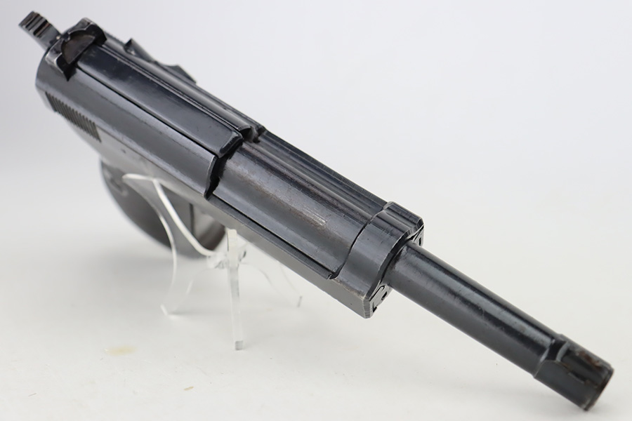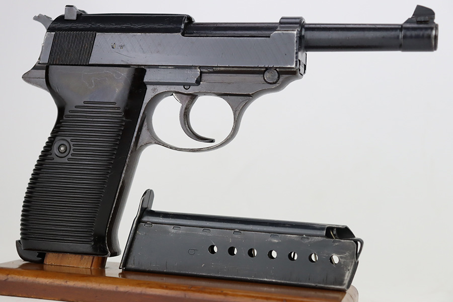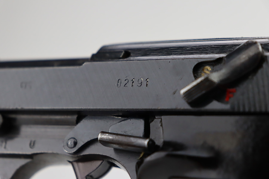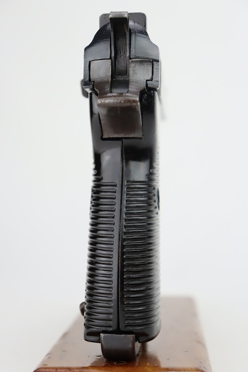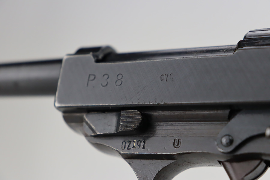 10/12/23 – This is an excellent example of a rare zero-series Spreewerk P.38 manufactured in 1945. It is all matching and has the proper “U” proofs. It has retained about 95% of its original finish. There is minor wear around the muzzle and front edges of the slide. Some thinning and patina on the front strap. Comes with excellent grips. Magazine is marked with a ‘b’ on the body, and E/88 on spine. The bore is shiny with strong rifling with minor freckling in the grooves. De-cocker is functional.