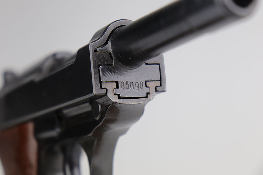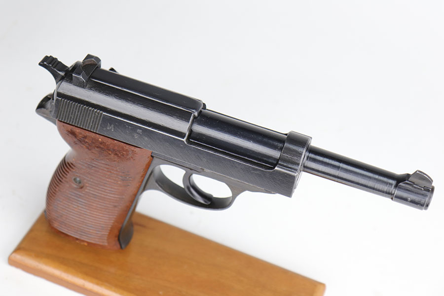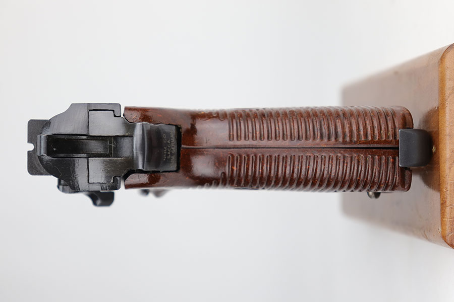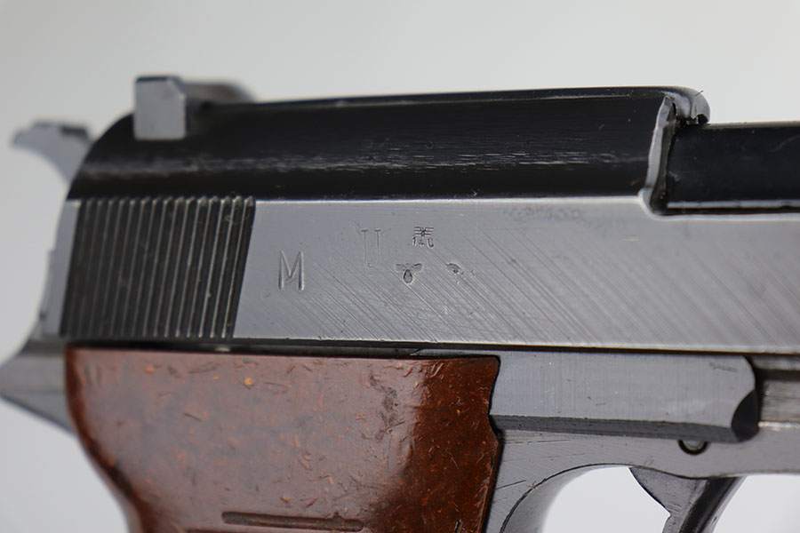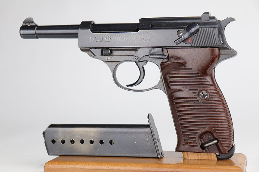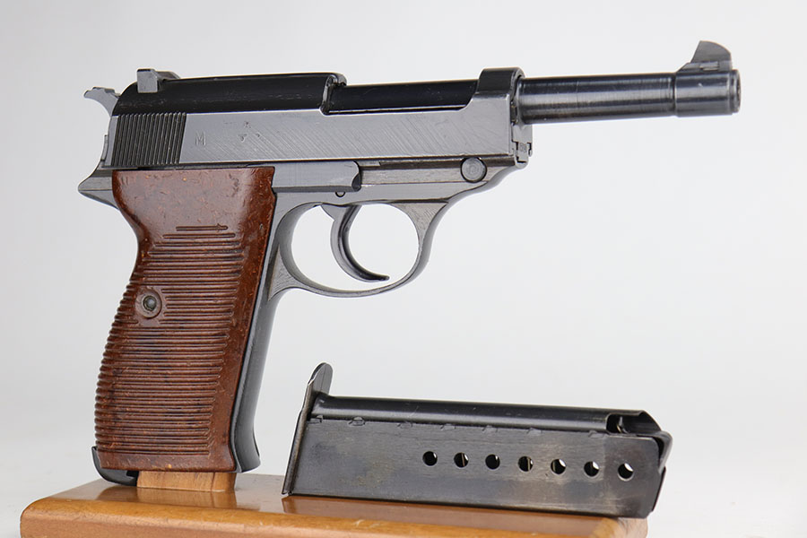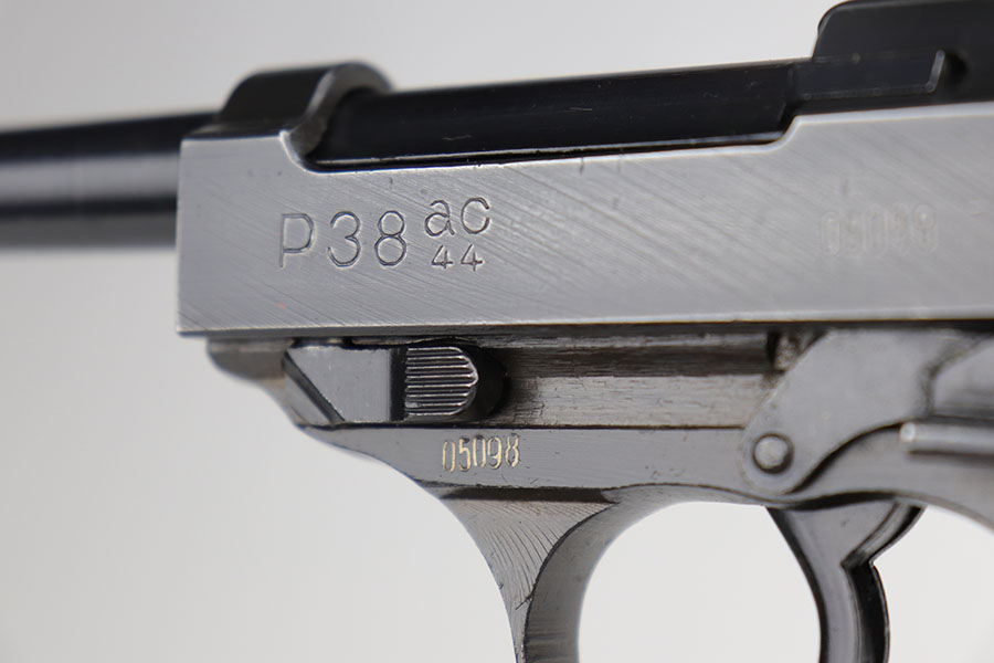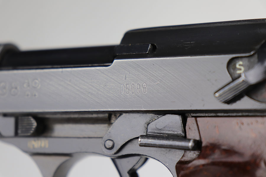 10/7/20 – This is a super rare Spreewerk P.38 from the end of the war with FN slide. There were only about 600 of this variation produced with large ‘ac 44’ proof on slide and zero series numbering. The frame is otherwise unmarked, while the barrel is ‘cyq’ marked and the slide has the large ‘M’, ‘U’, and E/140 proof. All matching numbers and original parts. The bluing is excellent with some thinning on the slide but we do believe that the gun was either reblued or dipped and then later cleaned up, which is pretty common for these end of war guns. Mint bore and excellent red grips. Good mechanics, including de-cocker. Import mark under the tang.