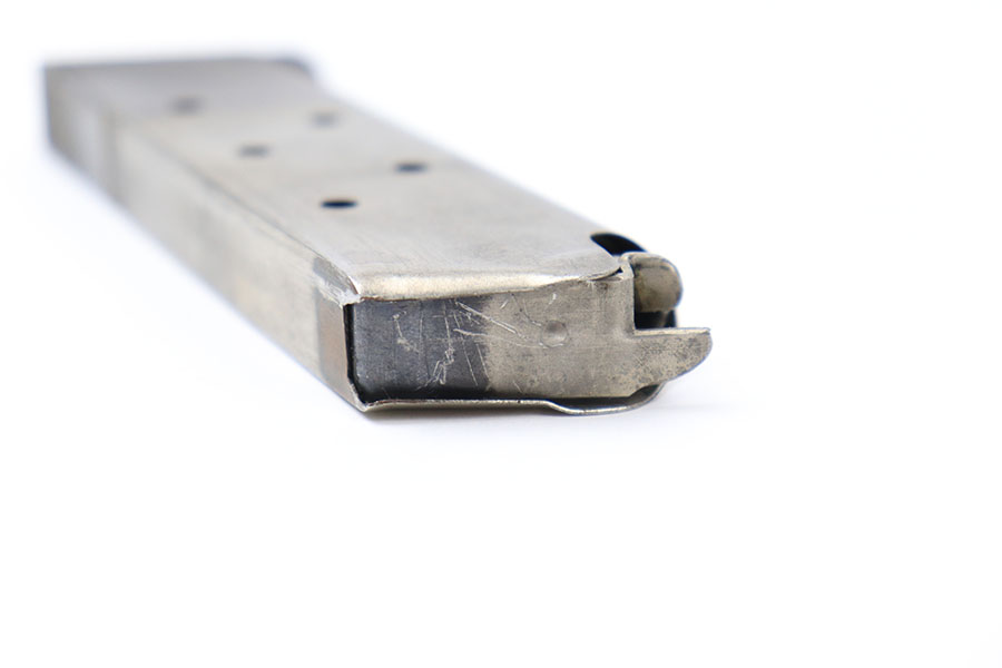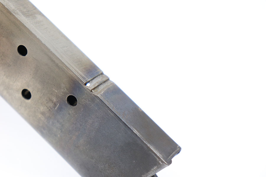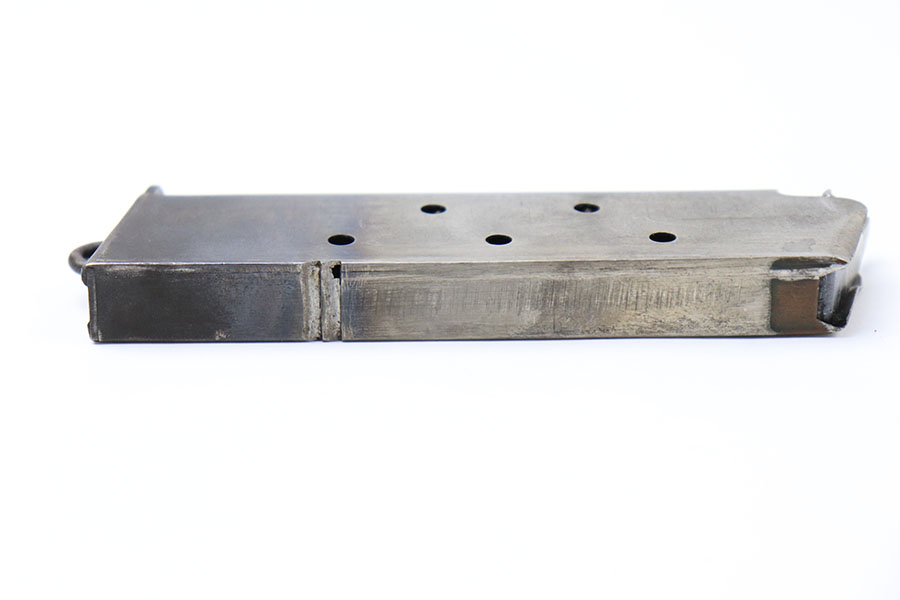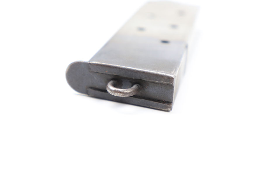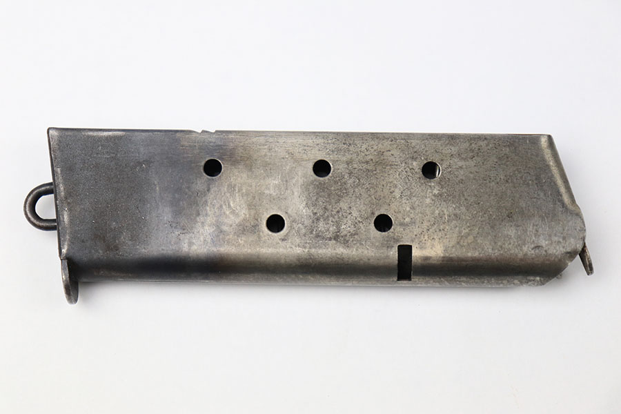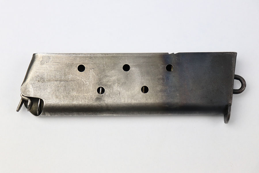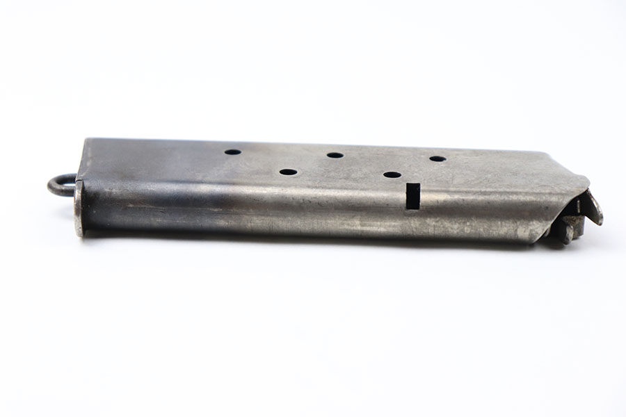 8/18/21 – This is a very scarce Springfield 1911 magazine from WW1. The magazine has a two-toned finish and crimped metal that folds over the base of the magazine. The magazine also features a lanyard loop. Unfortunately there are two cuts in the back spine of the magazine, and we’re not sure why. This isn’t factory, but likely someone found this to help the functionality of the magazine. There’s some mild patina throughout the magazine, but the spring is strong and functional. The cuts in the back metal don’t affect functionality.