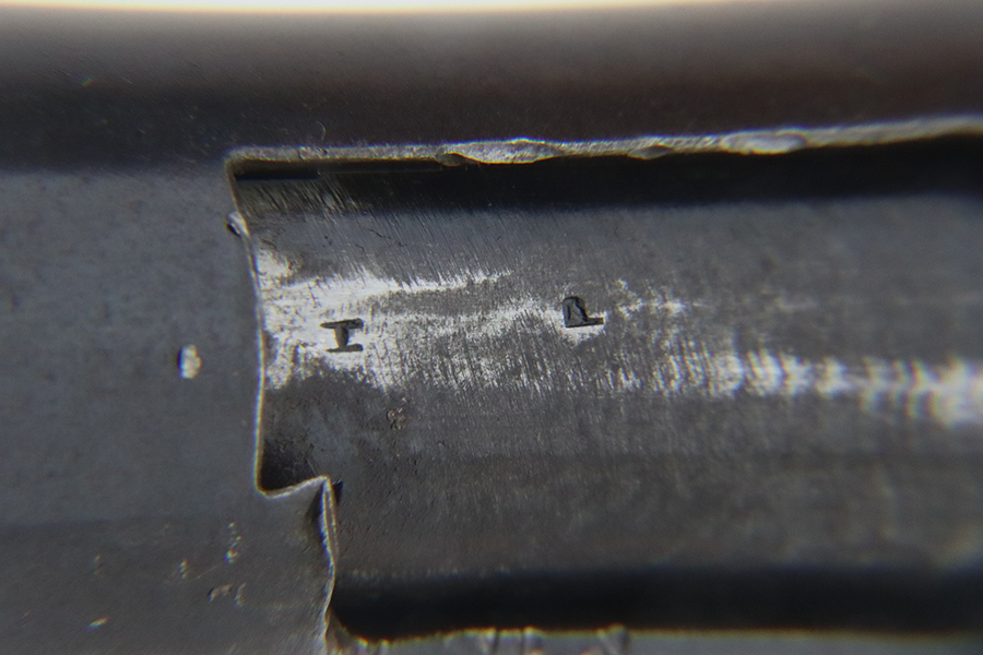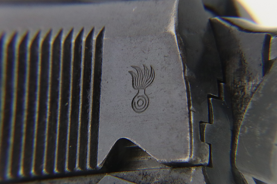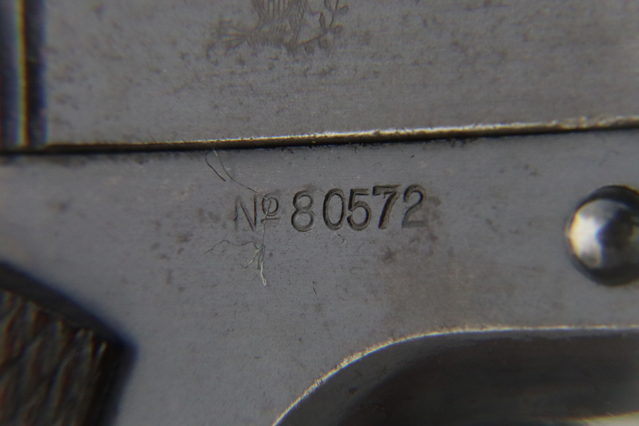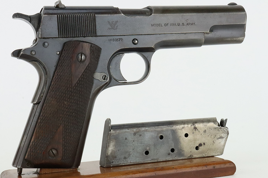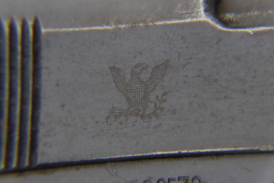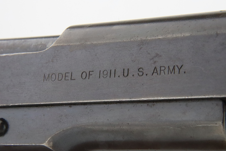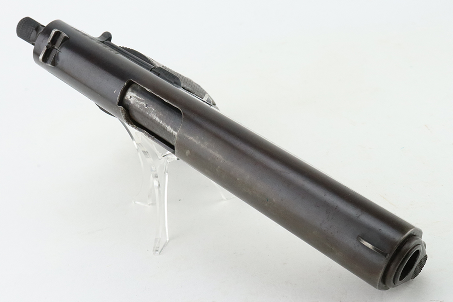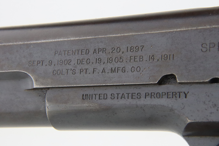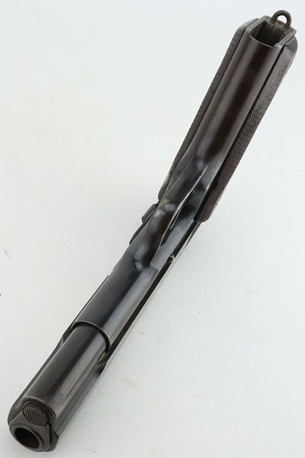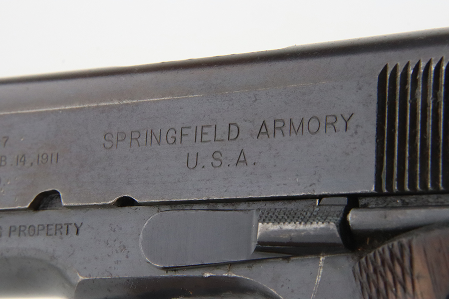 2/27/24 – This is a rare military 1911, made at Springfield Armory. One of only ~30k produced at Springfield for WW1. Many original “S” marked parts, except for the barrel which is an “H P” Colt barrel. The finish rates somewhere between 85-90%. While there isn’t a ton of actual finish loss, there is noticeable brown attic patina throughout. Fitted with period-correct wood grips and comes with a proper two-tone magazine. The bore has great rifling, but there is light spotty surface oxidation throughout – might clean up nice.