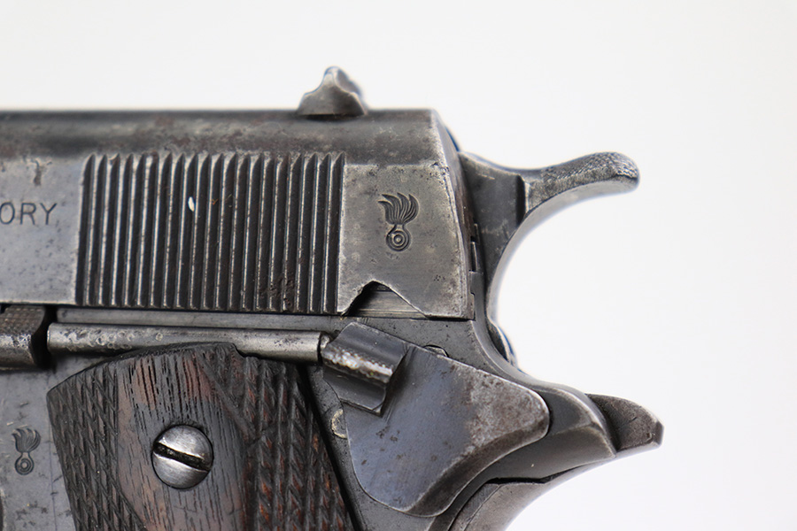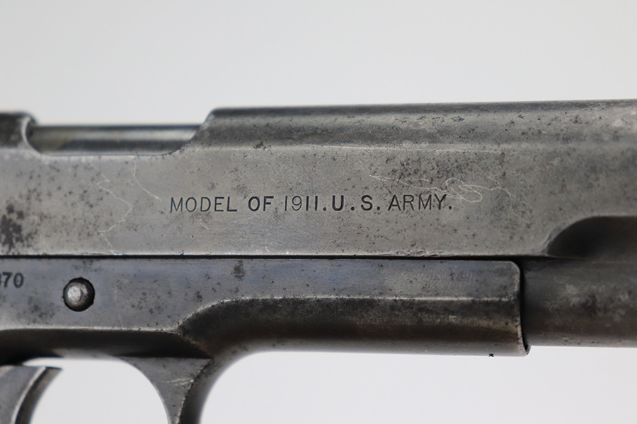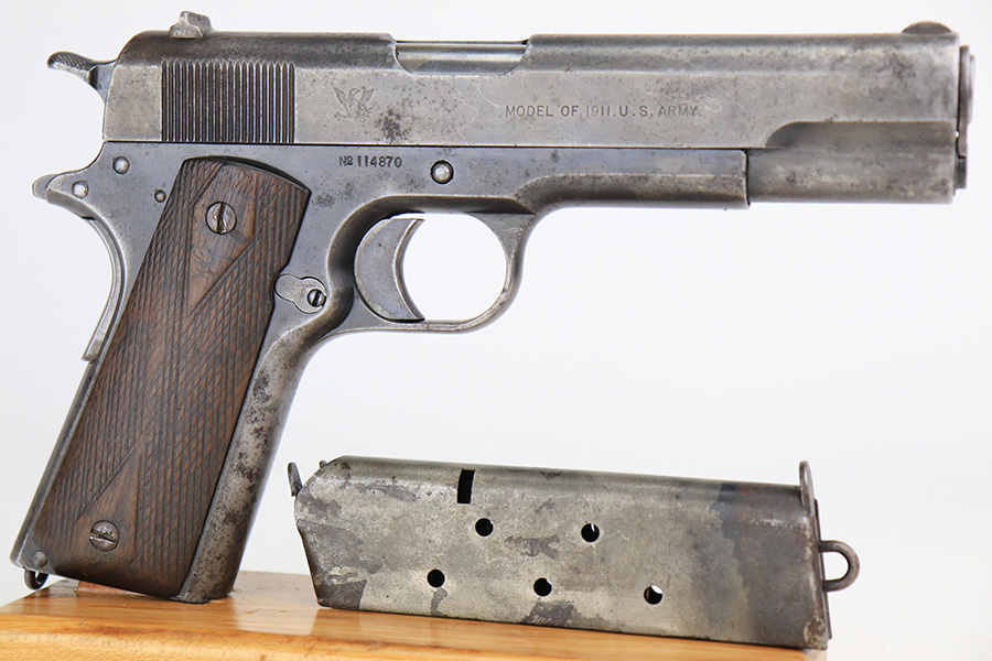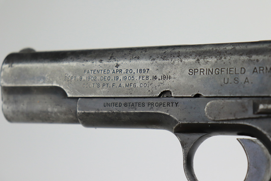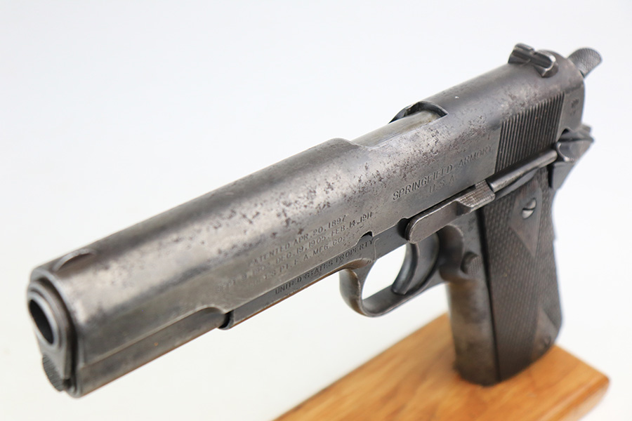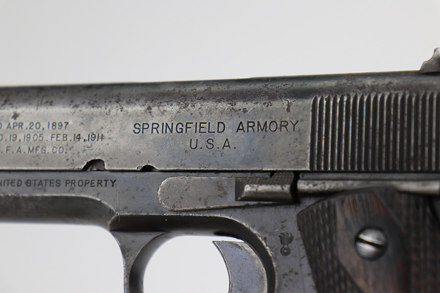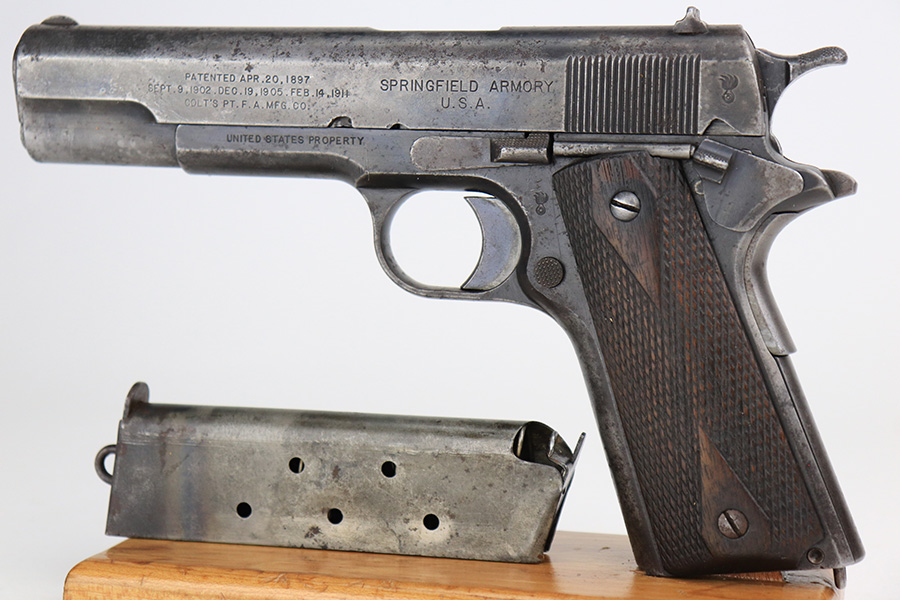 4/27/22 – This is a nice example of a rare Springfield Armory Model 1911 issued to the US military during WW1. It is “United States Property” marked, has the proper Springfield Eagle on the right side of the slide, and has flaming bomb military acceptance proofs. The small parts are properly “S” marked, and it has a correct Springfield barrel. The gun has retained roughly 25% of its original finish. There is obvious finish loss, spotty oxidation, and areas of pin-pricking throughout. The only remaining finish is mainly on the sides of the frame. Comes with fairly worn wood grips and one period-correct two-tone magazine with a lanyard loop on the bottom. The rifling in the bore is worn with tiny pits throughout.