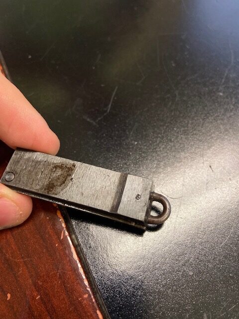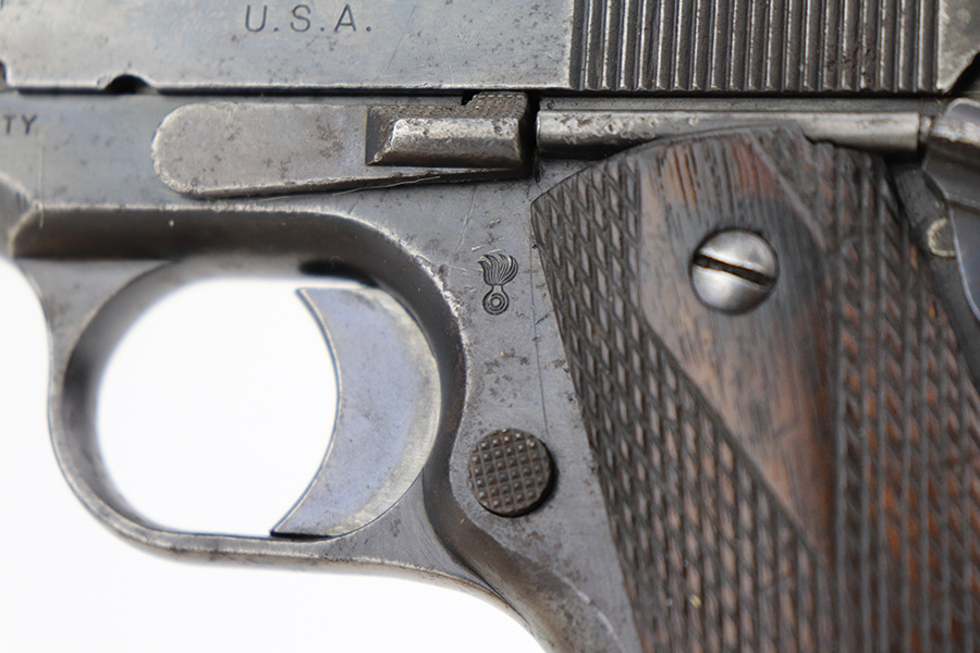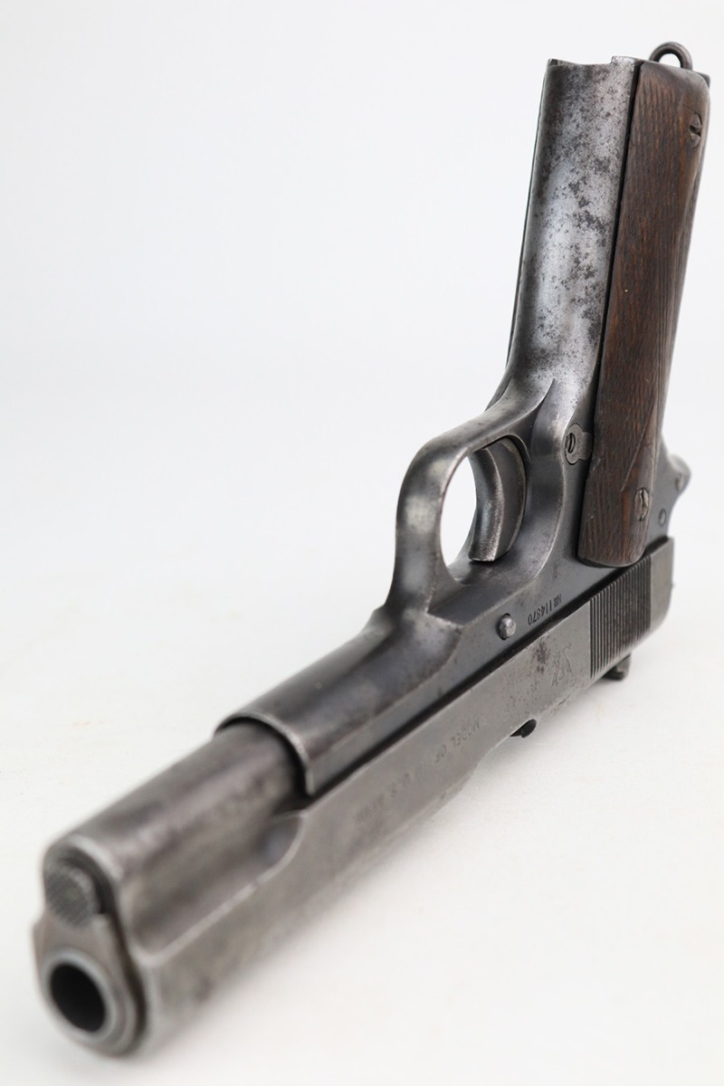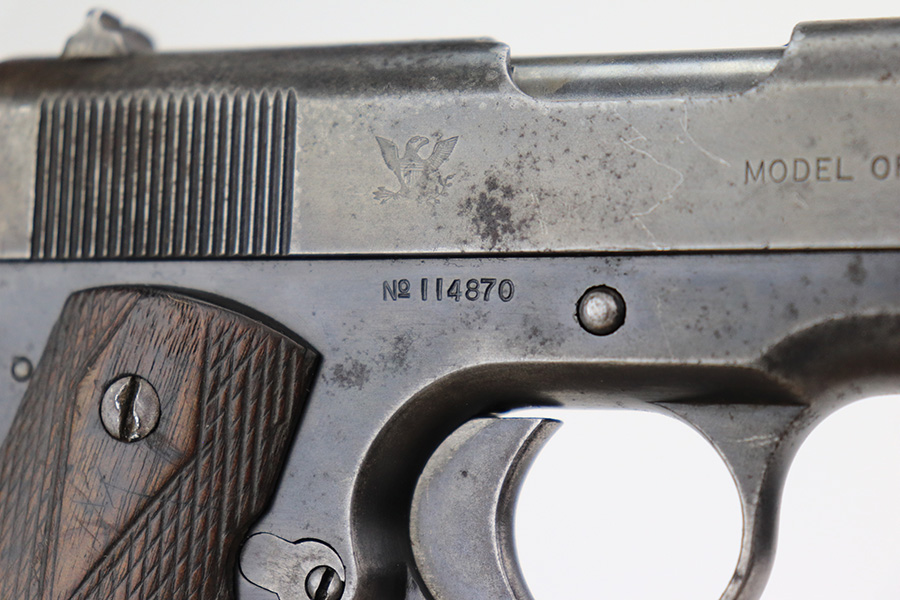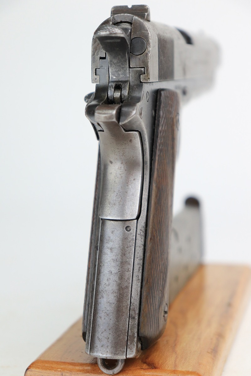 4/27/22 – This is a nice example of a rare Springfield Armory Model 1911 issued to the US military during WW1. It is “United States Property” marked, has the proper Springfield Eagle on the right side of the slide, and has flaming bomb military acceptance proofs. The small parts are properly “S” marked, and it has a correct Springfield barrel. The gun has retained roughly 25% of its original finish. There is obvious finish loss, spotty oxidation, and areas of pin-pricking throughout. The only remaining finish is mainly on the sides of the frame. Comes with fairly worn wood grips and one period-correct two-tone magazine with a lanyard loop on the bottom. The rifling in the bore is worn with tiny pits throughout.