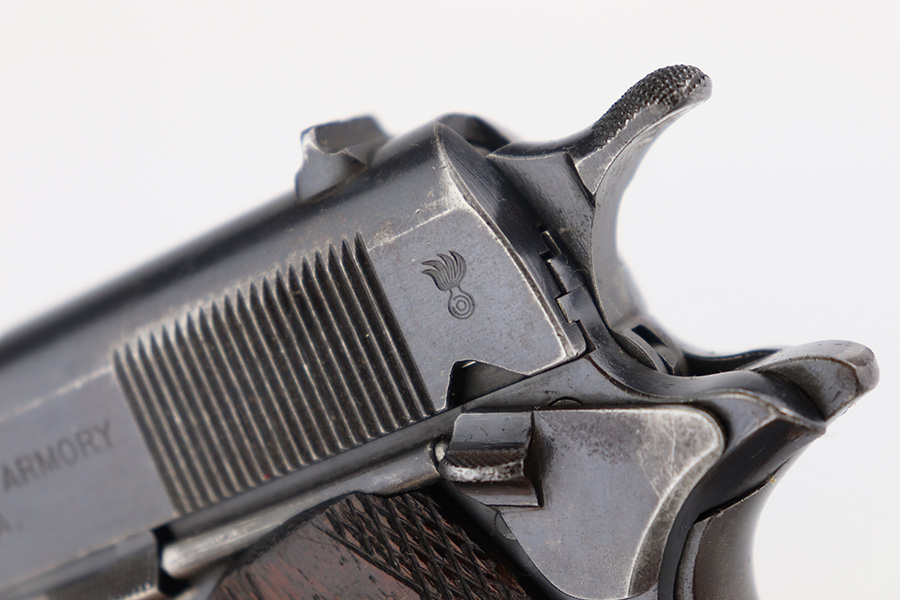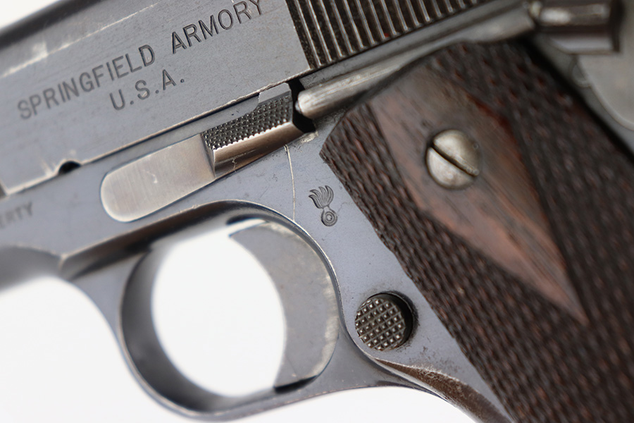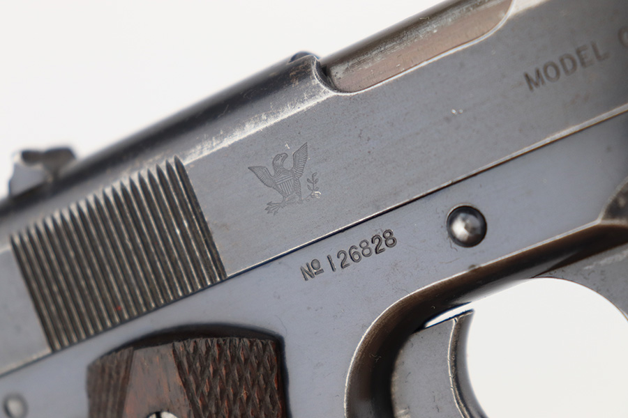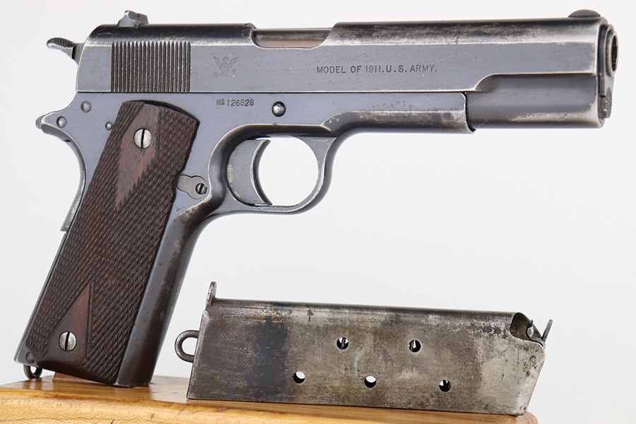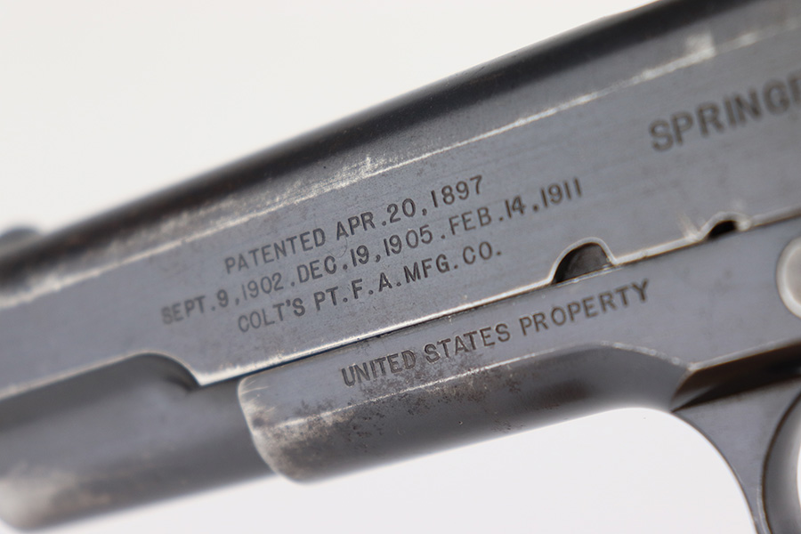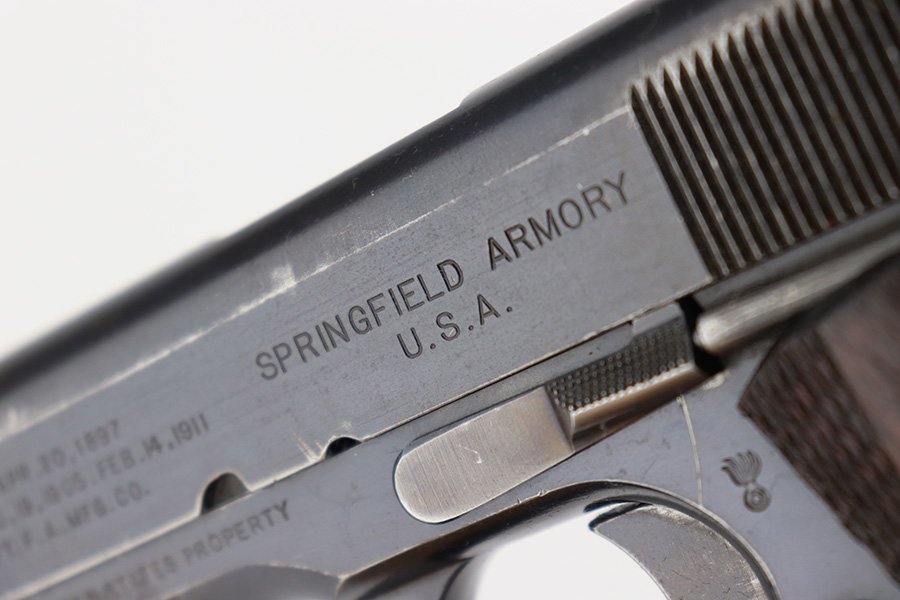 11/29/22 – This is a very nice example of a rare Springfield Armory Model 1911 issued to the US military during WW1. It is “United States Property” marked, has the proper Springfield Eagle on the right side of the slide, and has flaming bomb military acceptance proofs. Most of the small parts are properly “S” marked, and it has a correct Springfield barrel. The slide release and barrel bushing are un-marked. The gun has retained roughly 75% of its original finish. There are areas of obvious spotty finish loss around the muzzle and along the slide, concentrated mostly around the high edges. There is also spotty wear on the front strap and obvious finish loss on the back strap. Comes with fairly nice period-correct wood grips and a proper two-tone magazine with a lanyard loop on the bottom. The rifling in the bore is a bit worn with minor pitting throughout.