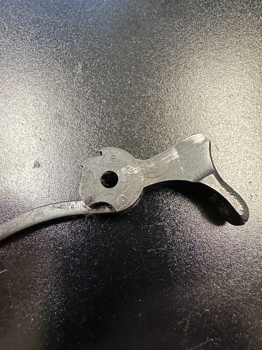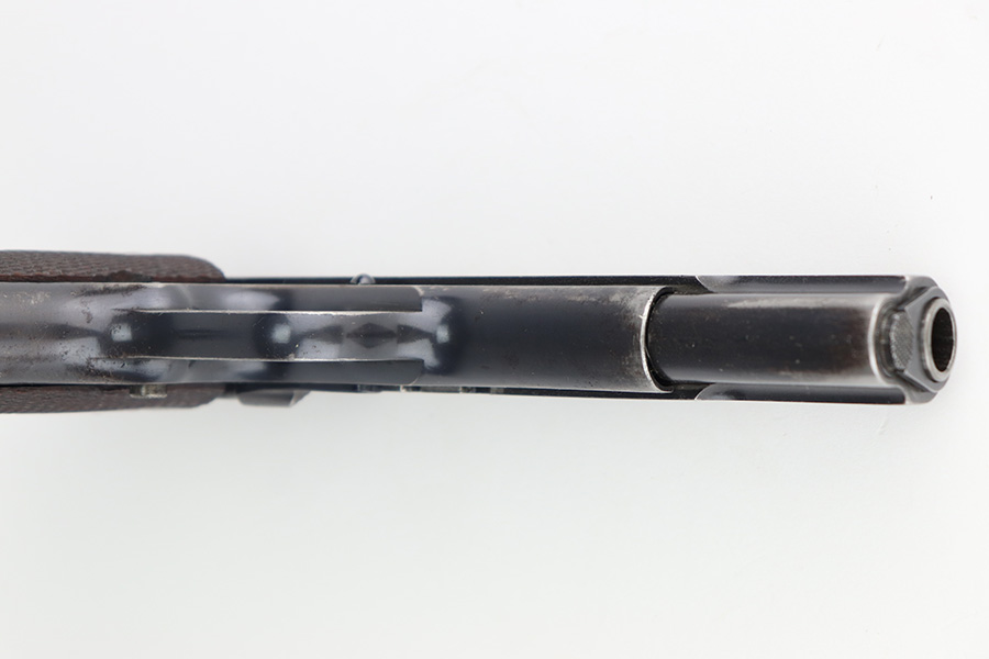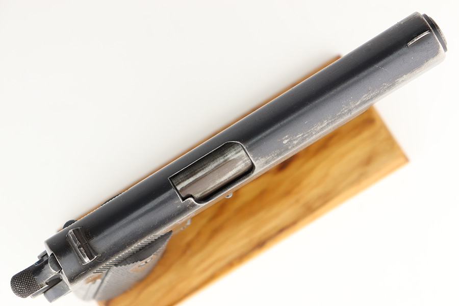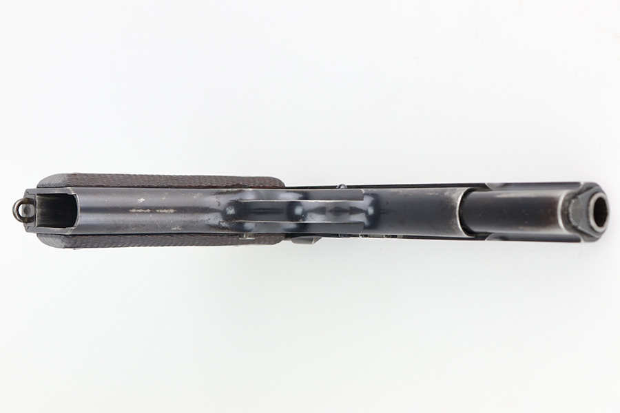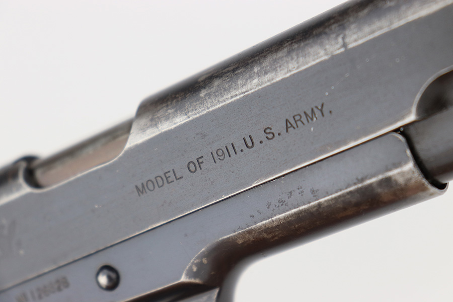 11/29/22 – This is a very nice example of a rare Springfield Armory Model 1911 issued to the US military during WW1. It is “United States Property” marked, has the proper Springfield Eagle on the right side of the slide, and has flaming bomb military acceptance proofs. Most of the small parts are properly “S” marked, and it has a correct Springfield barrel. The slide release and barrel bushing are un-marked. The gun has retained roughly 75% of its original finish. There are areas of obvious spotty finish loss around the muzzle and along the slide, concentrated mostly around the high edges. There is also spotty wear on the front strap and obvious finish loss on the back strap. Comes with fairly nice period-correct wood grips and a proper two-tone magazine with a lanyard loop on the bottom. The rifling in the bore is a bit worn with minor pitting throughout.