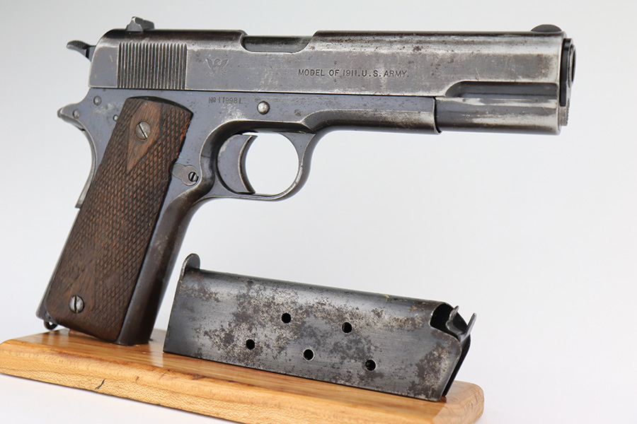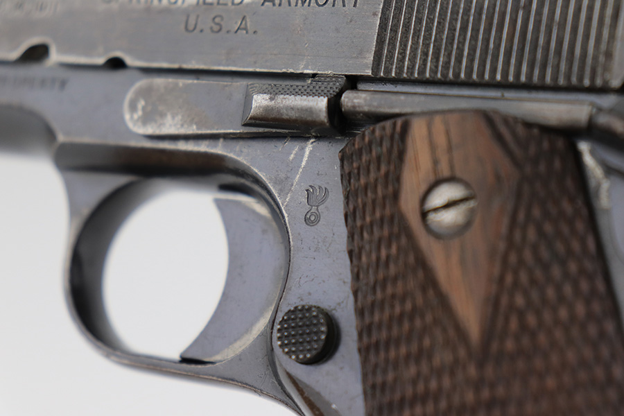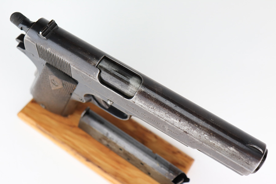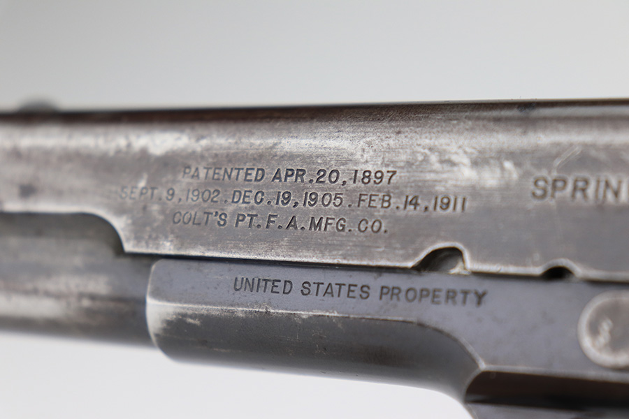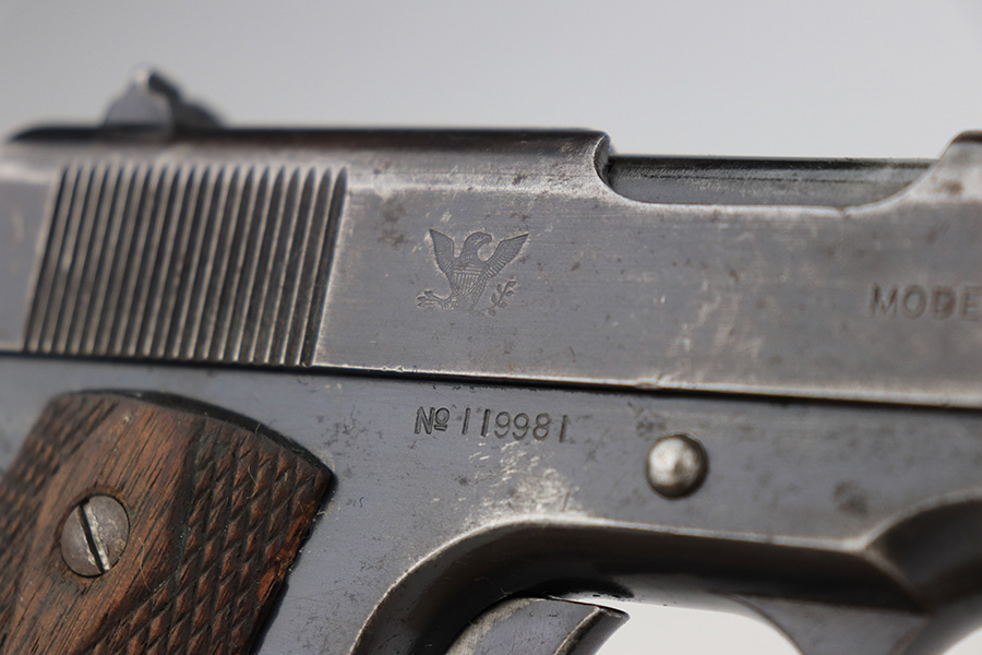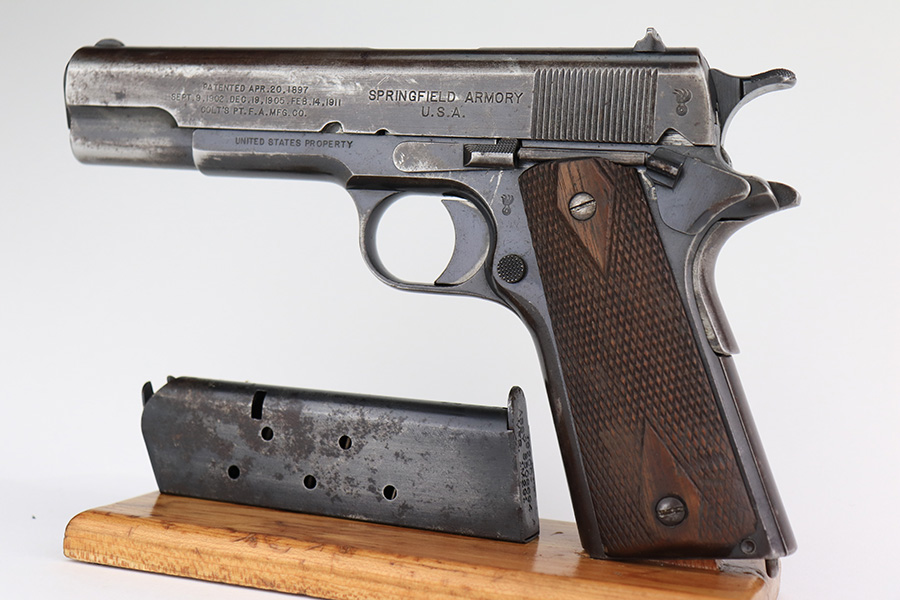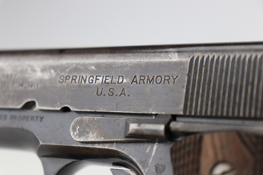 1/17/23 – This is a rare Springfield Armory Model 1911 issued to the US military during WW1. It is “United States Property” marked, has the proper Springfield Eagle on the right side of the slide, and has flaming bomb military acceptance proofs. It has a correct Springfield barrel, and the small parts are “S” marked. The gun has lost much of its original finish. The majority of the finish loss is on the grip straps and along the slide. Light spotty oxidation throughout, and light brown patina on the slide and grip straps. Fitted with slightly worn period-correct wood grips and comes with one post-war magazine. The condition of the bore is poor – the rifling is almost completely worn with minor pitting throughout.