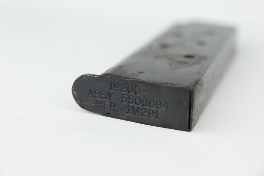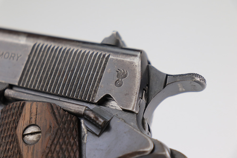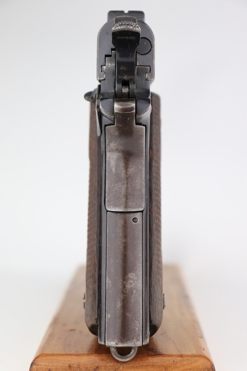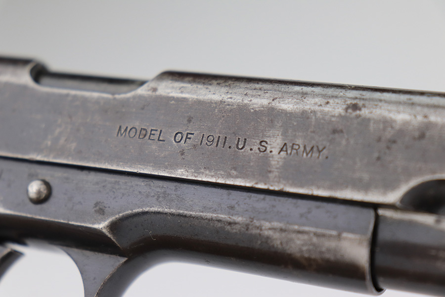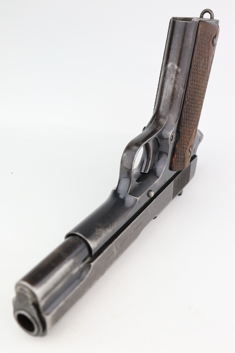 1/17/23 – This is a rare Springfield Armory Model 1911 issued to the US military during WW1. It is “United States Property” marked, has the proper Springfield Eagle on the right side of the slide, and has flaming bomb military acceptance proofs. It has a correct Springfield barrel, and the small parts are “S” marked. The gun has lost much of its original finish. The majority of the finish loss is on the grip straps and along the slide. Light spotty oxidation throughout, and light brown patina on the slide and grip straps. Fitted with slightly worn period-correct wood grips and comes with one post-war magazine. The condition of the bore is poor – the rifling is almost completely worn with minor pitting throughout.