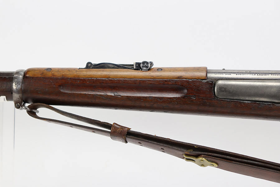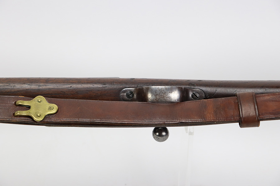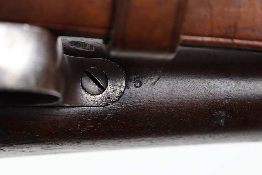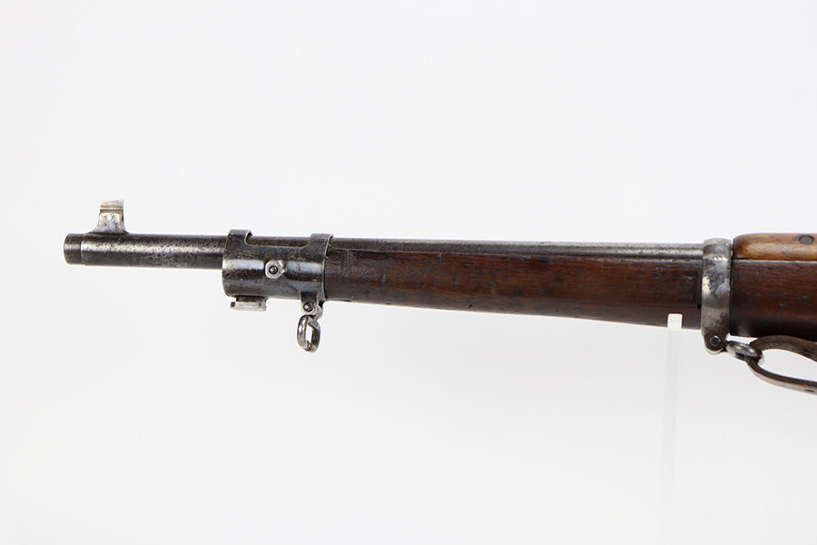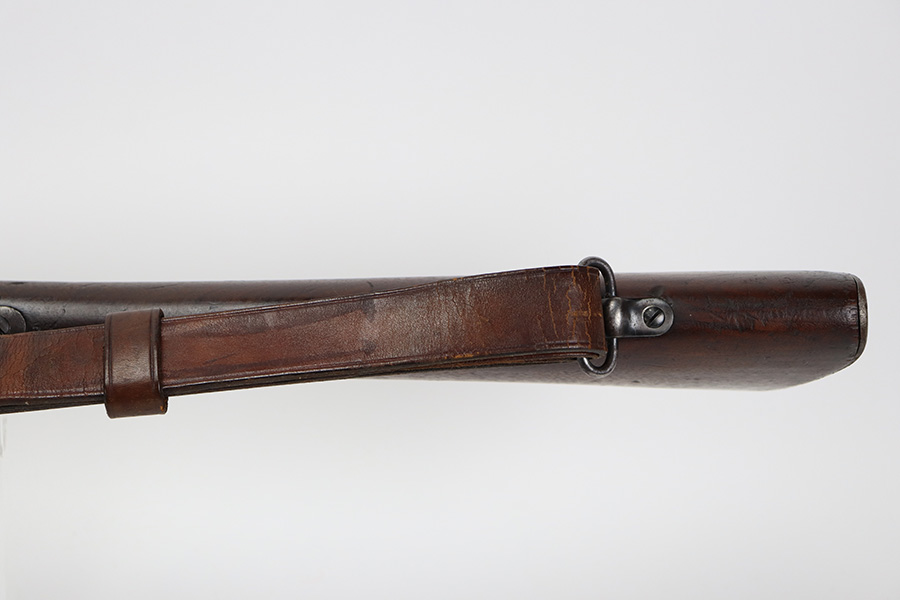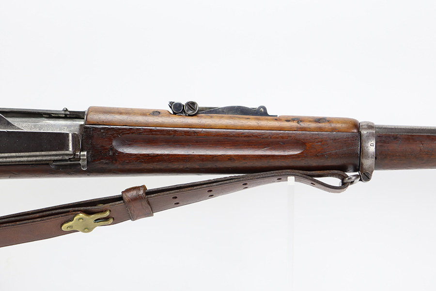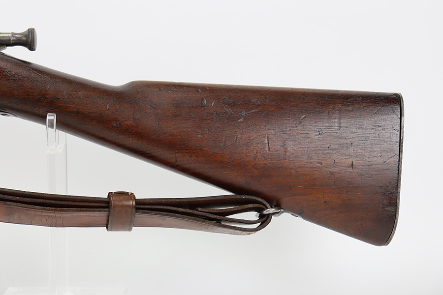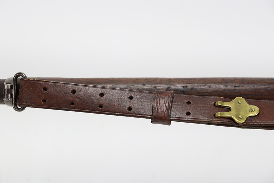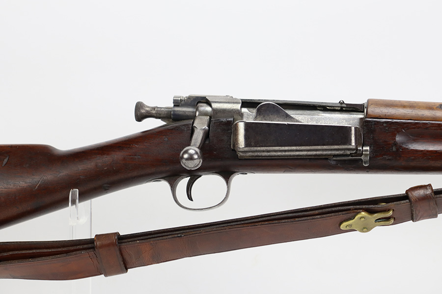 7/6/23 – Beginning in 1906, a number of 1899 Krag Carbines, along with a few 1898 Carbines, were altered for Philippine Constabulary use by fitting them with cut-down 1898 Krag rifle stocks equipped with sling swivels and bayonet lugs. The ends of the larger diameter carbine barrels were turned down with a lathe in order to permit the use of the standard bayonet. These modified Krag Carbines resembled miniature Krag rifles. These Philippine Converted Krags known today as Philippine Constabulary Rifles. This one has lost virtually all of its finish with spotty oxidation throughout. Overall, the wood furniture is in nice condition with no major damage but minor bruising throughout. Faint cartouches on the left side of the stock. The color of the upper handguard is different from the rest of the stock. The rifling in the bore is slightly worn with light pin-pricking throughout. Comes with a nice leather sling.
