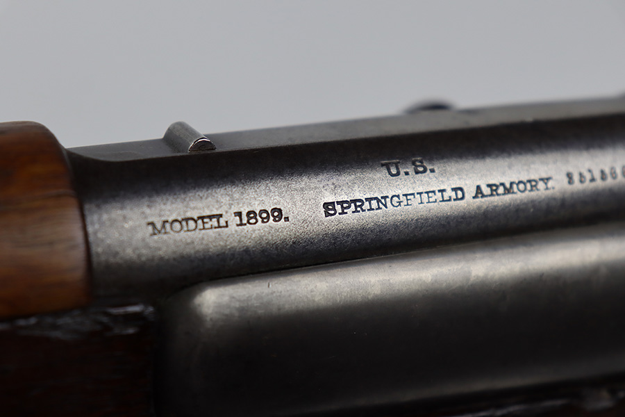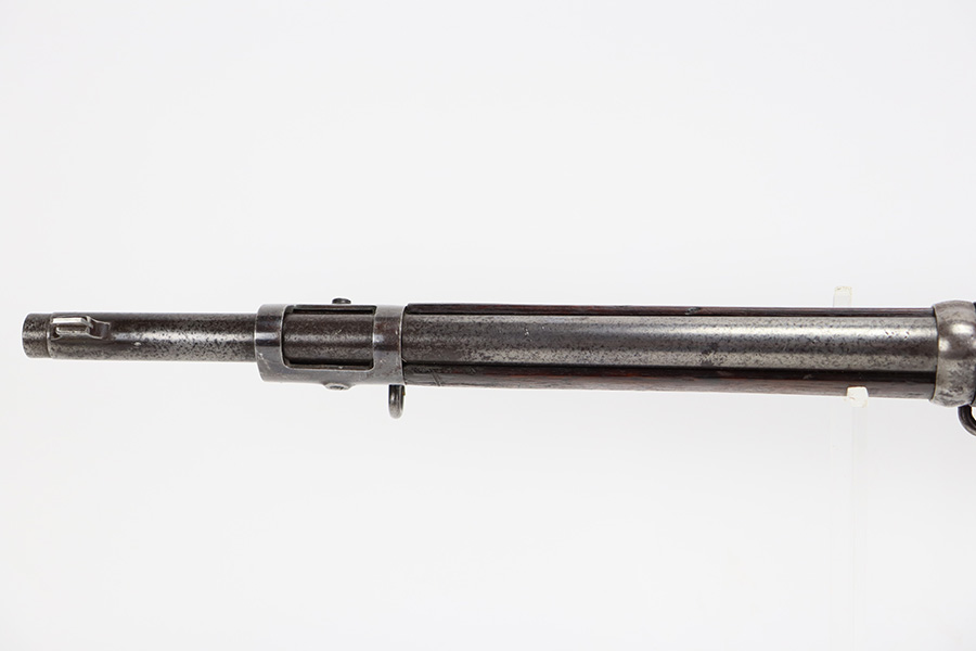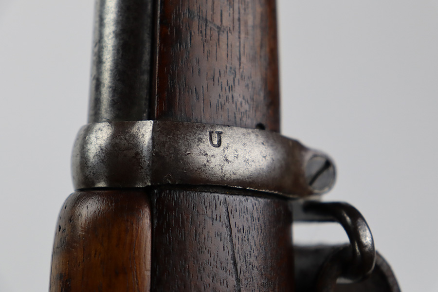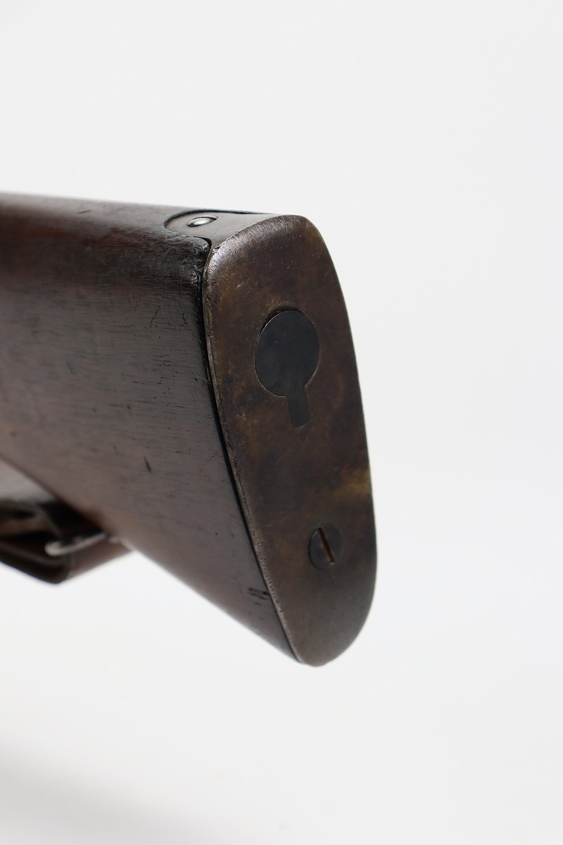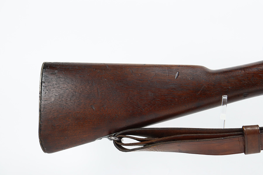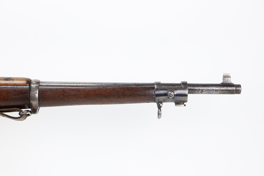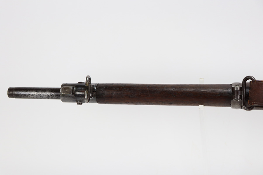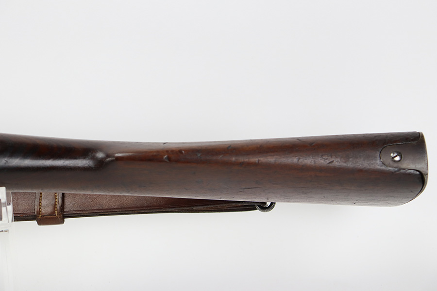 7/6/23 – Beginning in 1906, a number of 1899 Krag Carbines, along with a few 1898 Carbines, were altered for Philippine Constabulary use by fitting them with cut-down 1898 Krag rifle stocks equipped with sling swivels and bayonet lugs. The ends of the larger diameter carbine barrels were turned down with a lathe in order to permit the use of the standard bayonet. These modified Krag Carbines resembled miniature Krag rifles. These Philippine Converted Krags known today as Philippine Constabulary Rifles. This one has lost virtually all of its finish with spotty oxidation throughout. Overall, the wood furniture is in nice condition with no major damage but minor bruising throughout. Faint cartouches on the left side of the stock. The color of the upper handguard is different from the rest of the stock. The rifling in the bore is slightly worn with light pin-pricking throughout. Comes with a nice leather sling.