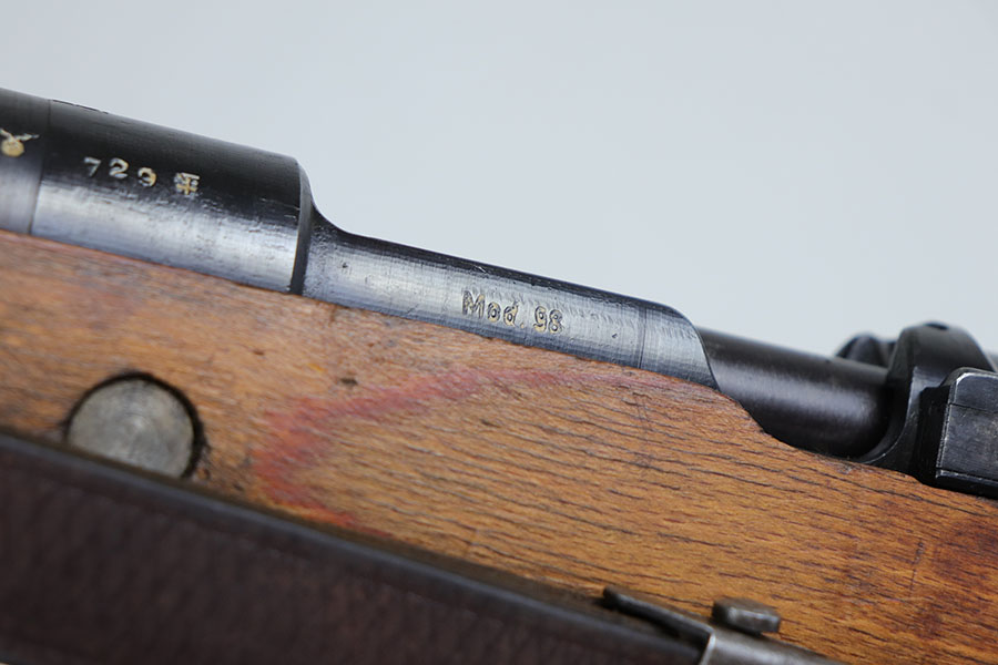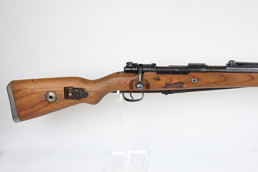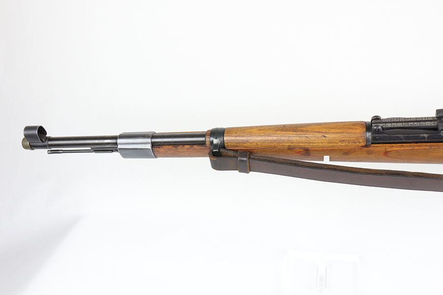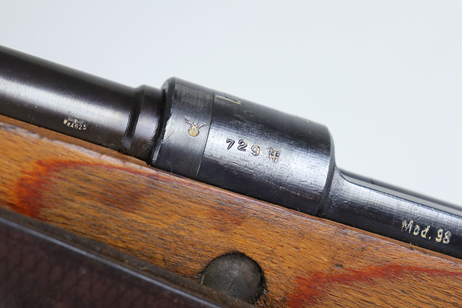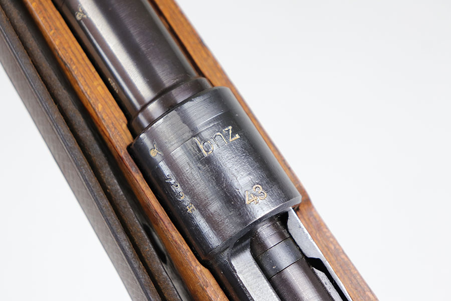 7/16/20 – This is an excellent example of a rare Steyr K98 purported to be part of an SS contract order fulfilled at Gusen camp. From Karem’s book on the 98k, these rifles were coded ‘bnz 43’ on the receiver but assembled in early 1944. The stocks were unmarked on the side and built with the oversize ‘bnz 43’ marked receiver V7 Gusen marking. The majority of the rifle was built from Radom, indicating that perhaps the SS parts production at the Gusen camp was unable to keep up with the 10,000 rifle per month production rate. The right side of the receiver has no waffenamt which is typical for receivers made at Gusen with the 1943 date. The bolt is matching and numbered in the SS contract style with 4 digit serial on bolt root and safety. The balance of the bolt components are unmarked and unnumbered. At this point, all parts coming from Radom were marked E/77 so blank components were made at Gusen. The front and rear bands are milled and unmarked, which is correct. Rear sight components are matching numbered and Radom made. Barrel has WaA623 proof for Steyr. Floorplate and trigger guard are E/77 marked. Stock appears to have an E/623 inspection stamp on underside. The finish on the metal parts is excellent only a couple minor areas of pinpricking and a bit of finish loss on the trigger guard and bolt release latch. Mint bore. Original sling, sight hood, cleaning rod are all present.