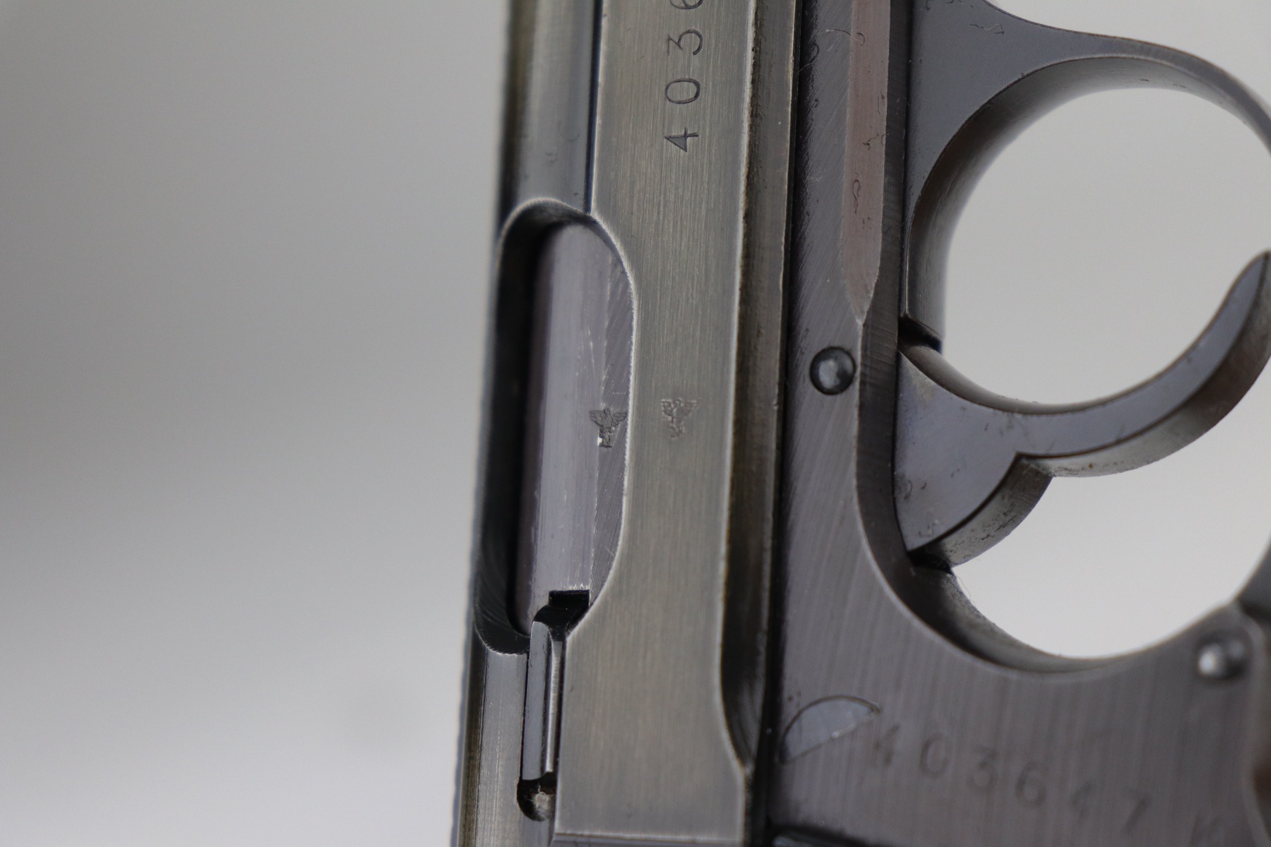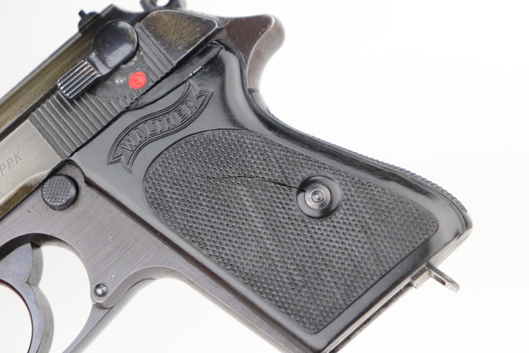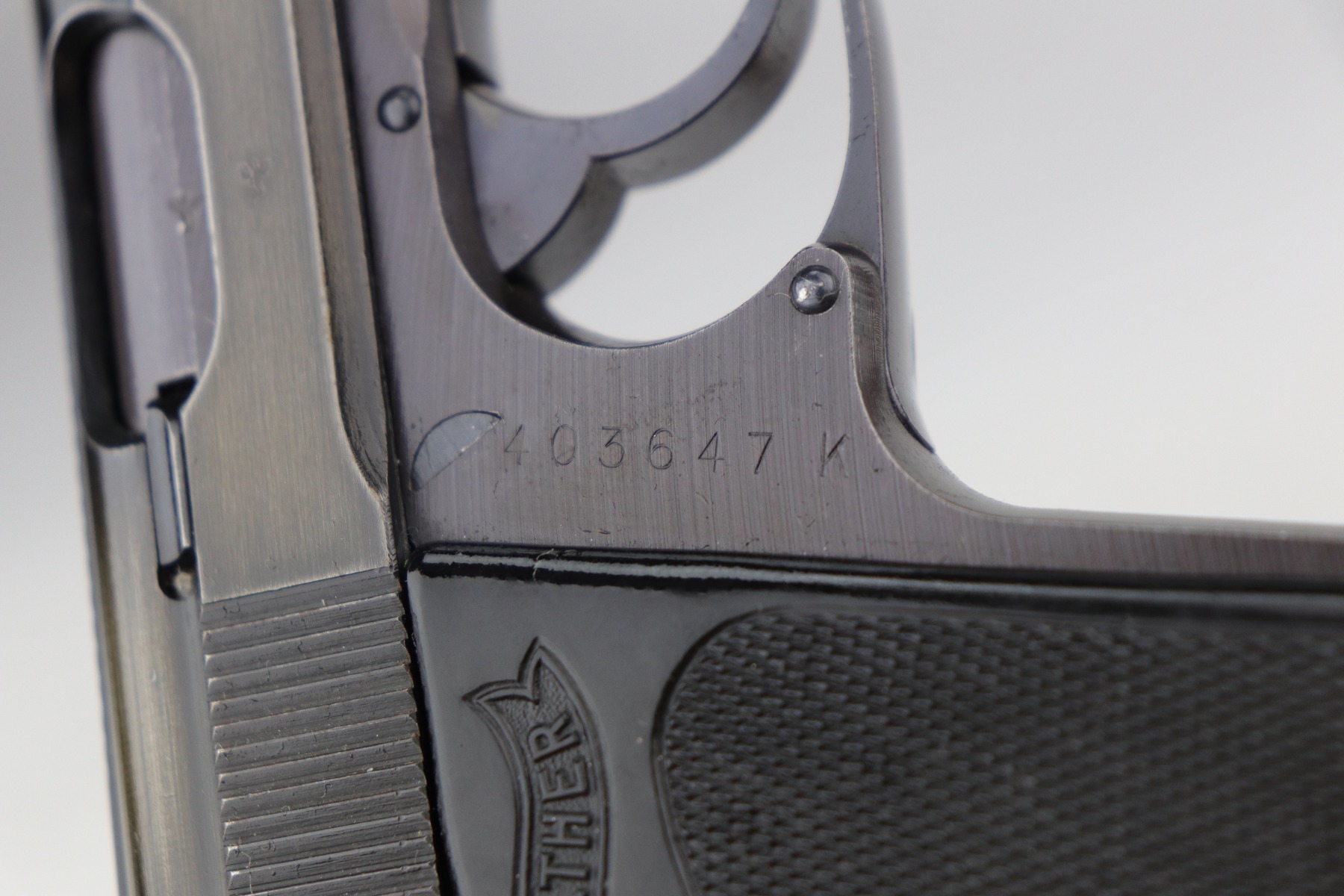 10/25/21 – This is a rare and highly requested SS contract Walther PPK from 1943 with its original, matching magazine. This particular pistol is a 5th variation example, and is also featured/pictured in our SS Contract Walther PP/PPK book on page 76. The pistol is all matching and original, with most of the thinning/patina on the slide. The finish on this one is somewhat difficult to rate but it’s dulled throughout on the slide. Bore is excellent and shiny. Original wartime magazine which is matching numbered to the pistol on the baseplate. Original and correct black plastic grip that does have a crack on the left side.