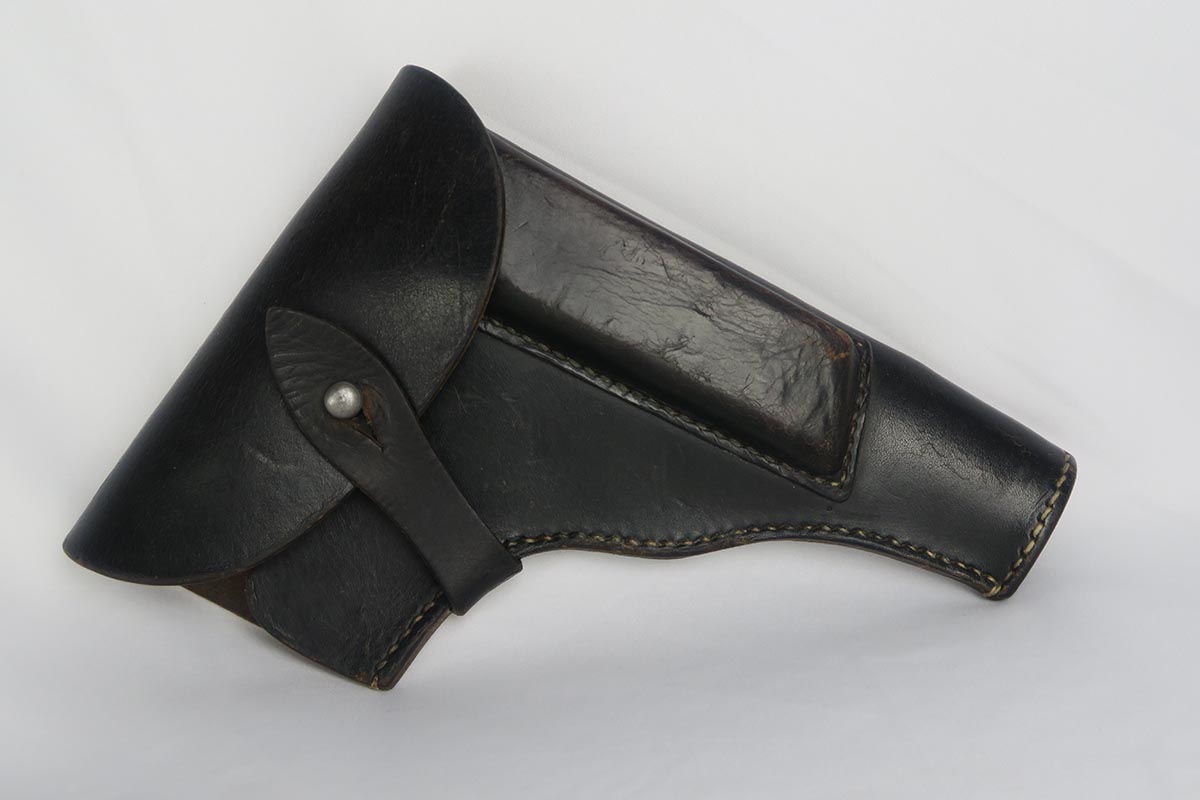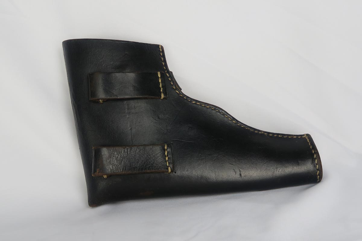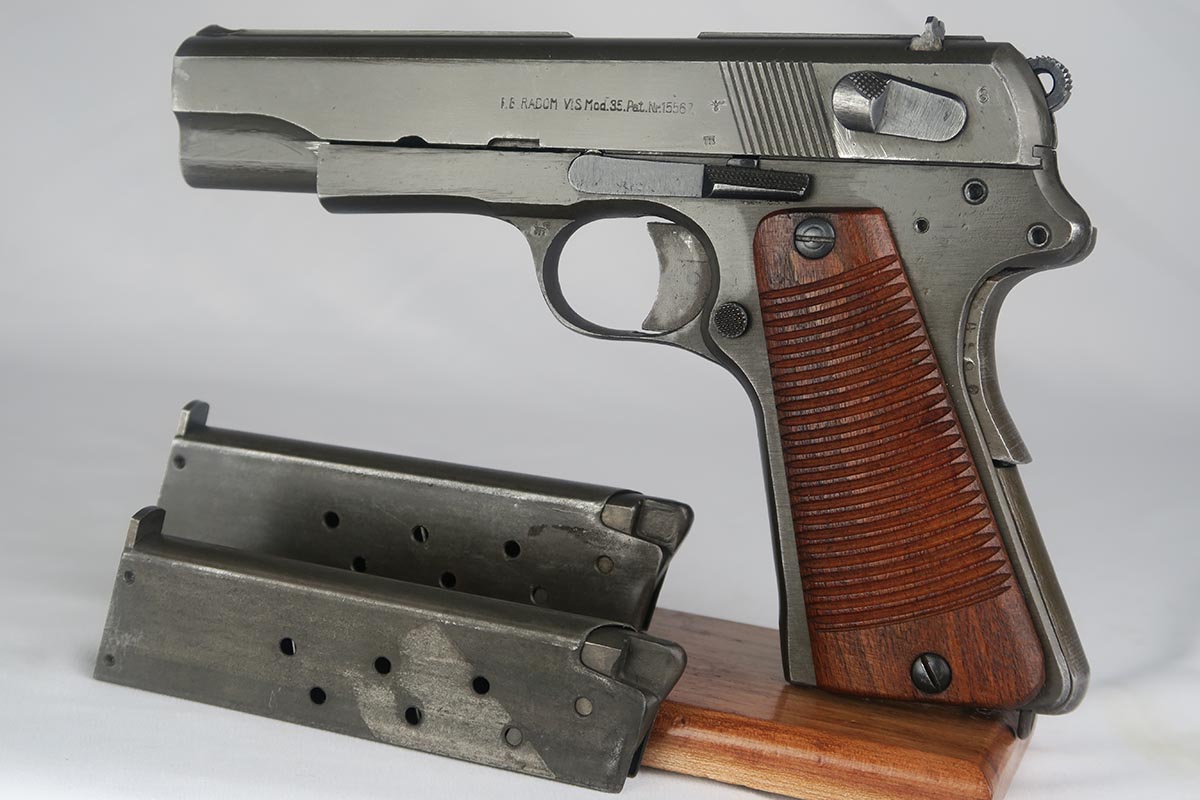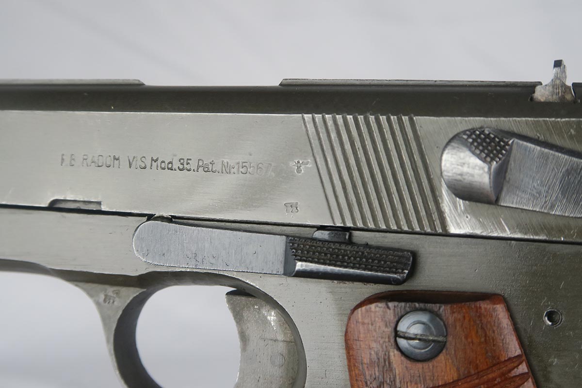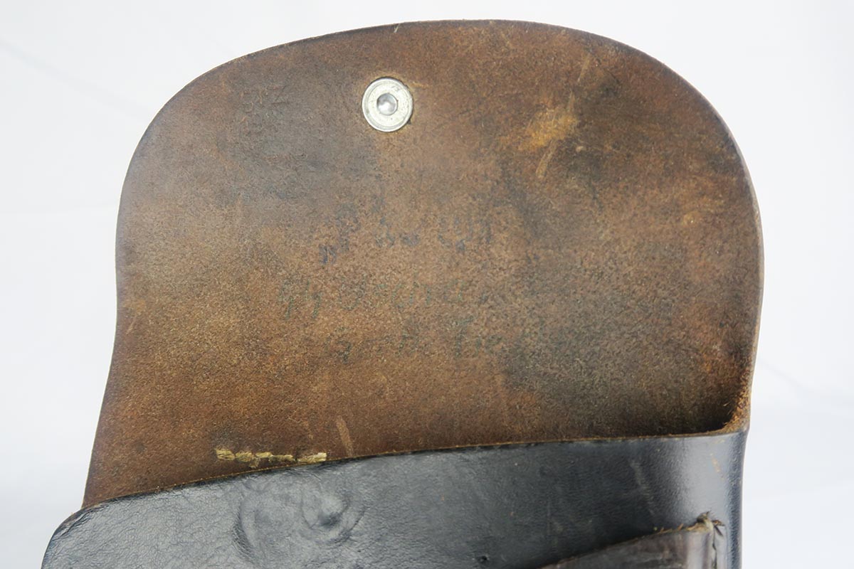 9/15/17 – This is a rare and unique offering: we have a late WW2 production phosphate Radom P.35 in beautiful condition, complete with a named SS Radom holster, uniform belt, and SS buckle. The story behind this one is that the veteran obtained this in Czechoslovakia after returning home from WW2. Like most bring-back stories, the soldier claimed to have pulled this off a dead SS Officer. This story though has believable evidence due to the faint ink writing within the Radom holster. The ink is old and faded, clearly original. We read “SS Uscha” on the first line which is an abbreviation for the German rank equivalent to Seargent. The next line we read “Gerh.” which we believe is an abbreviated first name, followed by a last name of this SS officer. This to us is concrete evidence that the holster was carried by an SS officer. The holster is also waffen proofed and 1942 dated on the interior leather. The gun, as previously mentioned, is late war phosphated – and one of the nicest examples we’ve ever seen! The finish only has minor wear near the muzzle, front strap, and back strap. The grips are original and excellent. A very minty piece with a mint bore to boot! Also, we note that there are two very rare waffen eagle/623 proofed magazines included. These are the rarest of Radom magazines. The belt is black leather and unmarked, while the buckle is RZM stamped “RZM 36/40” with SS within two circles after. Guaranteed all original and authentic. The story doesn’t come with any paperwork, only with what’s shown in photos!