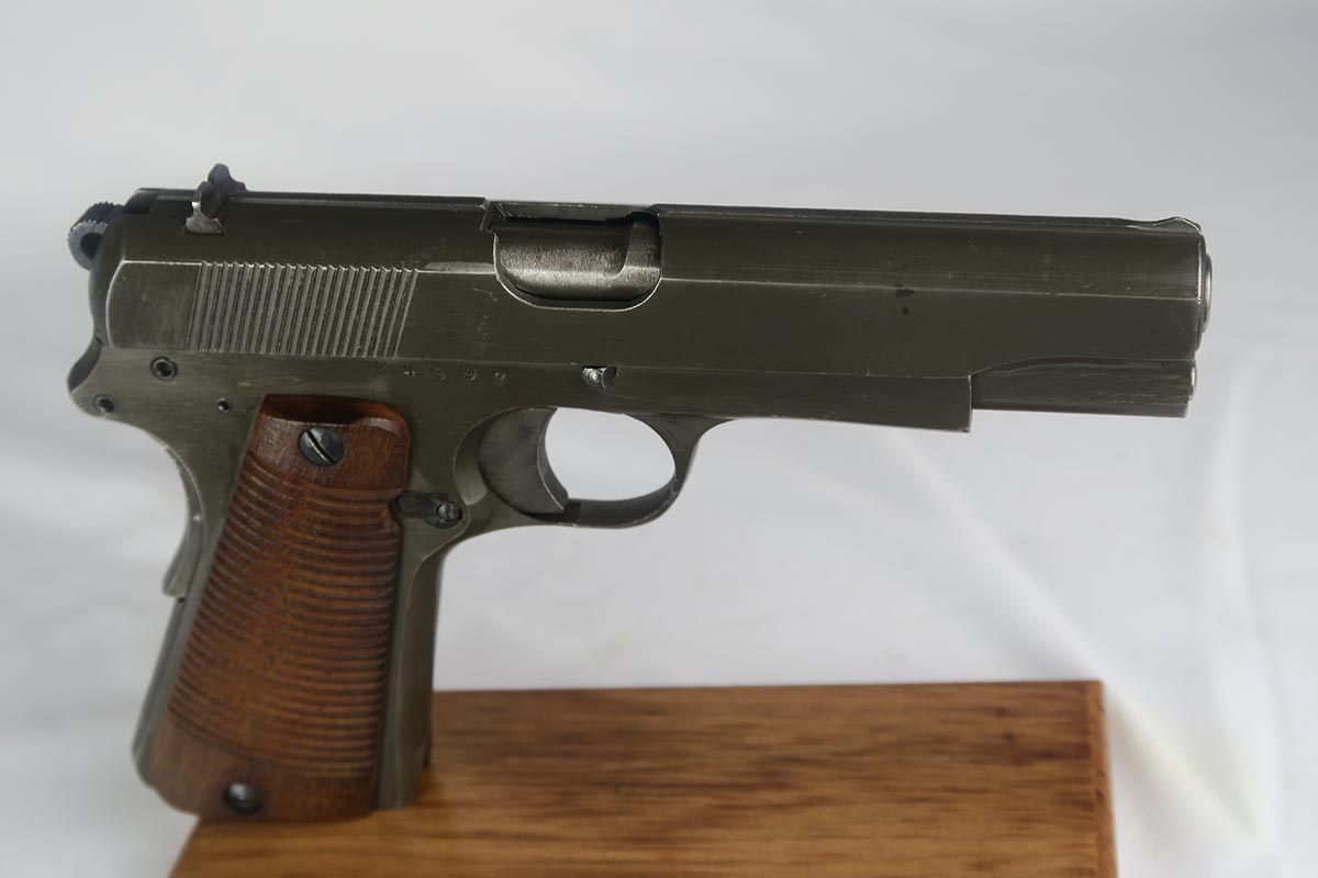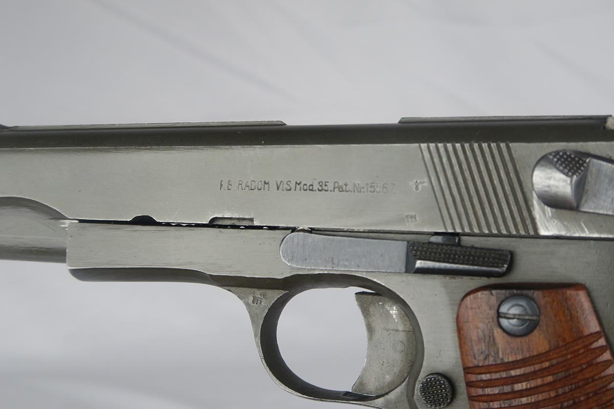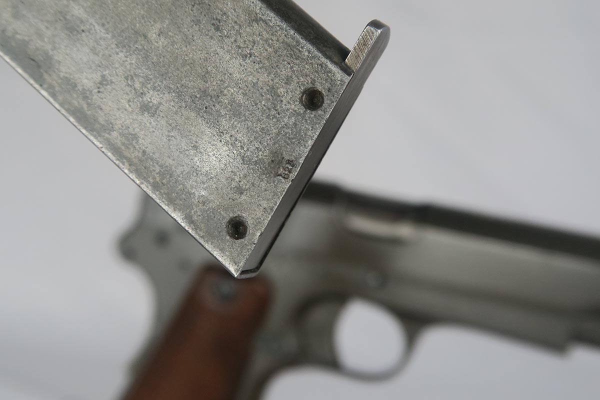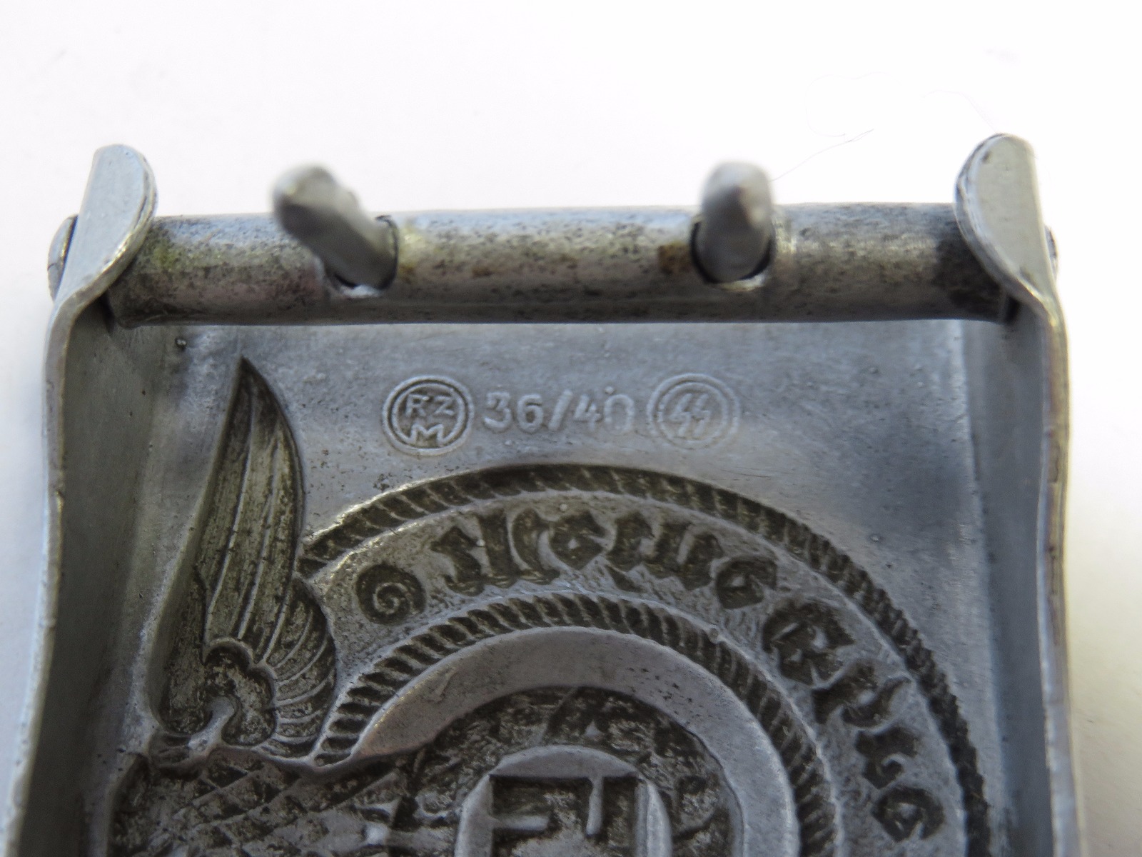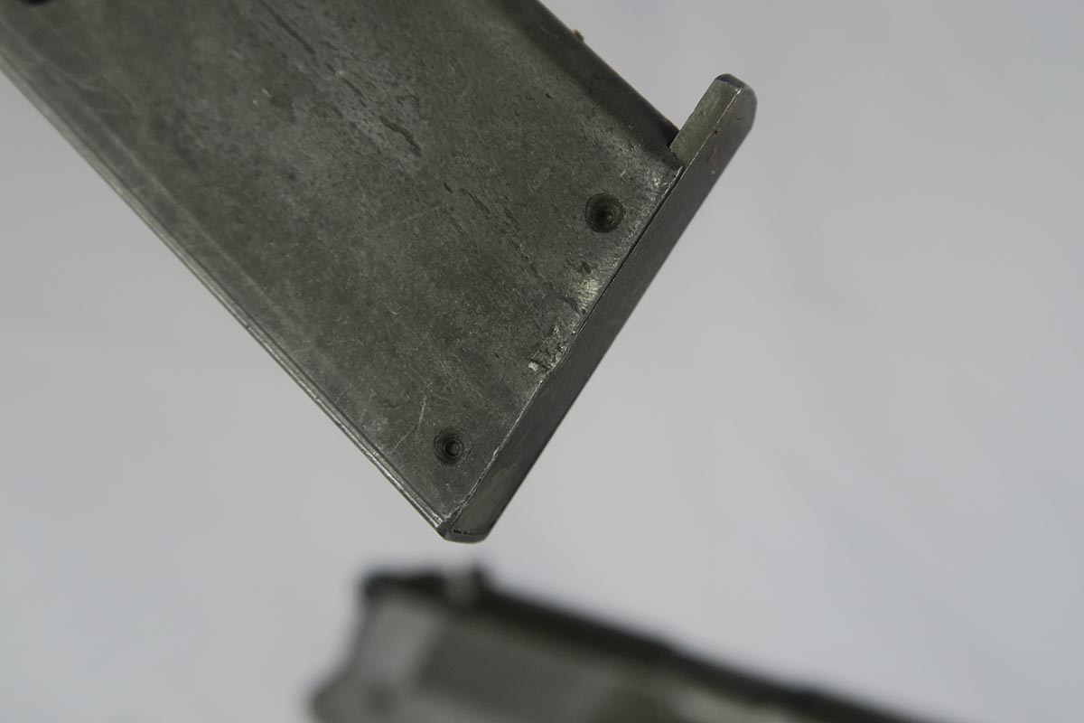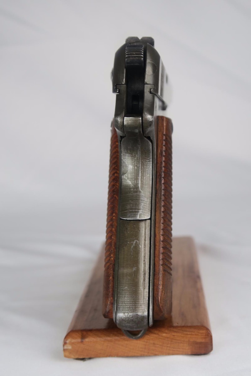 9/15/17 – This is a rare and unique offering: we have a late WW2 production phosphate Radom P.35 in beautiful condition, complete with a named SS Radom holster, uniform belt, and SS buckle. The story behind this one is that the veteran obtained this in Czechoslovakia after returning home from WW2. Like most bring-back stories, the soldier claimed to have pulled this off a dead SS Officer. This story though has believable evidence due to the faint ink writing within the Radom holster. The ink is old and faded, clearly original. We read “SS Uscha” on the first line which is an abbreviation for the German rank equivalent to Seargent. The next line we read “Gerh.” which we believe is an abbreviated first name, followed by a last name of this SS officer. This to us is concrete evidence that the holster was carried by an SS officer. The holster is also waffen proofed and 1942 dated on the interior leather. The gun, as previously mentioned, is late war phosphated – and one of the nicest examples we’ve ever seen! The finish only has minor wear near the muzzle, front strap, and back strap. The grips are original and excellent. A very minty piece with a mint bore to boot! Also, we note that there are two very rare waffen eagle/623 proofed magazines included. These are the rarest of Radom magazines. The belt is black leather and unmarked, while the buckle is RZM stamped “RZM 36/40” with SS within two circles after. Guaranteed all original and authentic. The story doesn’t come with any paperwork, only with what’s shown in photos!