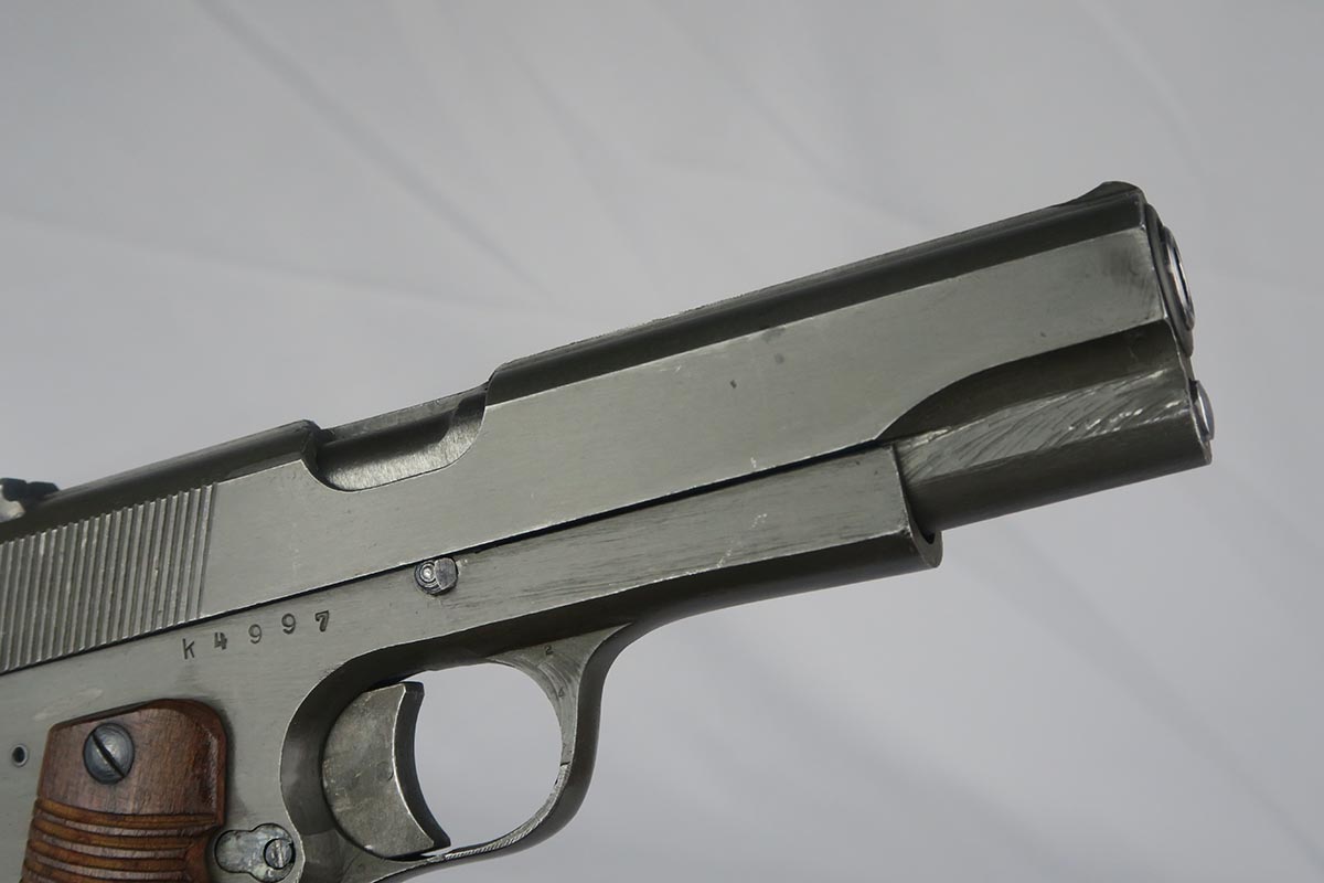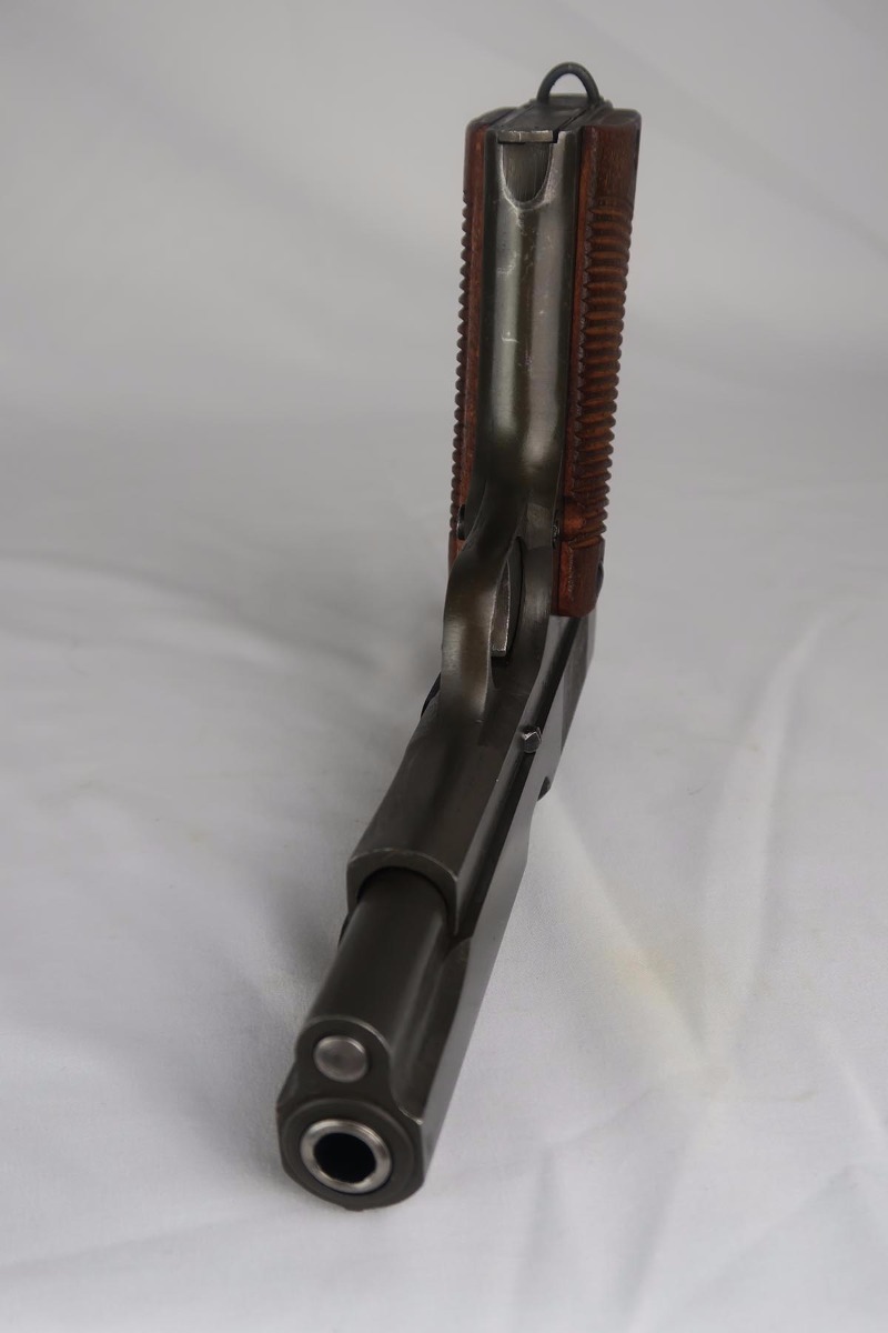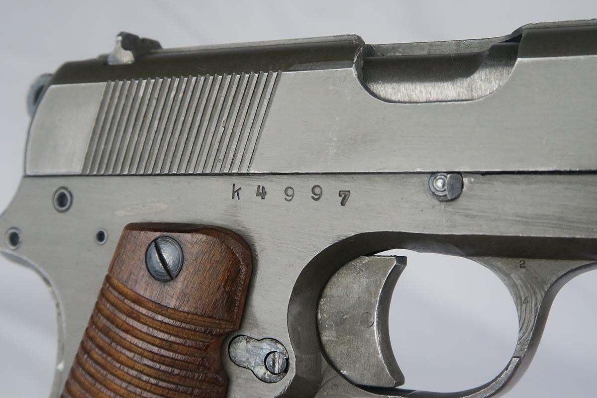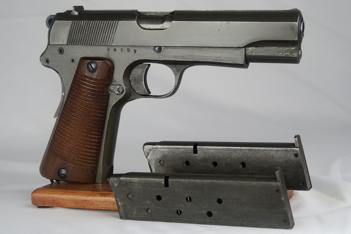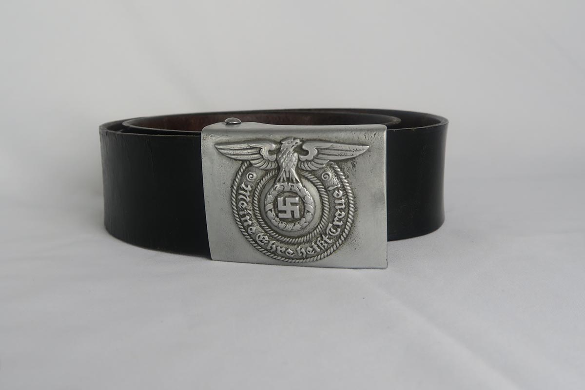 9/15/17 – This is a rare and unique offering: we have a late WW2 production phosphate Radom P.35 in beautiful condition, complete with a named SS Radom holster, uniform belt, and SS buckle. The story behind this one is that the veteran obtained this in Czechoslovakia after returning home from WW2. Like most bring-back stories, the soldier claimed to have pulled this off a dead SS Officer. This story though has believable evidence due to the faint ink writing within the Radom holster. The ink is old and faded, clearly original. We read “SS Uscha” on the first line which is an abbreviation for the German rank equivalent to Seargent. The next line we read “Gerh.” which we believe is an abbreviated first name, followed by a last name of this SS officer. This to us is concrete evidence that the holster was carried by an SS officer. The holster is also waffen proofed and 1942 dated on the interior leather. The gun, as previously mentioned, is late war phosphated – and one of the nicest examples we’ve ever seen! The finish only has minor wear near the muzzle, front strap, and back strap. The grips are original and excellent. A very minty piece with a mint bore to boot! Also, we note that there are two very rare waffen eagle/623 proofed magazines included. These are the rarest of Radom magazines. The belt is black leather and unmarked, while the buckle is RZM stamped “RZM 36/40” with SS within two circles after. Guaranteed all original and authentic. The story doesn’t come with any paperwork, only with what’s shown in photos!