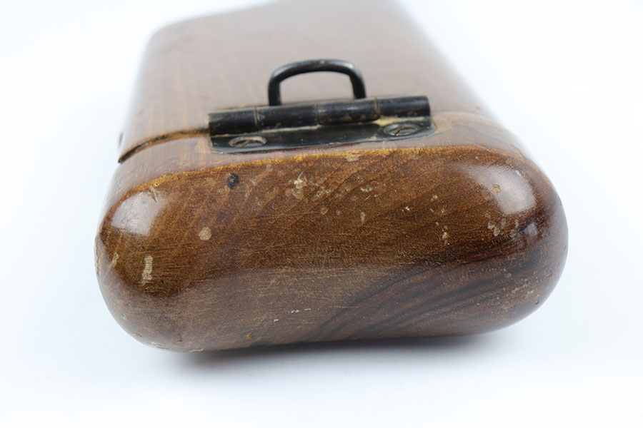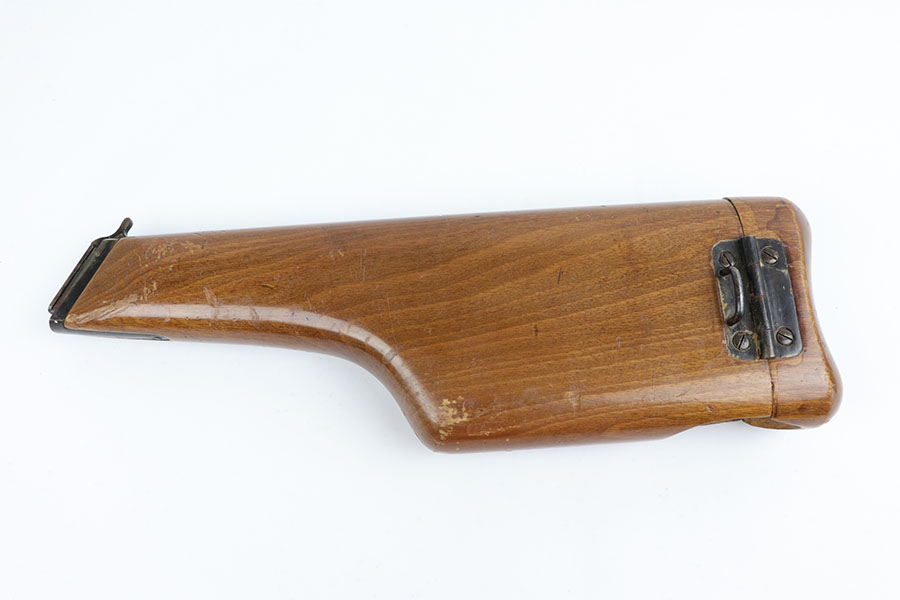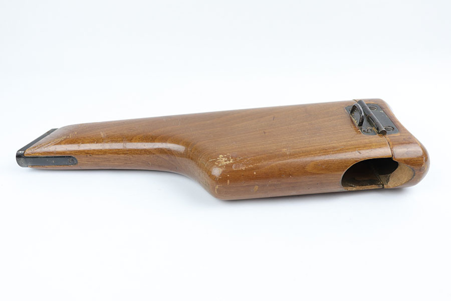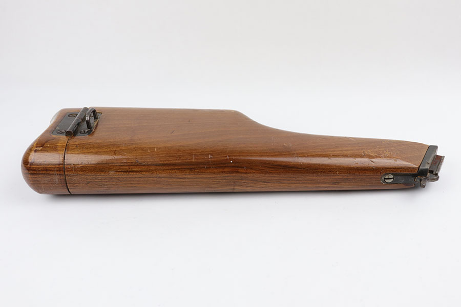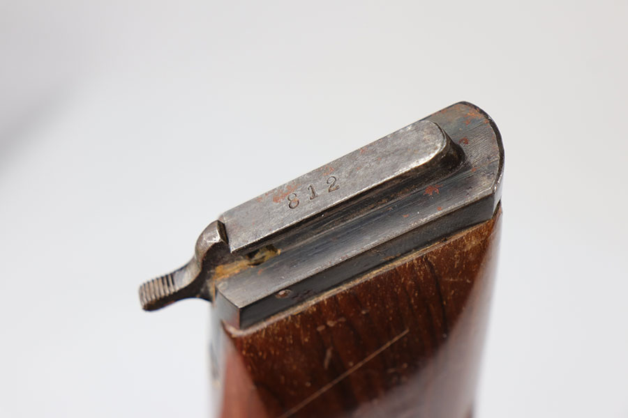 5/15/20 – This is an original and hard to find Star Model MB shoulder stock. We are not experts on this model of stock but we believe it to be fully original, though it seems to have been lightly lacquered. Several scuffs and scratches in the wood/lacquer but no major defects. Serial on the lug attachment is 812. Wood is number 201 on both the inner lips of the wood. Little bit of surface rust on the lug attachment but overall the stock is in good shape. Attaches to and fits perfectly a Star Model MB, and we have photos included with the listing that can show the fit.