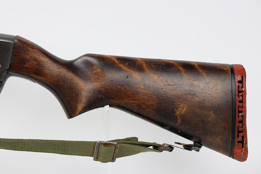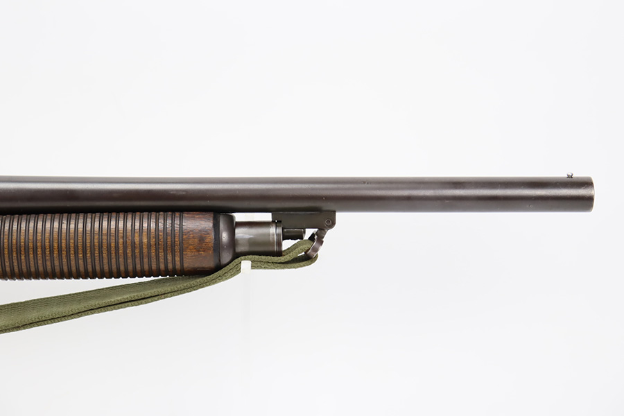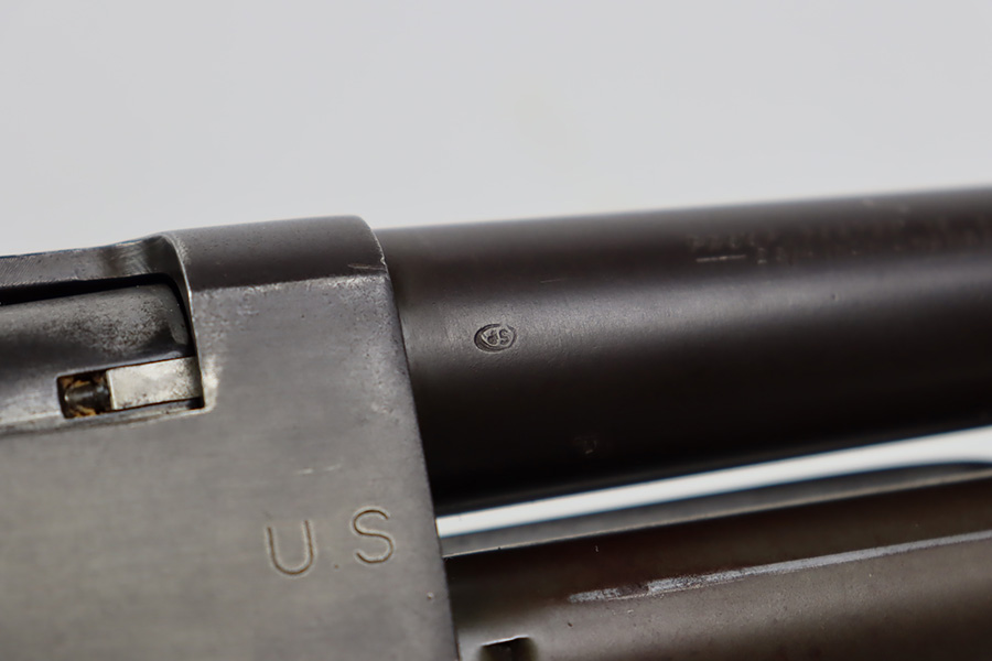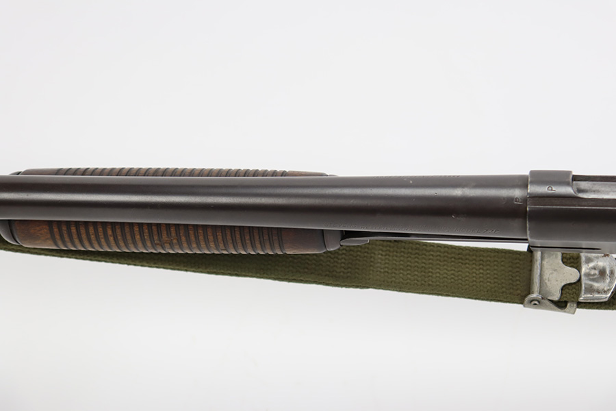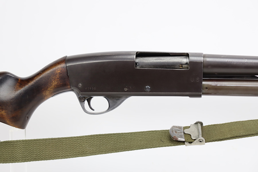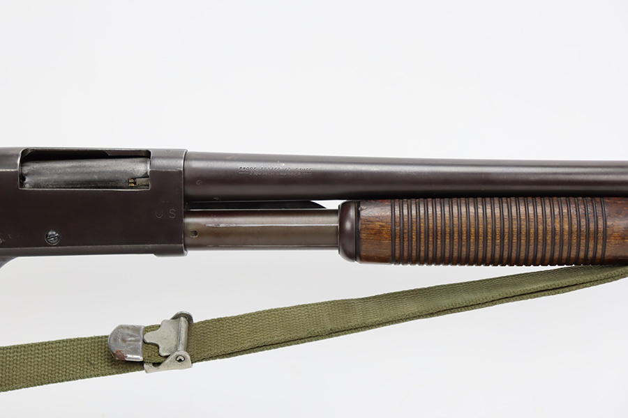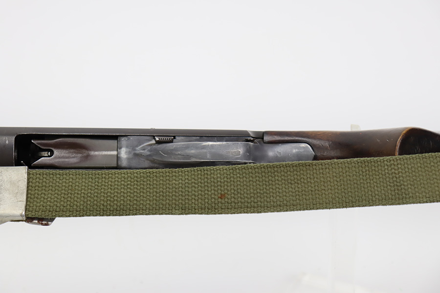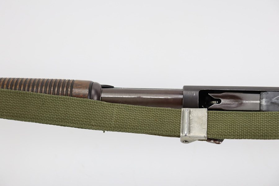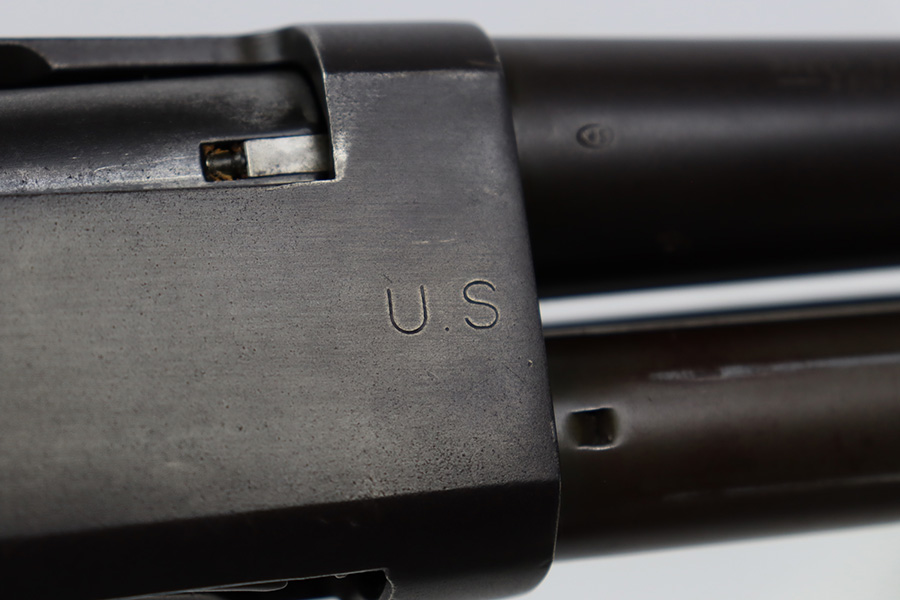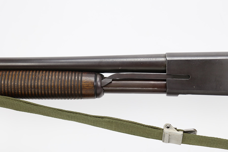10/2/23 – This is a scarce example of a U.S. marked Stevens Savage Model 77E riot shotgun, manufactured in the 1960’s. Beginning in 1963, the U.S. government purchased a total of 69,097 Model 77E riot shotguns from the Savage Arms Corporation for issue to the South Vietnamese Army; however, they were also widely used by U.S. Army and Marine units in Vietnam. Records indicate that 65,724 of the 69,097 Model 77E shotguns purchased under government contract were issued to the Republic of Vietnam or other allied forces. As a result, very few Model 77E shotguns returned from Vietnam, with estimates at only a few thousand. They have a shorter stock than other U.S. military shotguns as they were modified to accommodate South Vietnamese soldiers. Military models are parkerized with sling swivels and wooden stocks. The right side of the receiver is ‘U.S.’ marked, and ‘P’ proofs are present on barrel and receiver. The metal parts on this one have retained about 90% of their finish. Minor wear around the muzzle and on the high edges in general. While there isn’t much actual finish loss, there is light brown patina visible under the finish throughout. Nice tiger wood stock – some minor dings and bruises. The rubber butt pad is dried and cracking. Excellent bore.