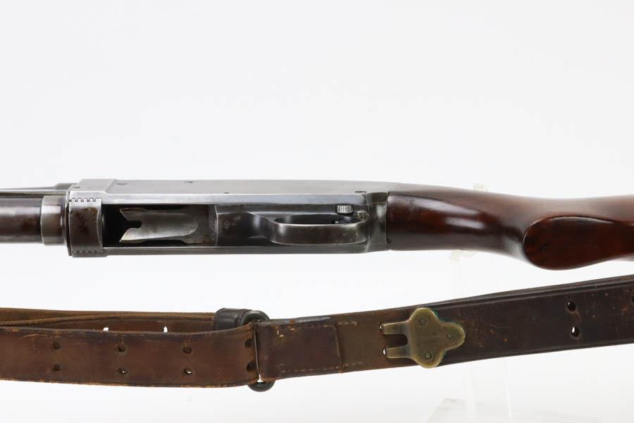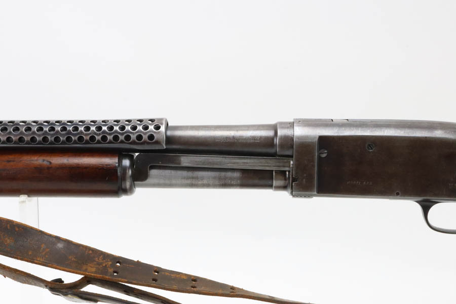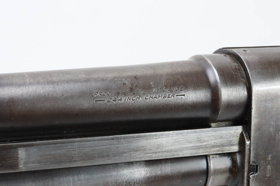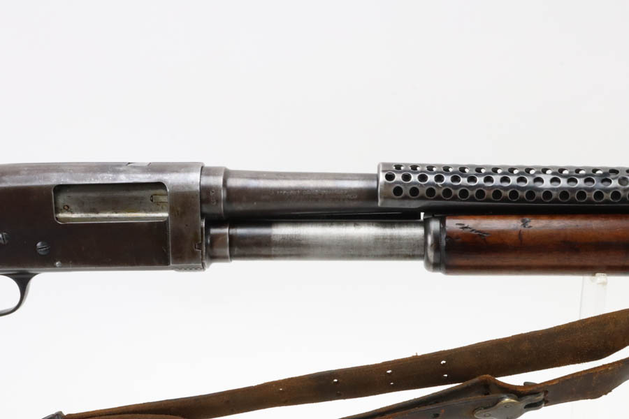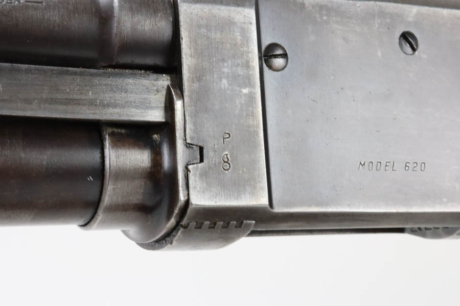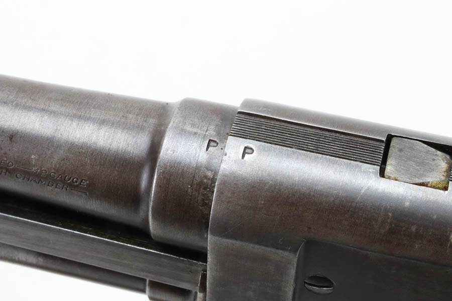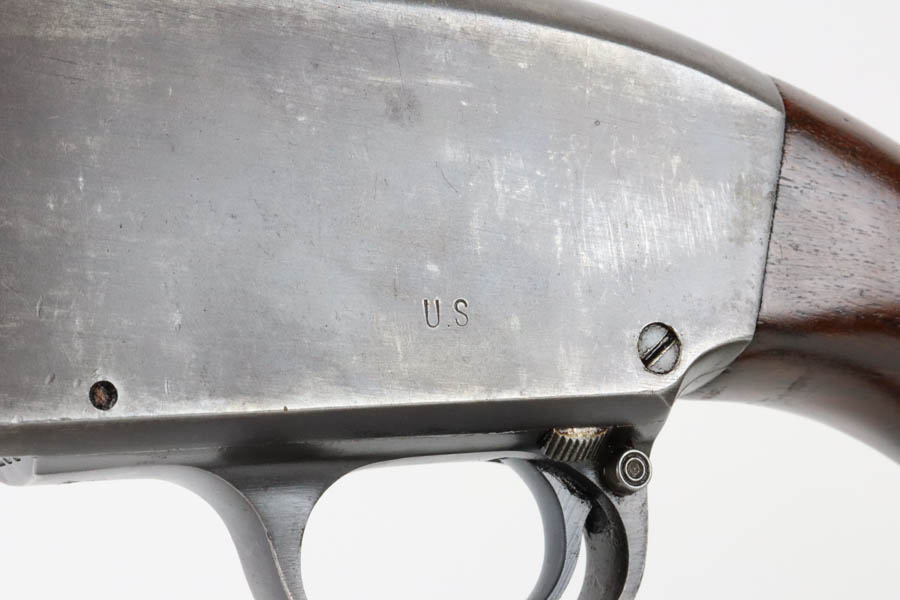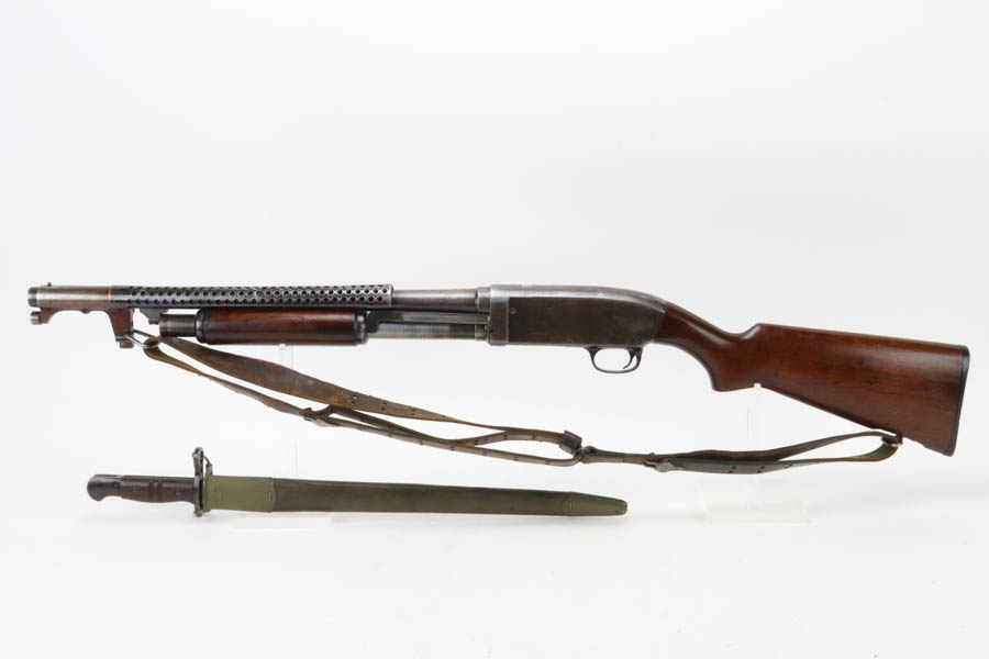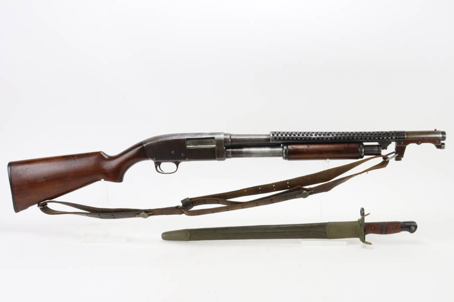 6/7/24 – This is a very rarely encountered Stevens Savage Model 620 trench shotgun, made as a part of US military procurement during WWII. Unlike its M520 counterpart, this was a hammerless model, very much like Winchester M12. It was produced in trench configuration in limited numbers and is very difficult for a collector to acquire. This particular gun is a textbook example, with all the correct military markings, original finish and all original parts including the bayonet lug and heat shield. Canfield reports that fewer than 10,000 military trench examples were ordered during WW2. This particular example is in good condition with but does have thinning to the finish on the receiver and heat shield throughout. Receiver and barrel both have the flaming bomb proofs, and the receiver is ‘U.S.’ marked. The wood parts are in great shape with minor handling wear. Excellent, shiny bore. Comes with a very nice Winchester bayonet with scabbard, though the Winchester proof is somewhat faded.